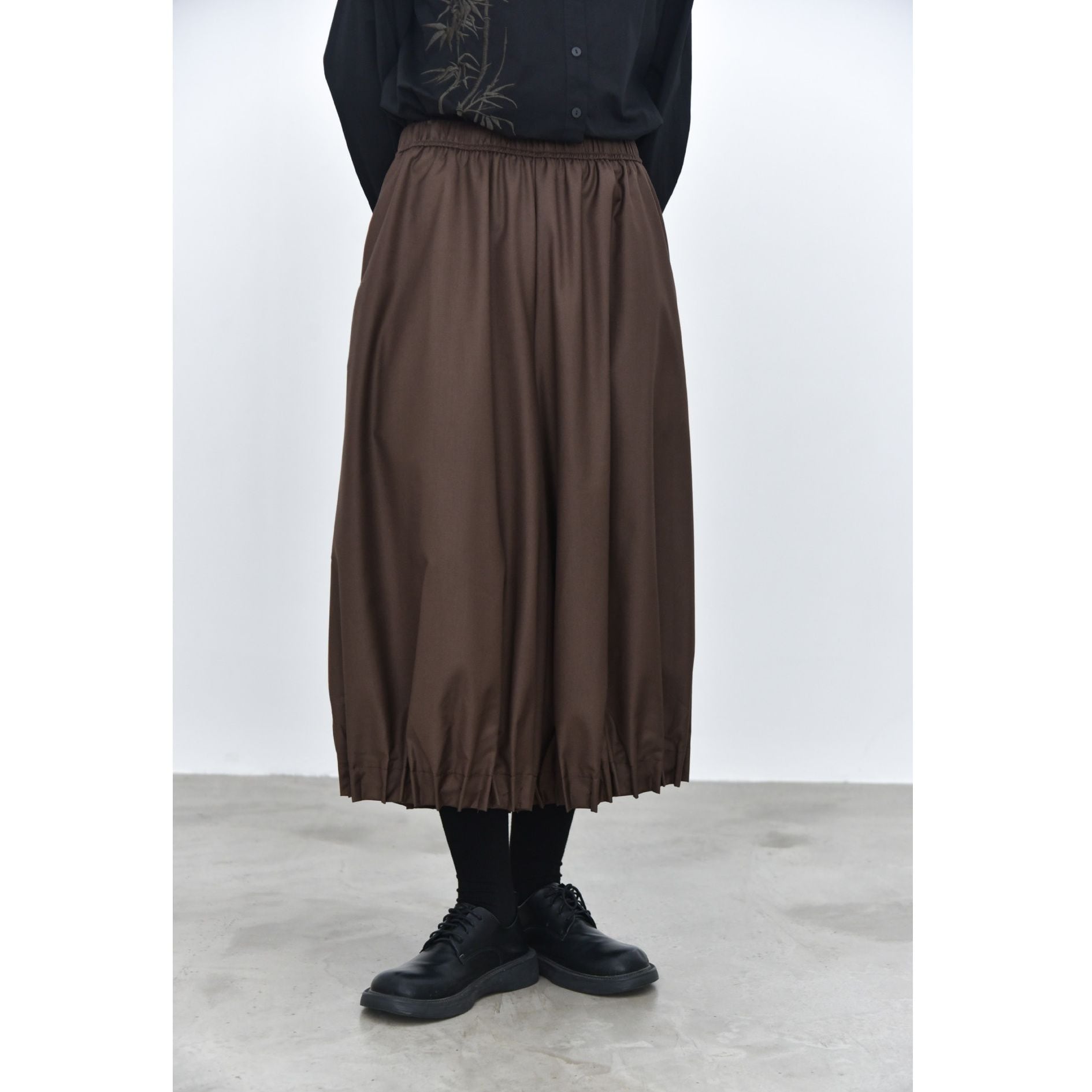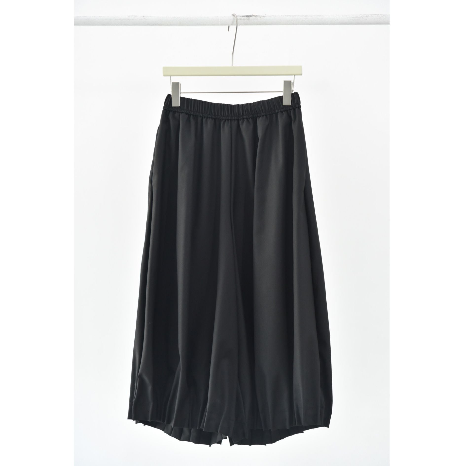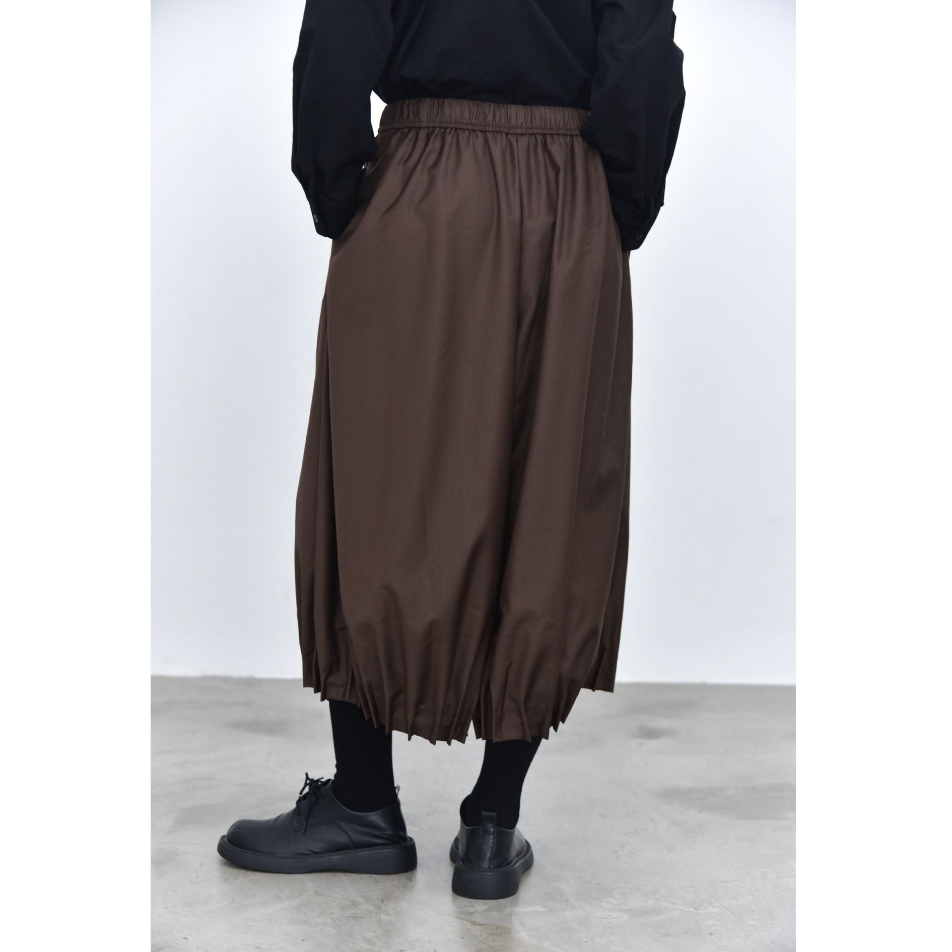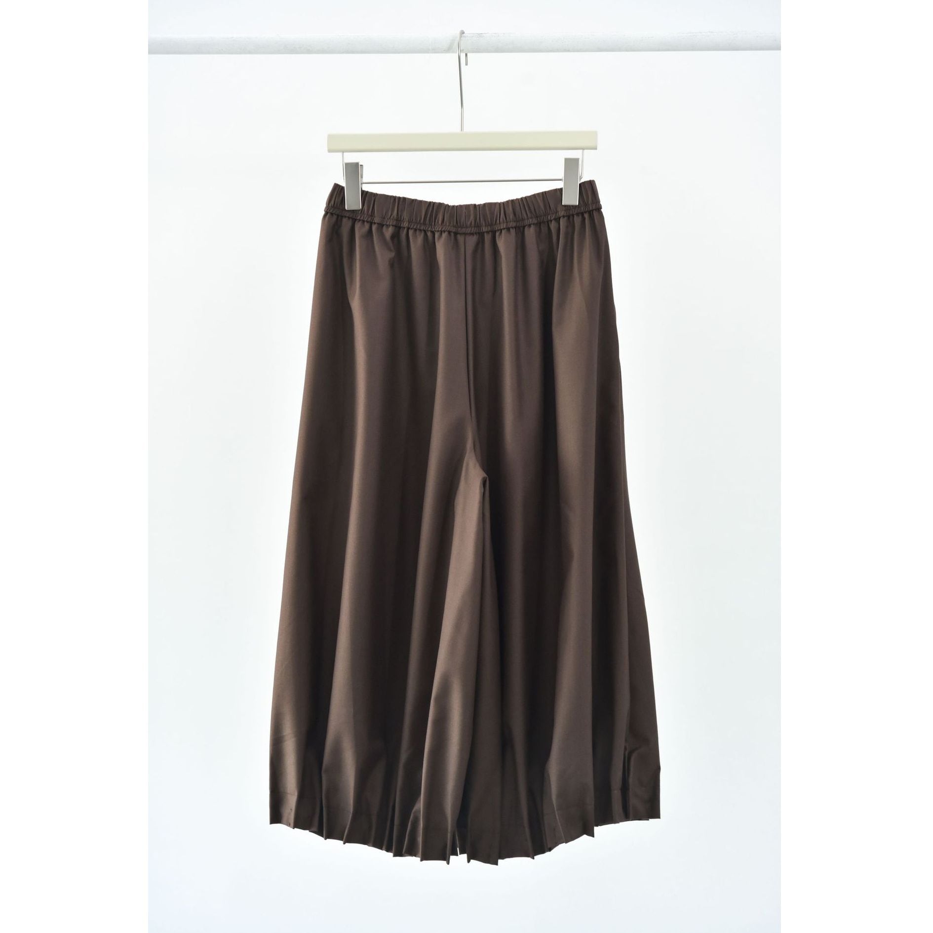 裾がプリーツ加工されたランタンのようなシルエットがお洒落な、ワイドレッグ・クロップドパンツです。ウエストはドローストリングで、履き心地が良いです。レッグラインをカバーする、オンでもオフでも使える着まわし力の高いアイテムです。色は3色から選べます。