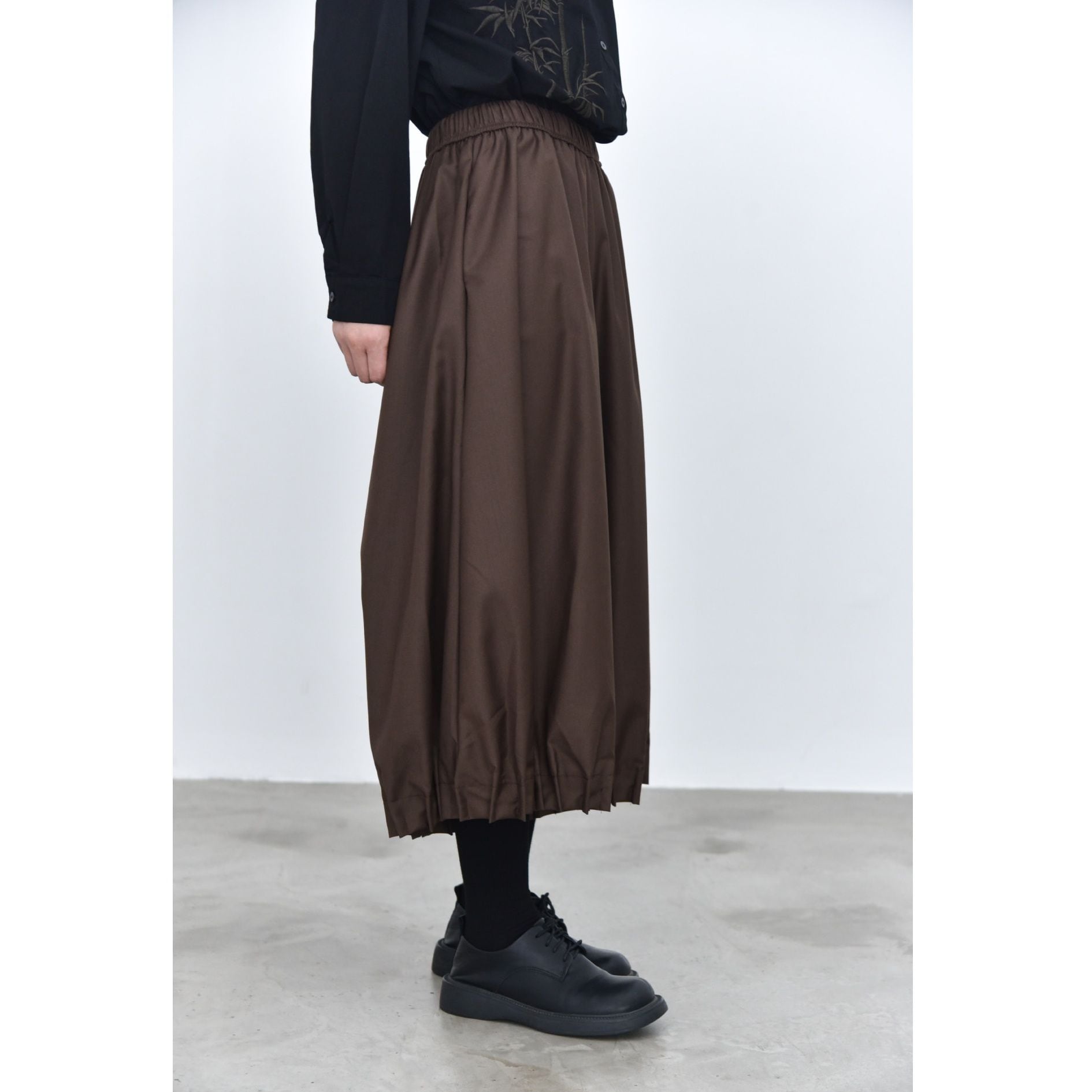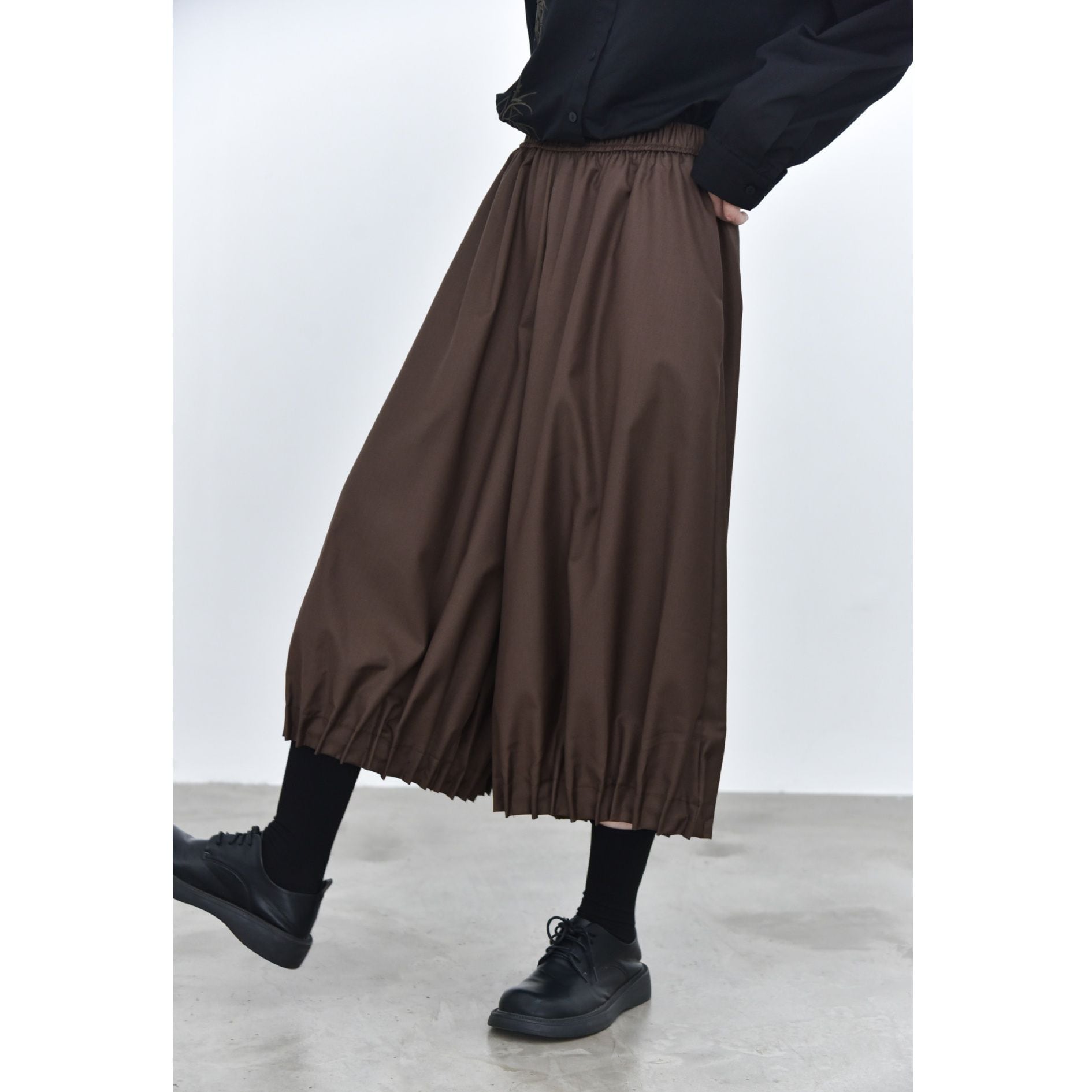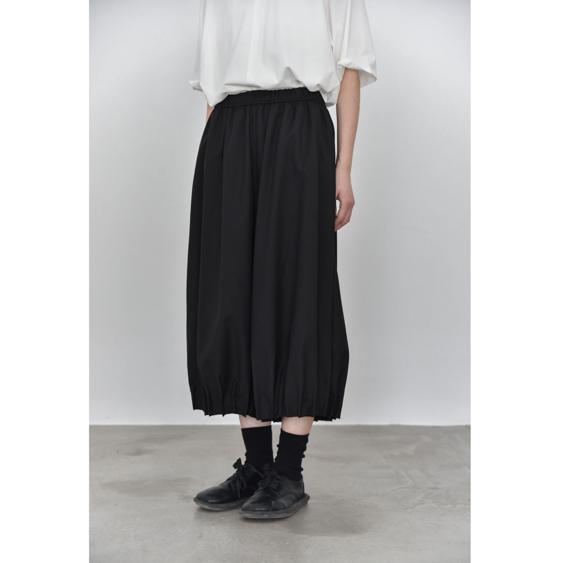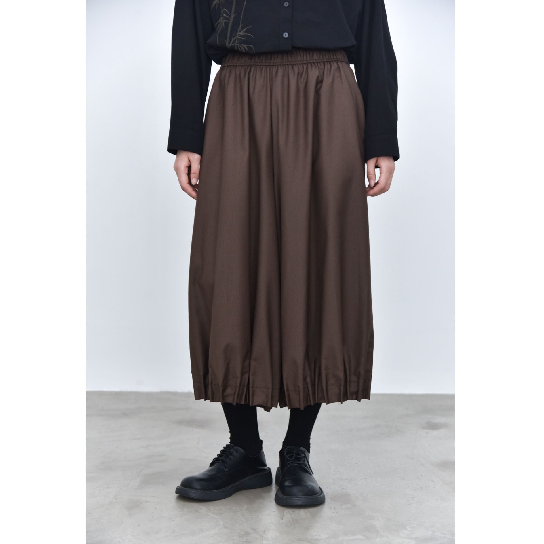裾がプリーツ加工されたランタンのようなシルエットがお洒落な、ワイドレッグ・クロップドパンツです。ウエストはドローストリングで、履き心地が良いです。レッグラインをカバーする、オンでもオフでも使える着まわし力の高いアイテムです。色は3色から選べます。