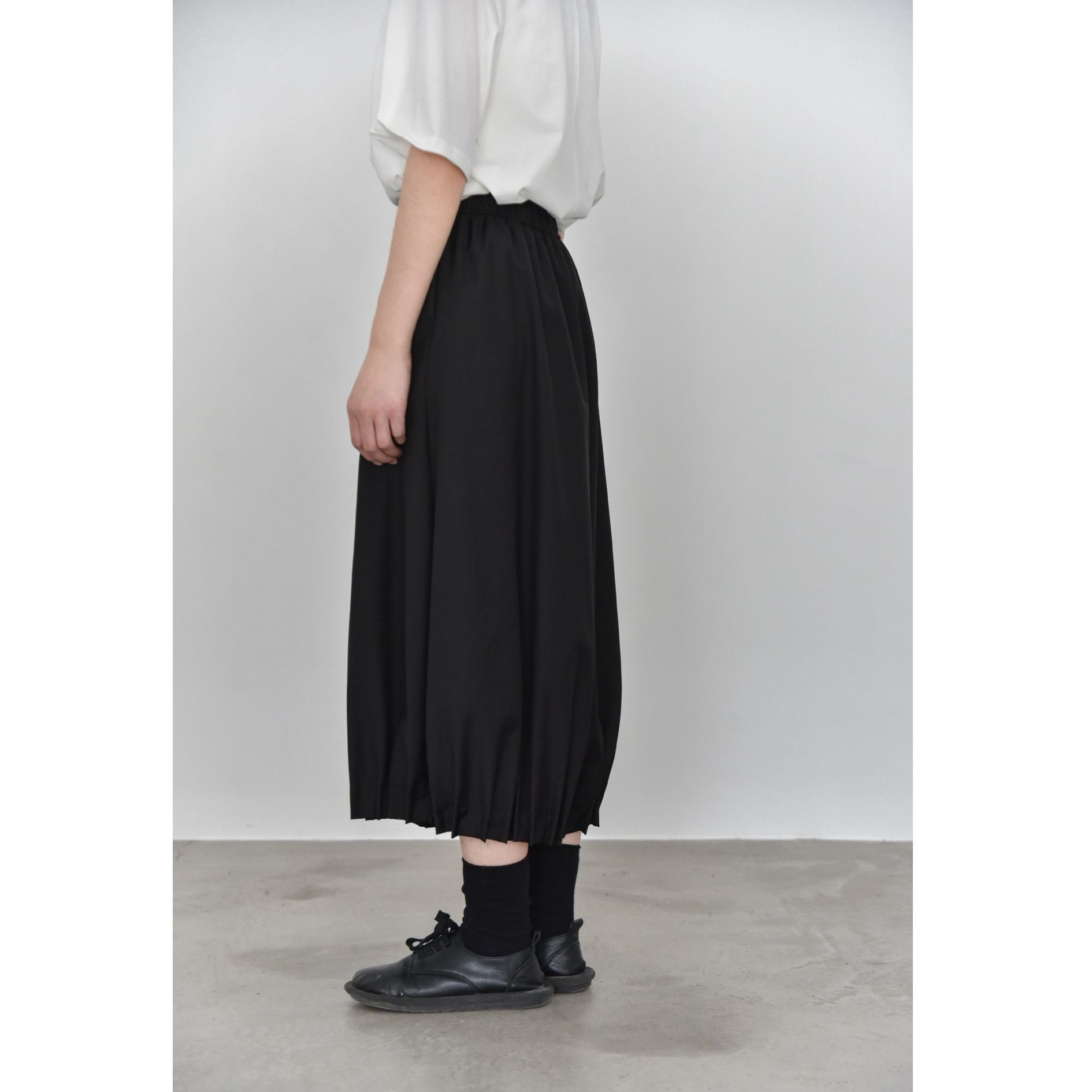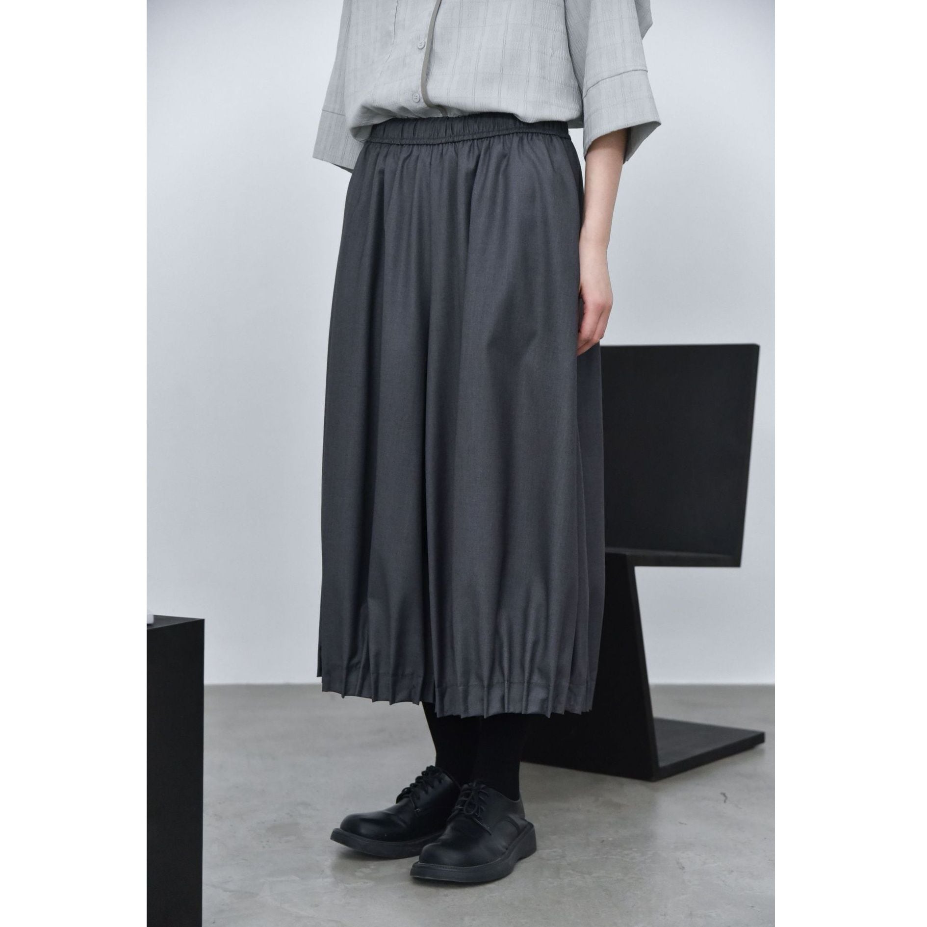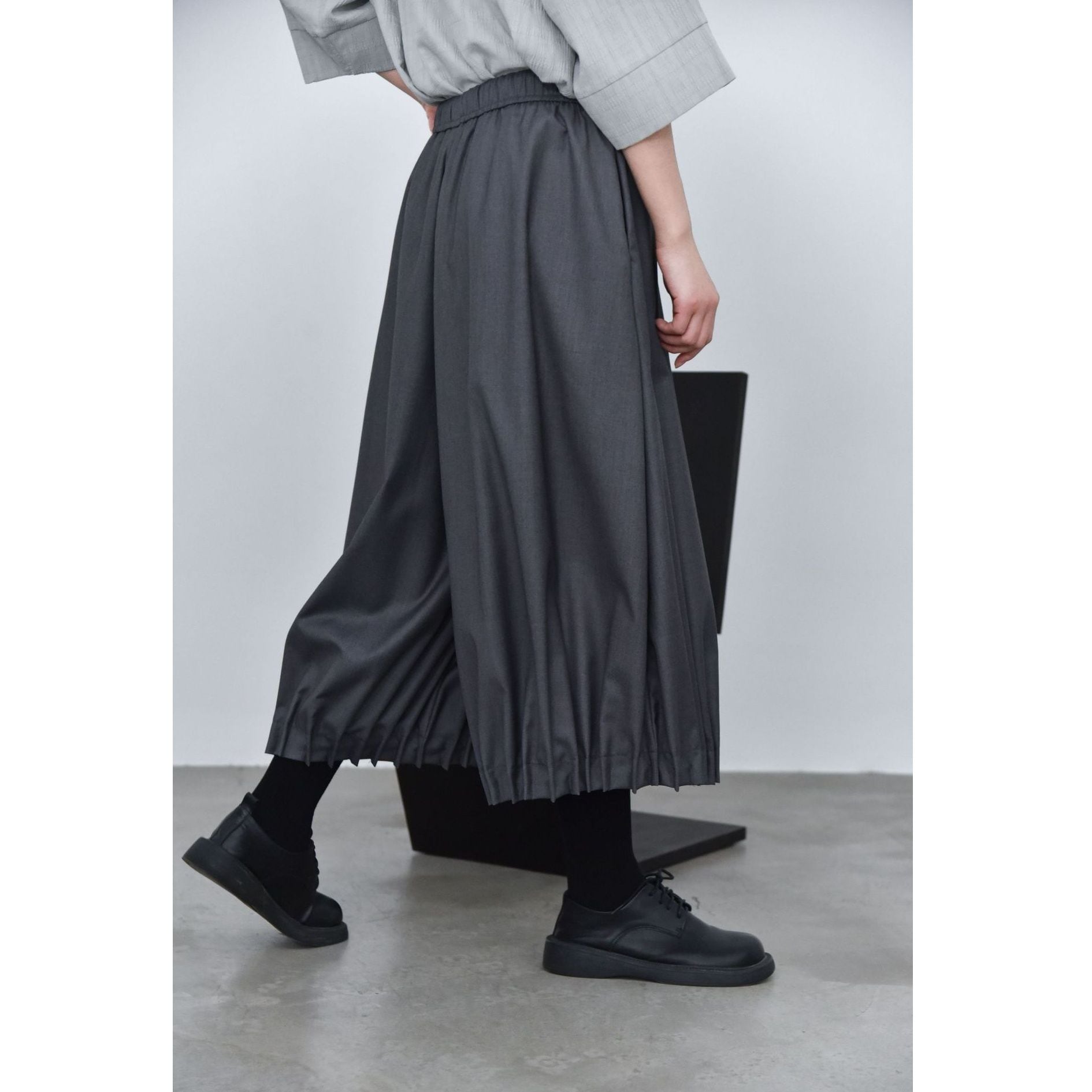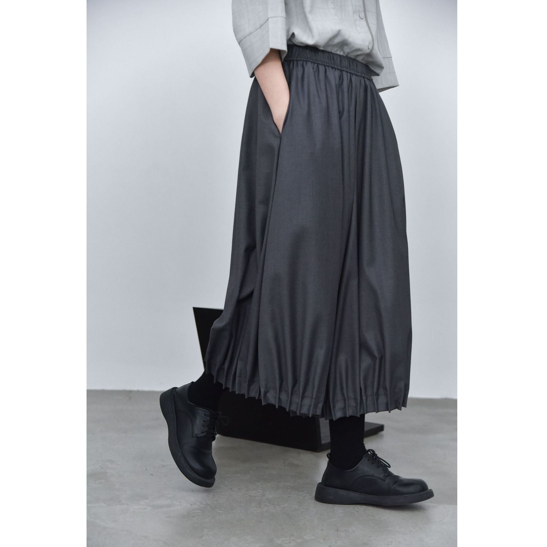 裾がプリーツ加工されたランタンのようなシルエットがお洒落な、ワイドレッグ・クロップドパンツです。ウエストはドローストリングで、履き心地が良いです。レッグラインをカバーする、オンでもオフでも使える着まわし力の高いアイテムです。色は3色から選べます。