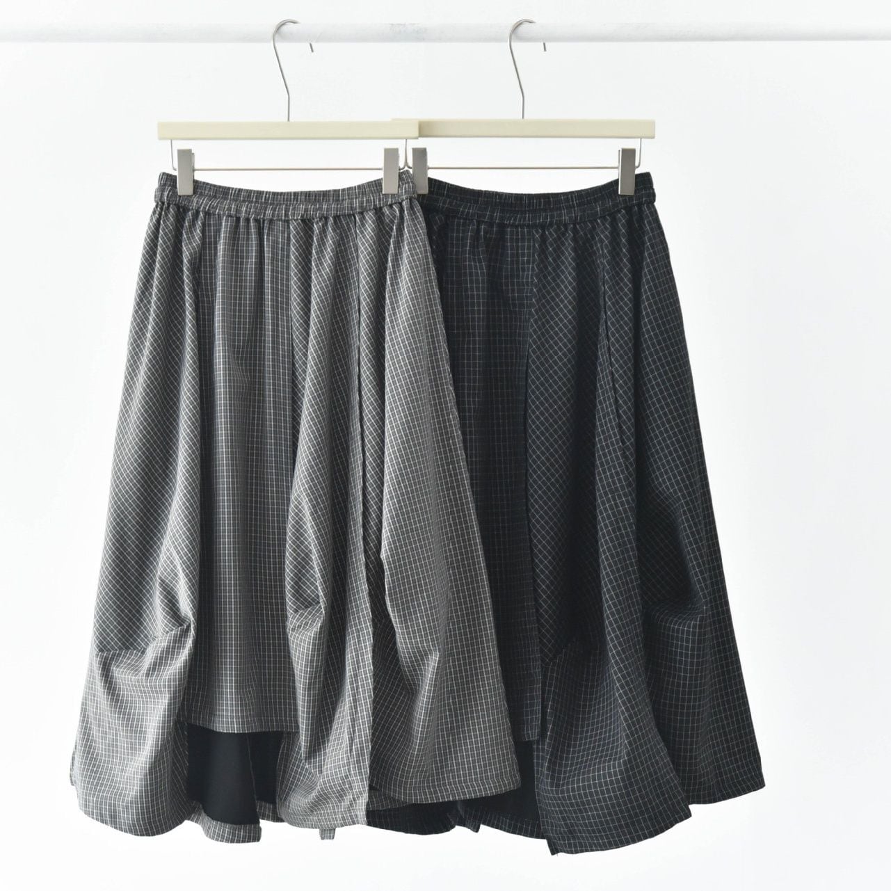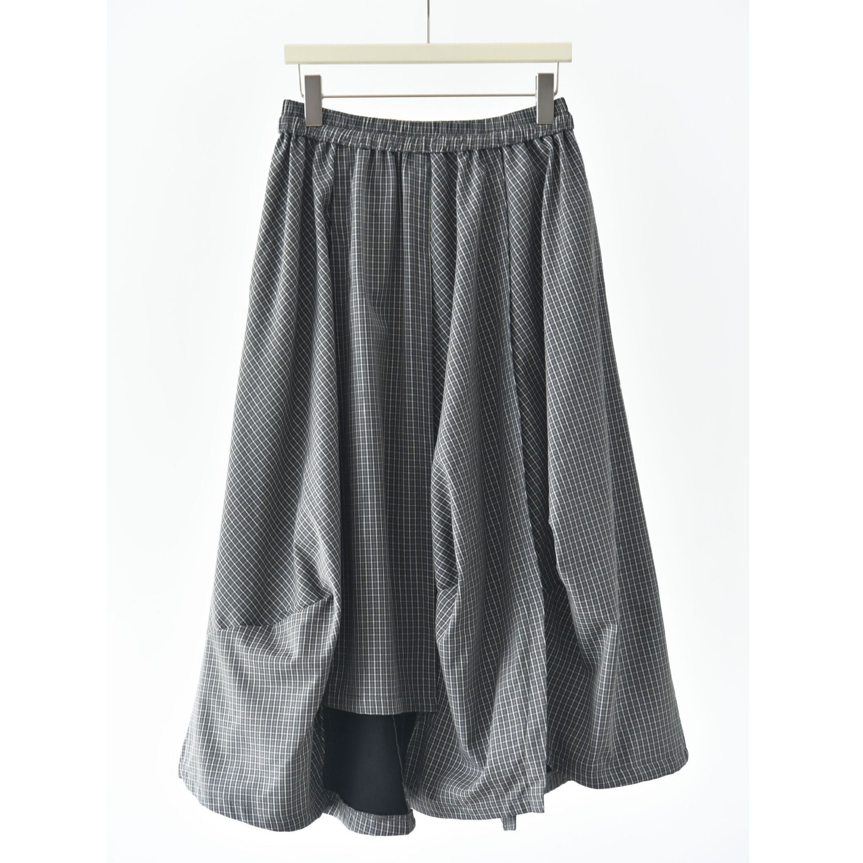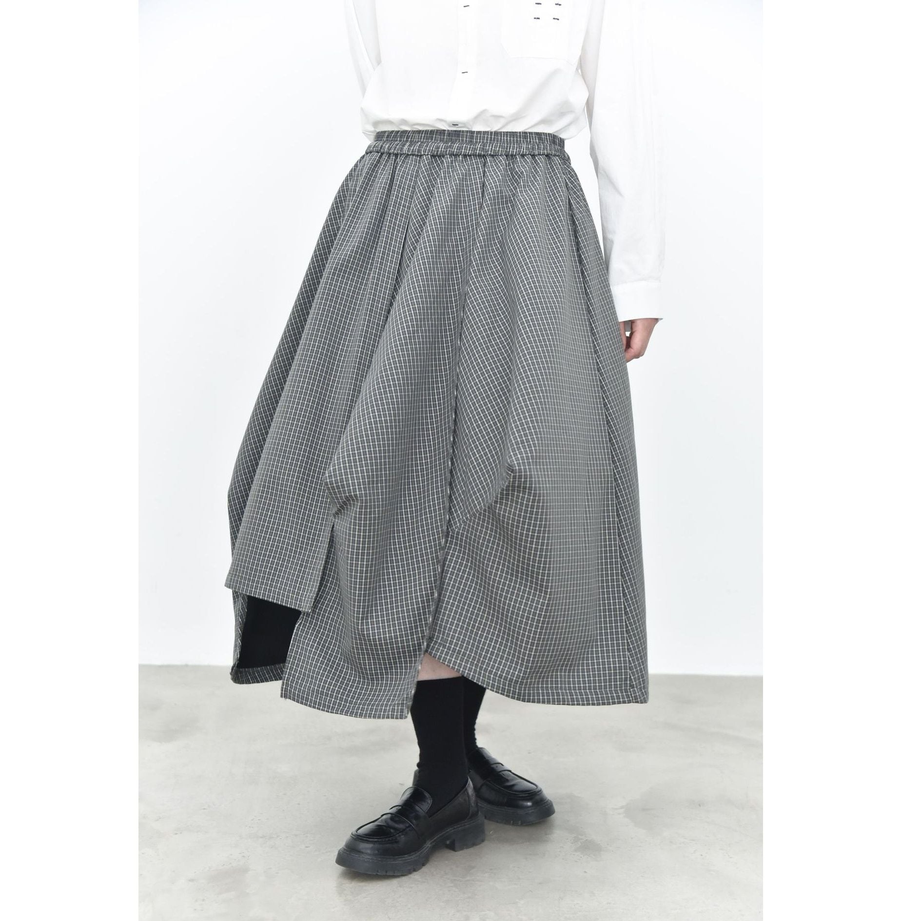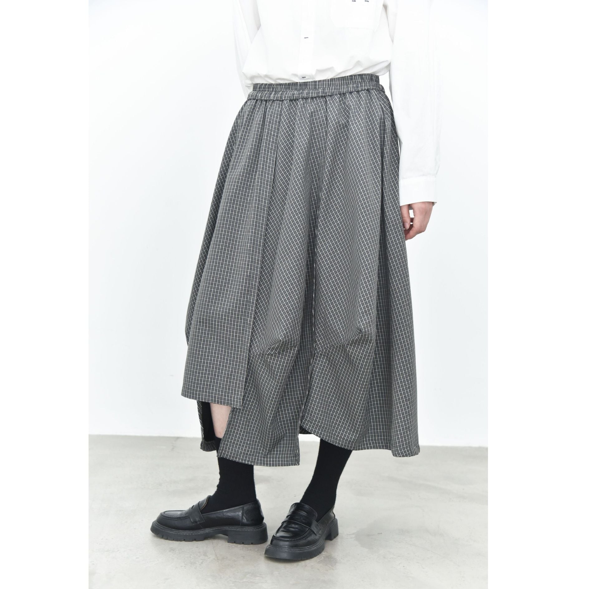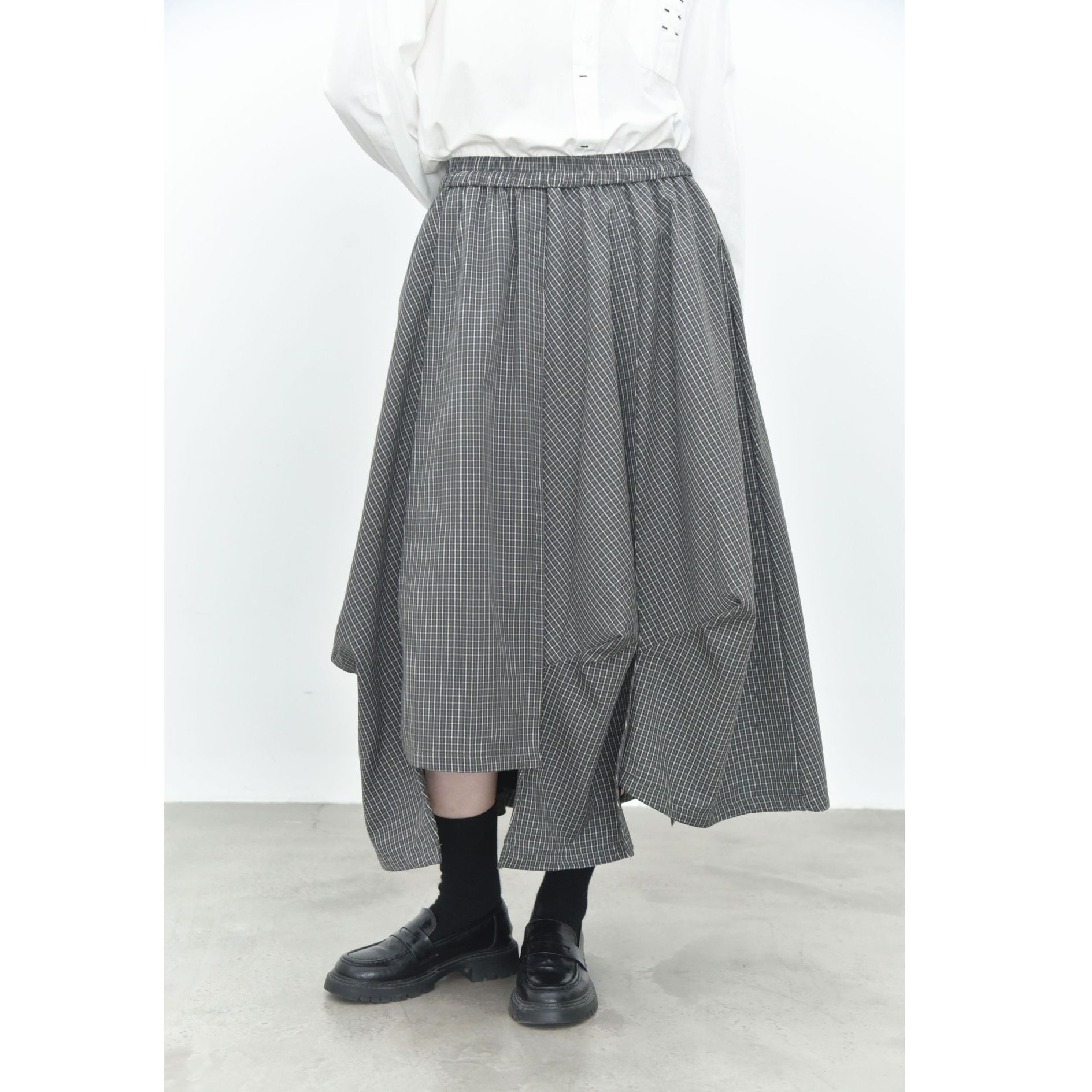 スティッチが作り出すいびつなAラインのシルエットがお洒落な、チェック柄素材でできたロング丈のデザインスカートです。ウエストはゴムなので、履き心地が良いです。ふんわりとしたシルエットがレッグラインをカバーする、モードな印象のアイテムです。色は2色から選べます。