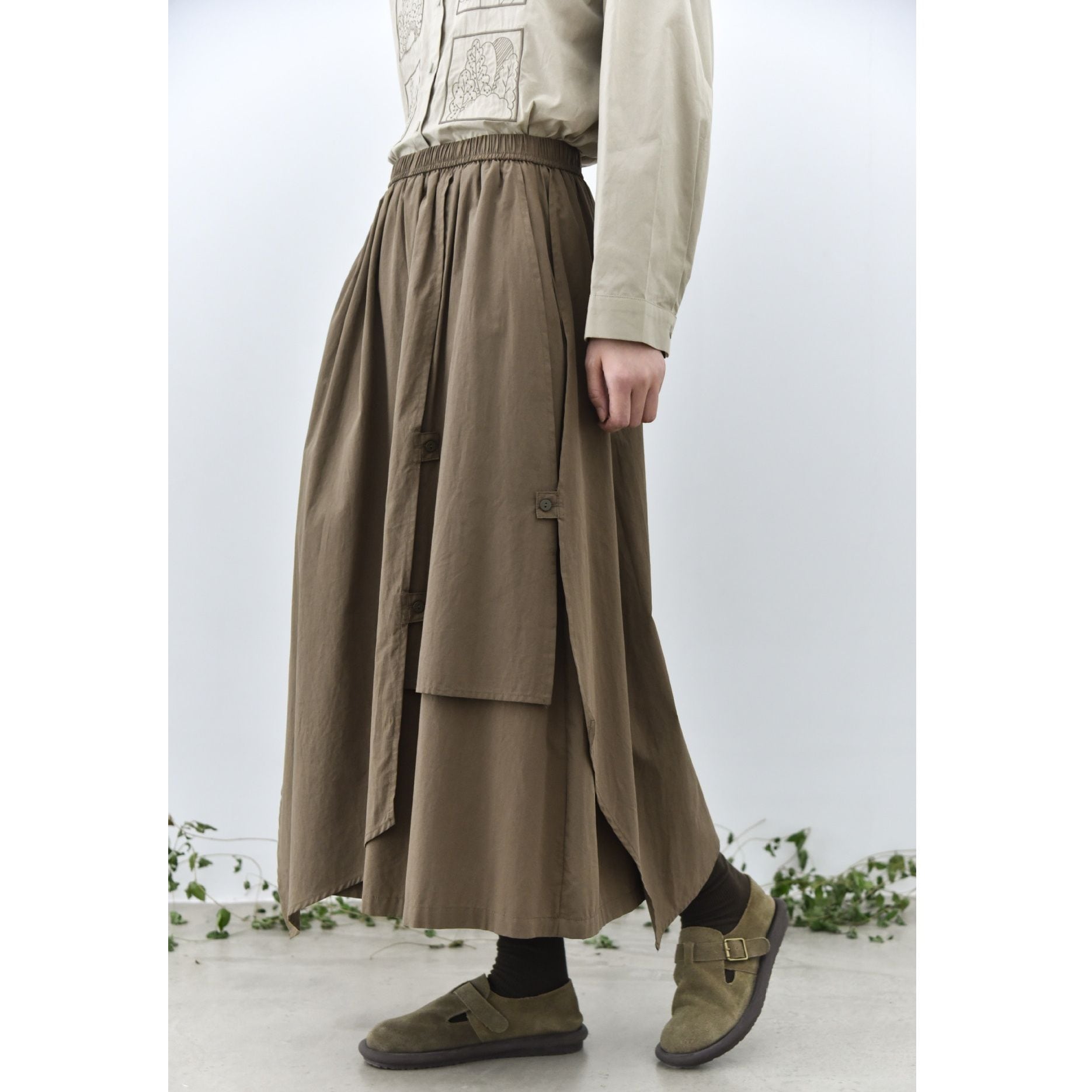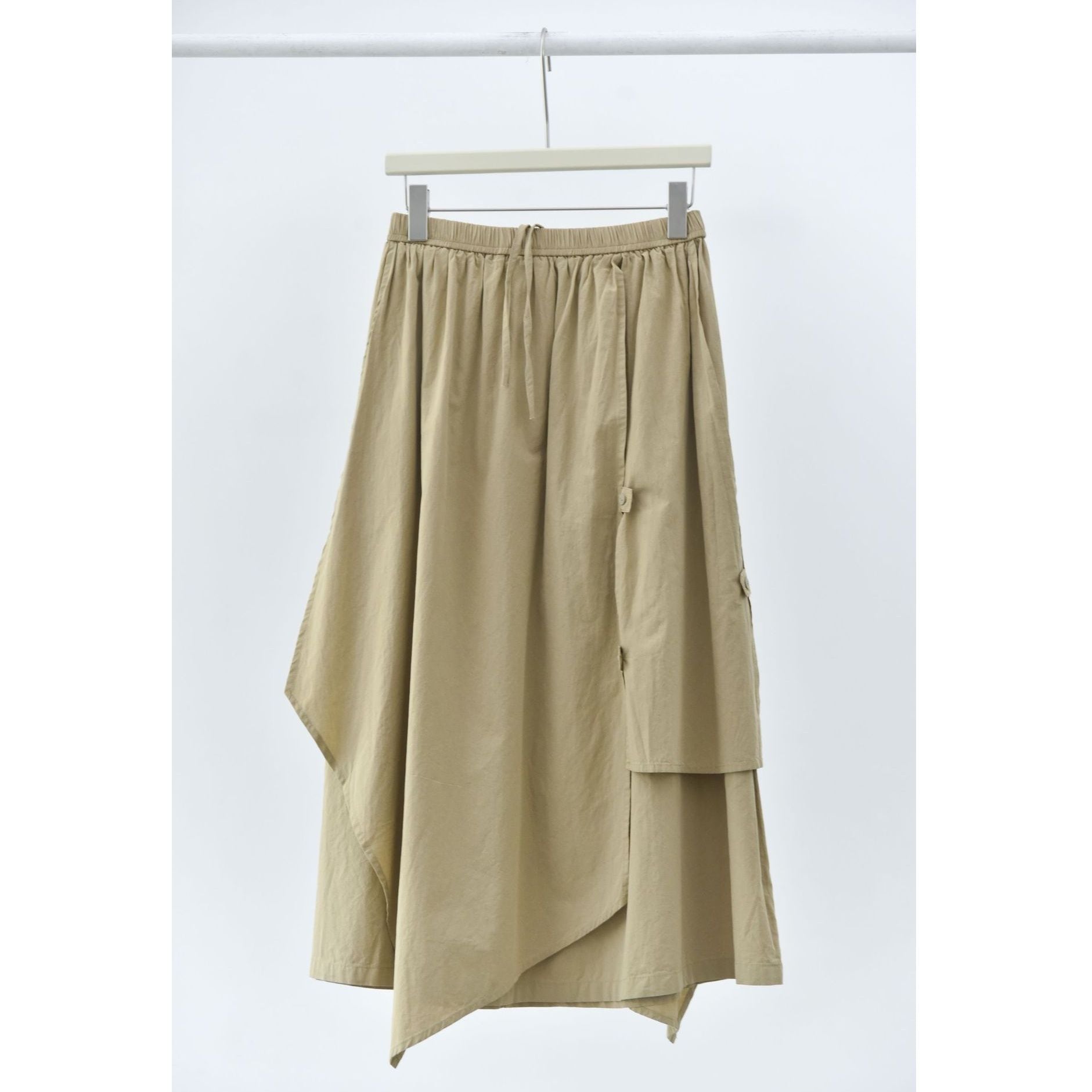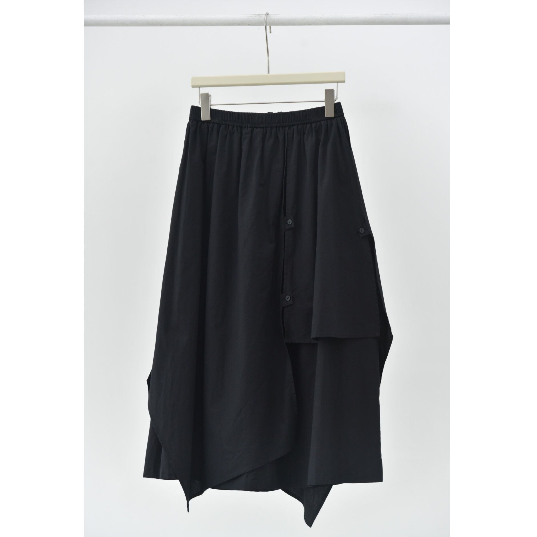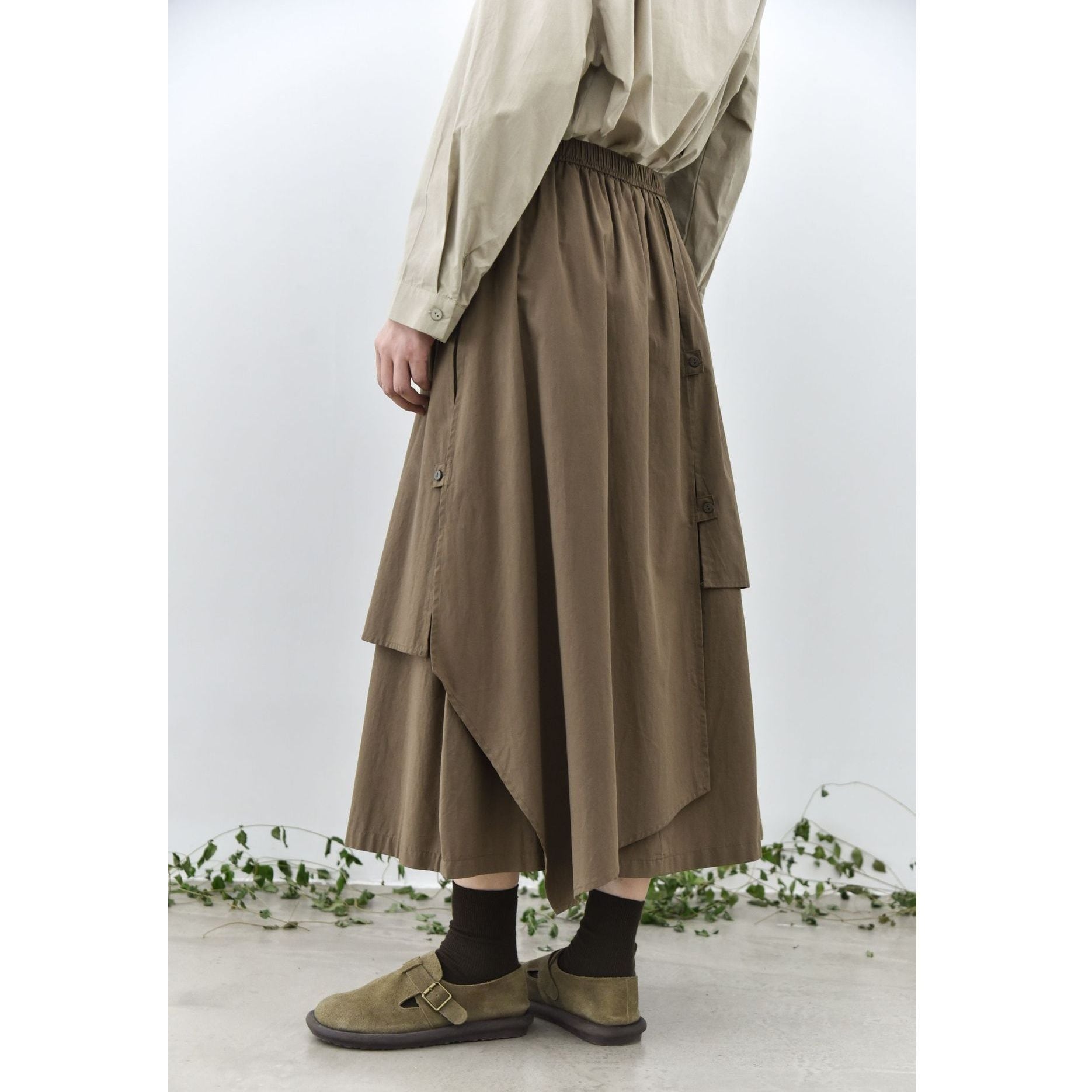 形の異なるフラップとフラップをボタンで留めるデザインがユニークな、コットン素材でできたロング丈のデザインスカートです。ウエストはゴムなので、着脱が簡単で履き心地が良いです。落ち着いた色味の単色で合わせやすい、シルエットが目を惹くアイテムです。色は3色から選べます。