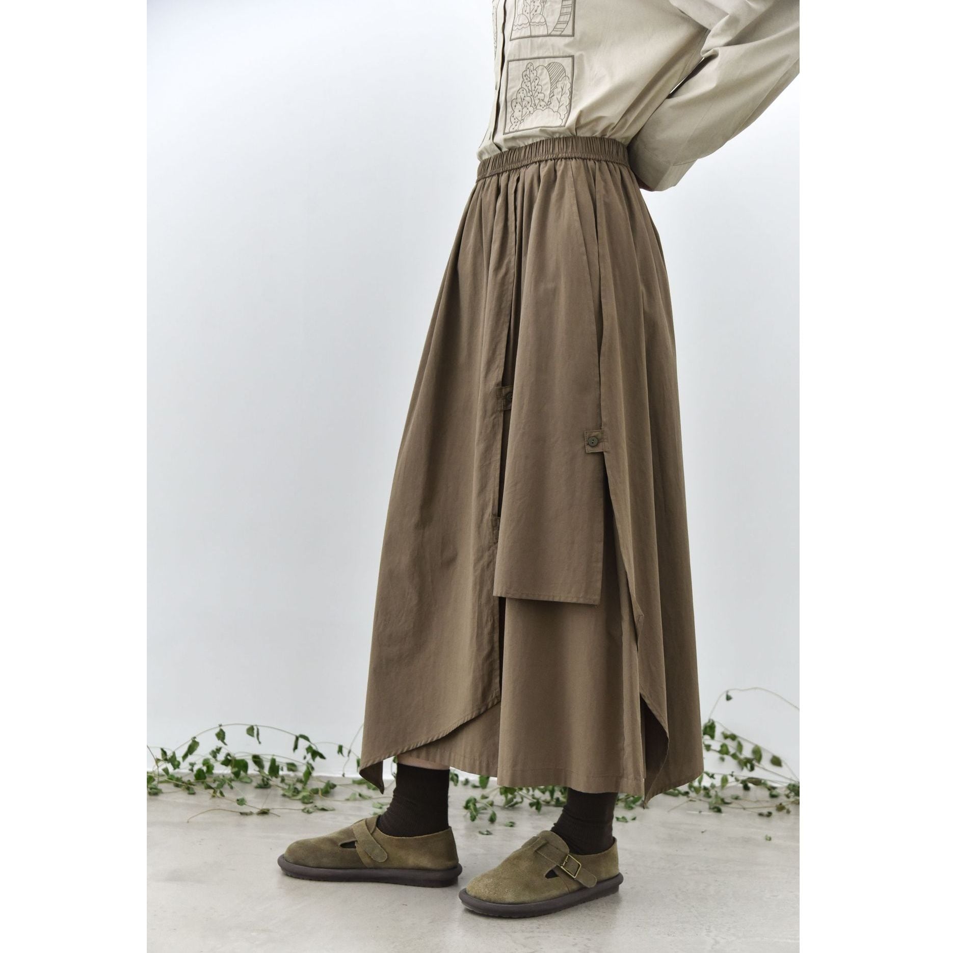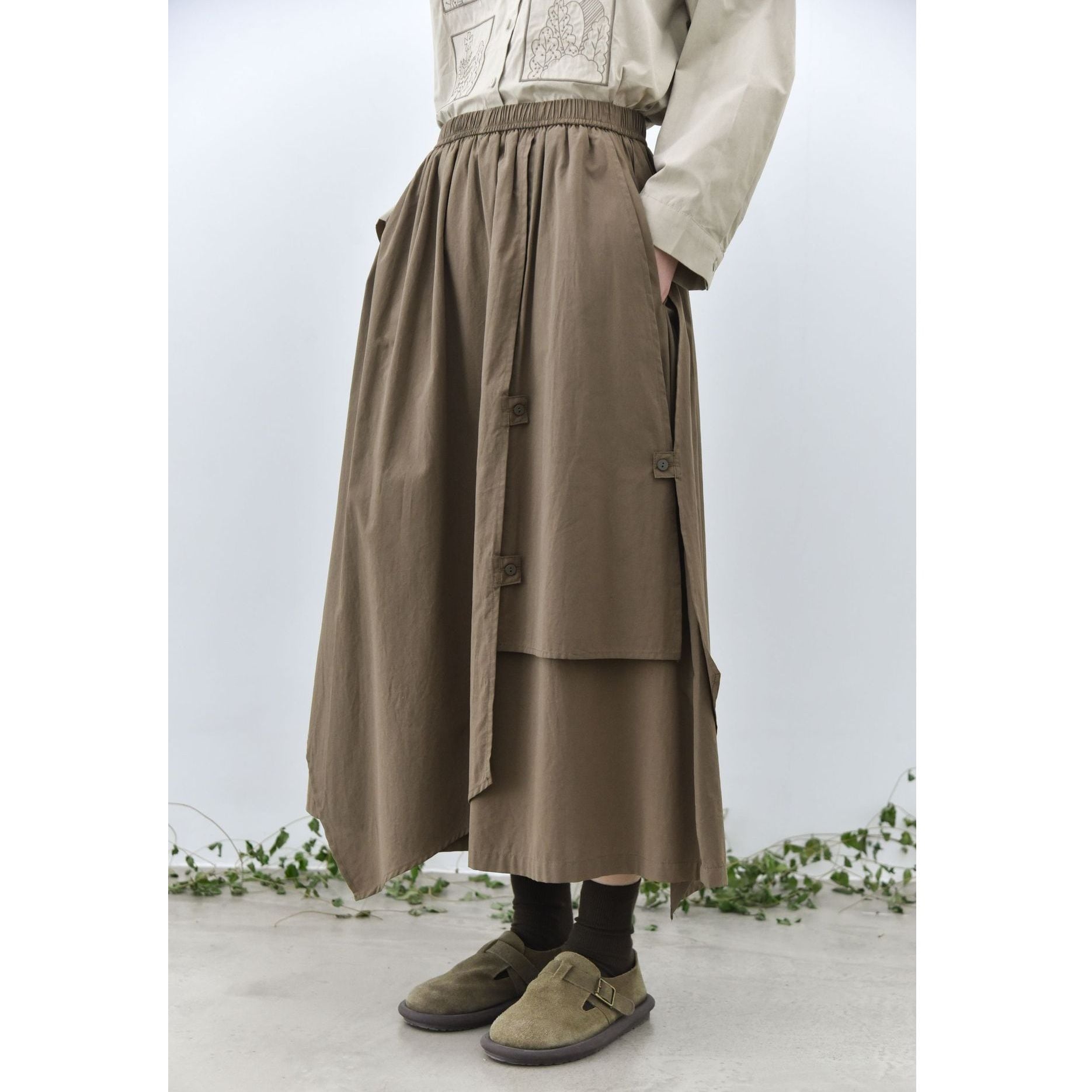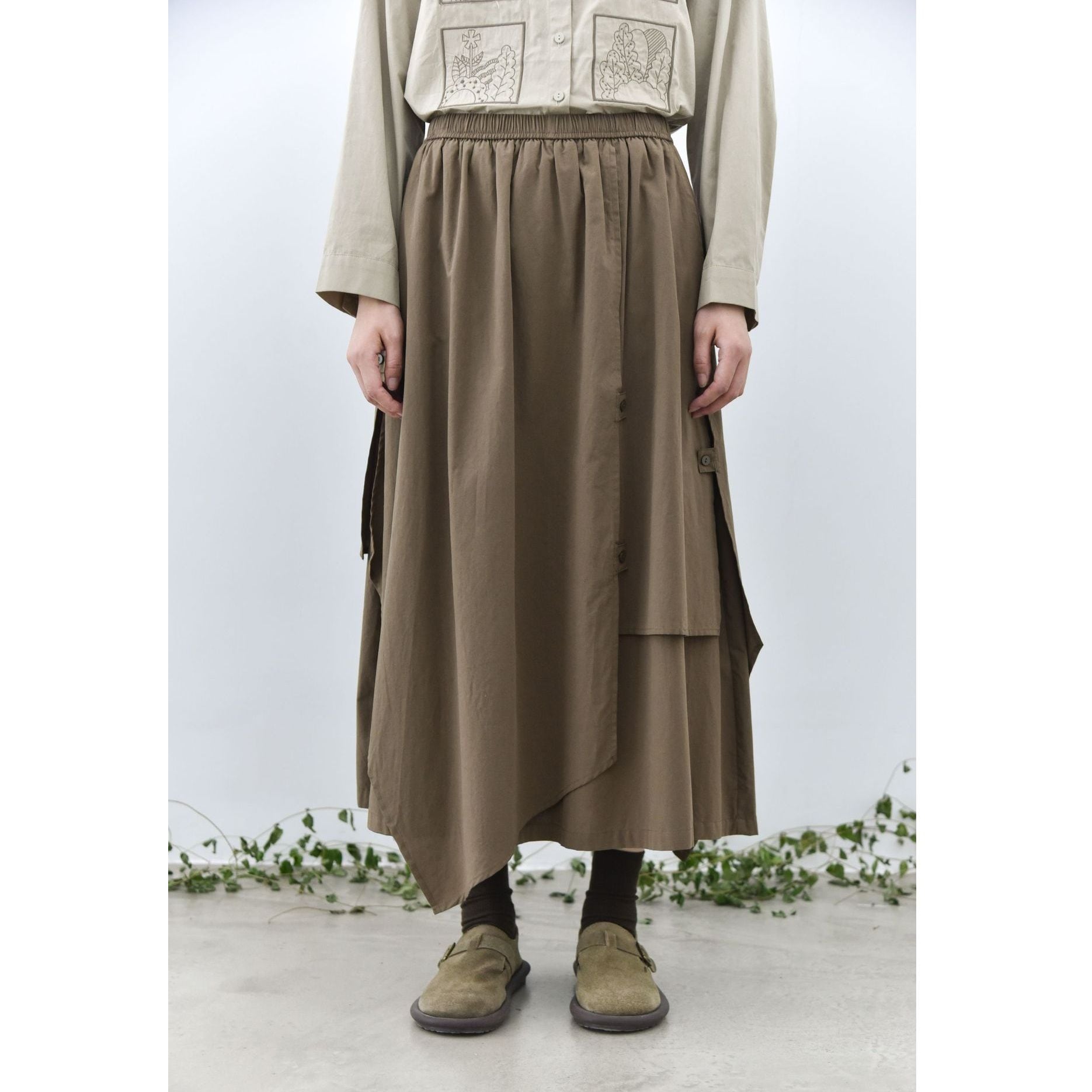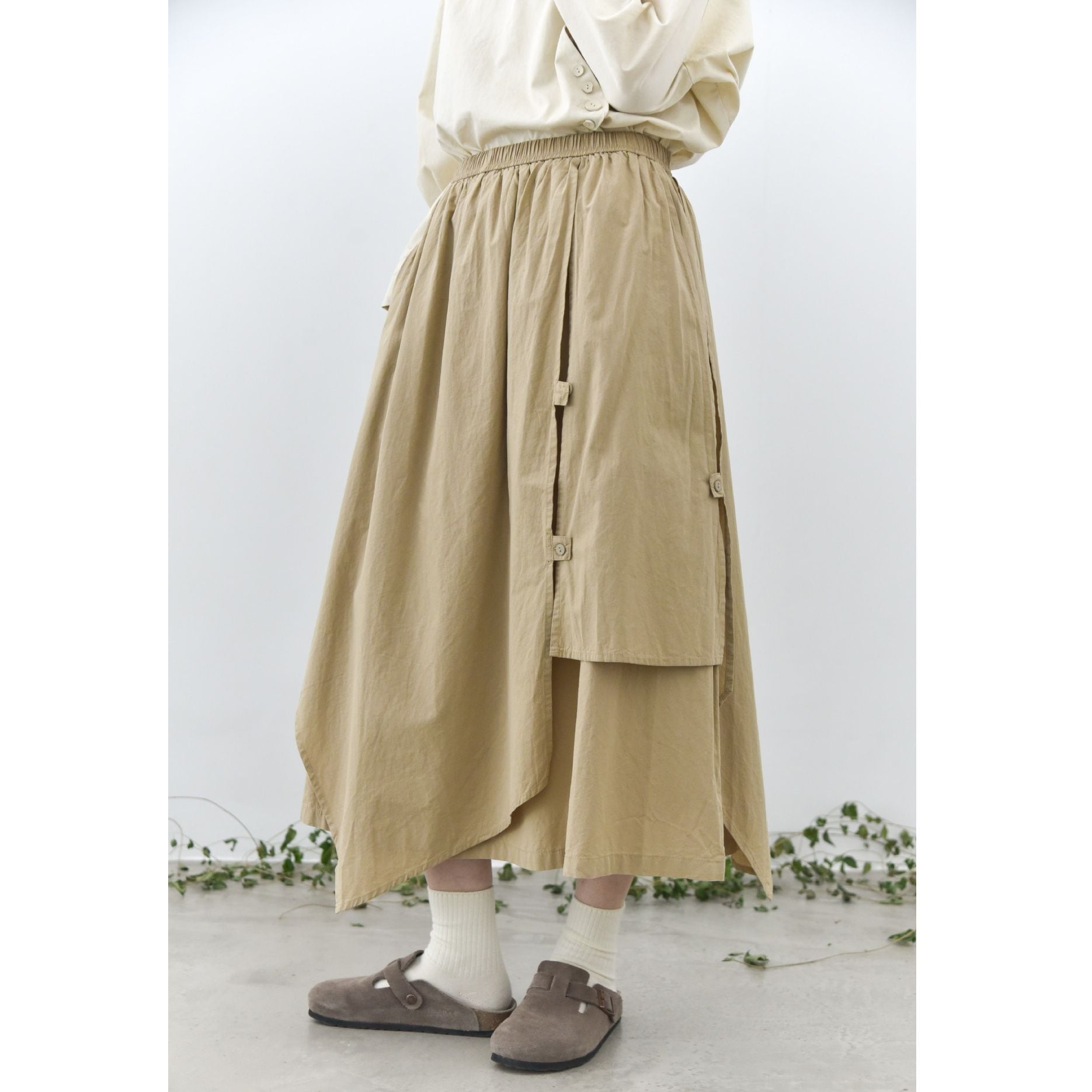 形の異なるフラップとフラップをボタンで留めるデザインがユニークな、コットン素材でできたロング丈のデザインスカートです。ウエストはゴムなので、着脱が簡単で履き心地が良いです。落ち着いた色味の単色で合わせやすい、シルエットが目を惹くアイテムです。色は3色から選べます。