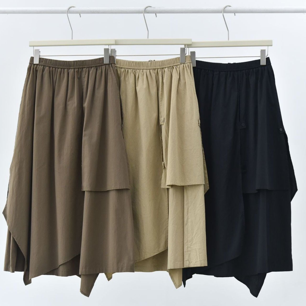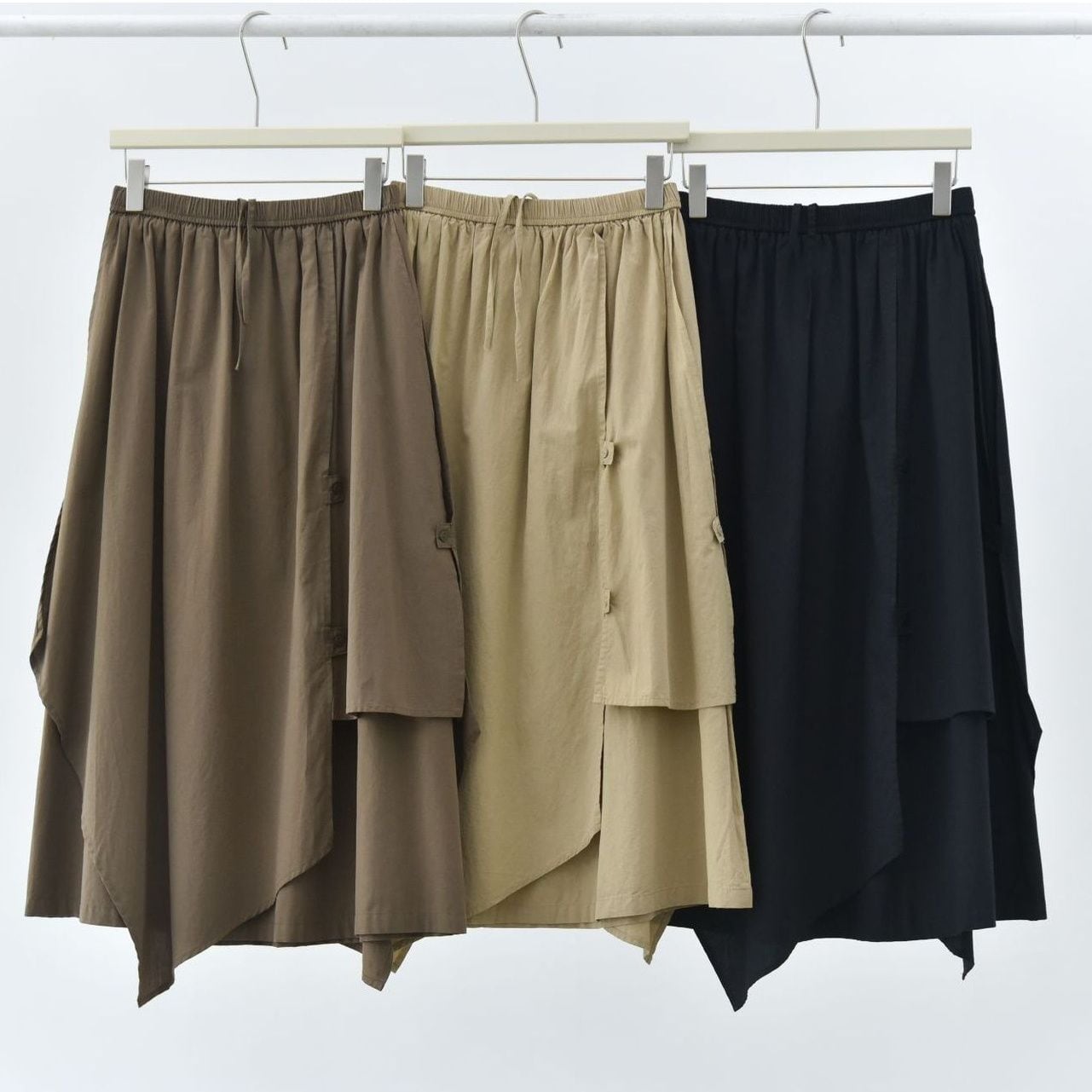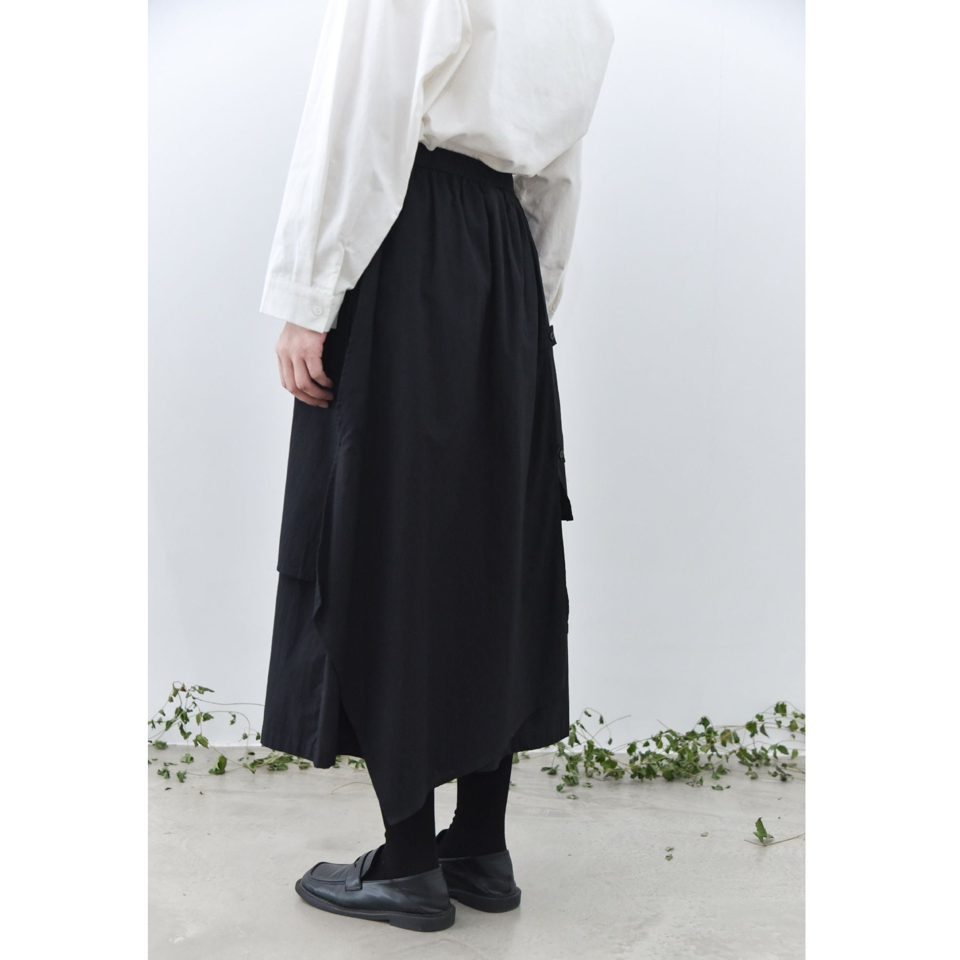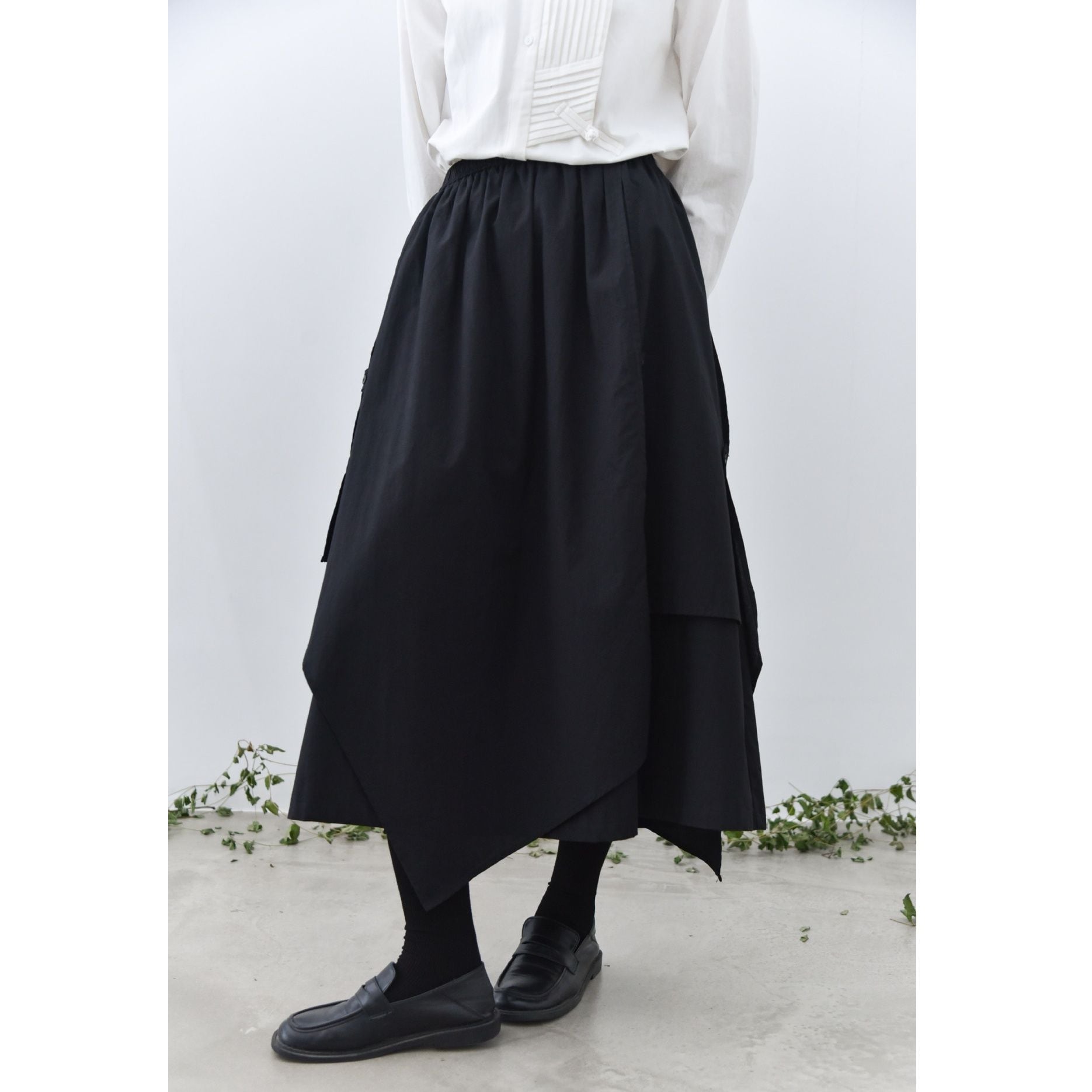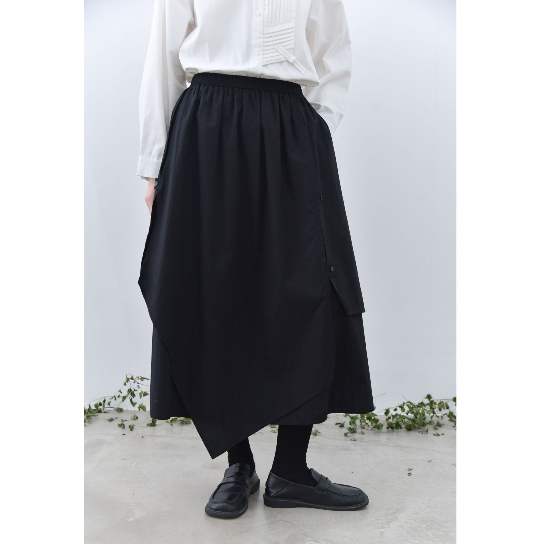 形の異なるフラップとフラップをボタンで留めるデザインがユニークな、コットン素材でできたロング丈のデザインスカートです。ウエストはゴムなので、着脱が簡単で履き心地が良いです。落ち着いた色味の単色で合わせやすい、シルエットが目を惹くアイテムです。色は3色から選べます。