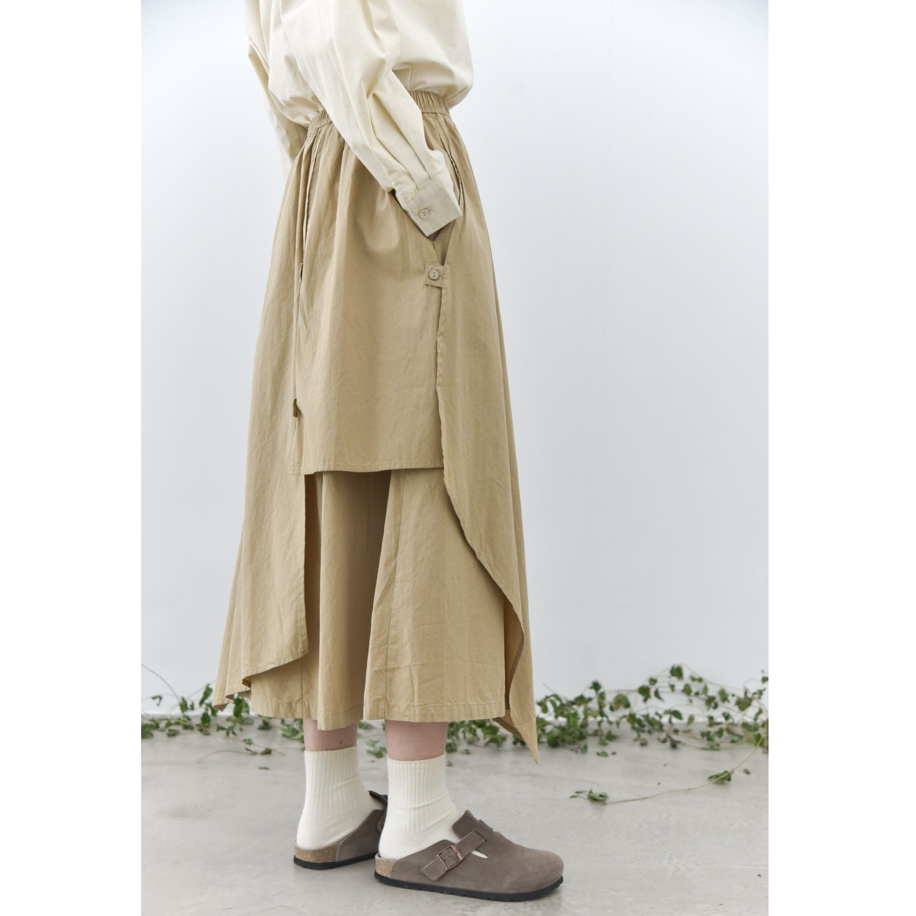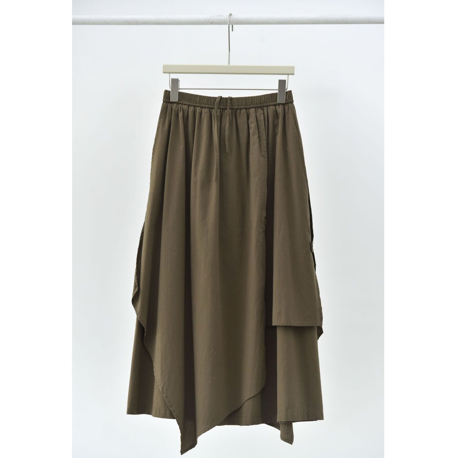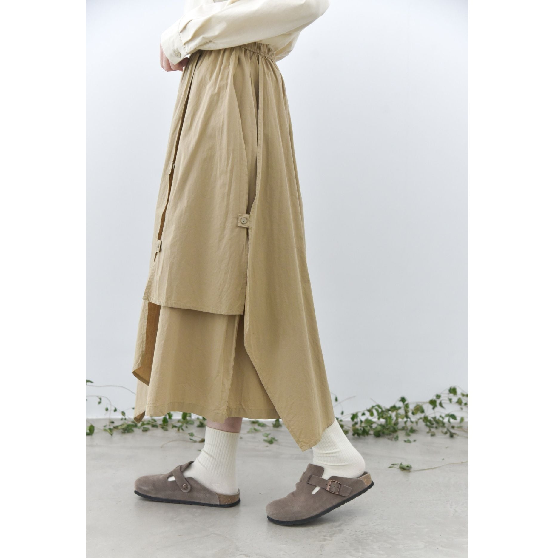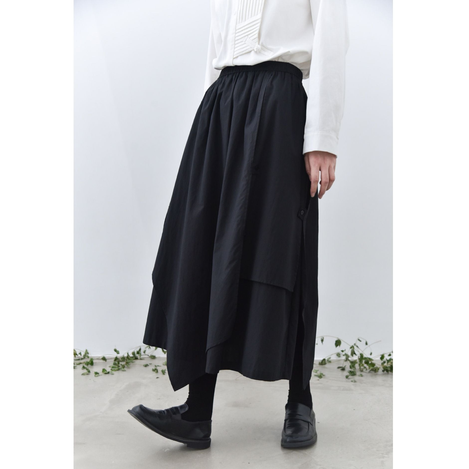 形の異なるフラップとフラップをボタンで留めるデザインがユニークな、コットン素材でできたロング丈のデザインスカートです。ウエストはゴムなので、着脱が簡単で履き心地が良いです。落ち着いた色味の単色で合わせやすい、シルエットが目を惹くアイテムです。色は3色から選べます。