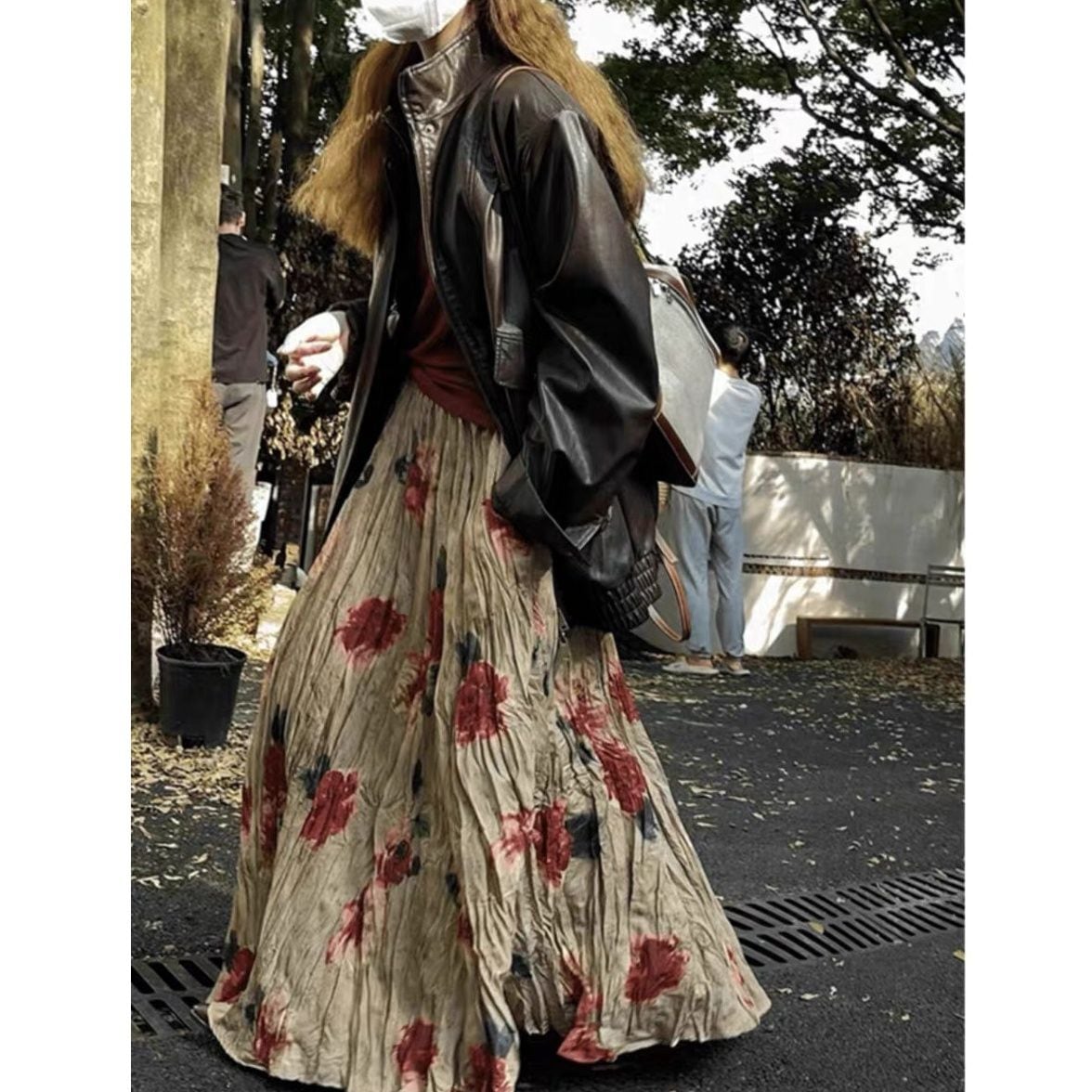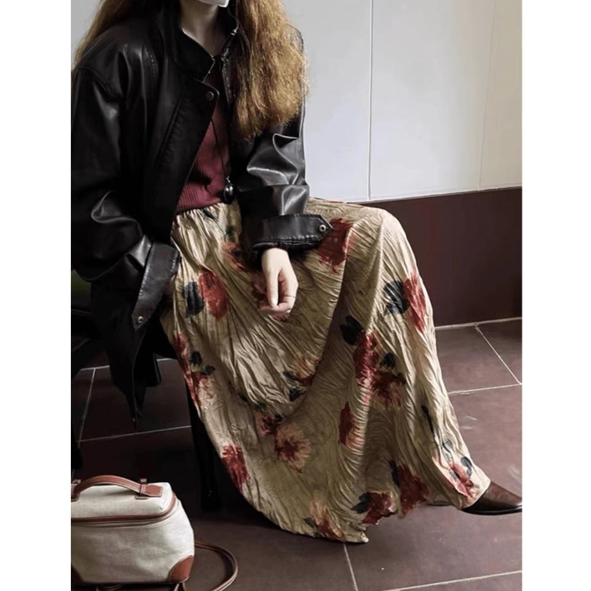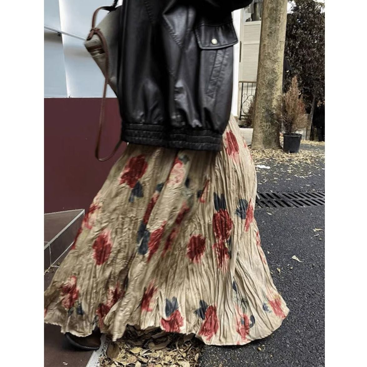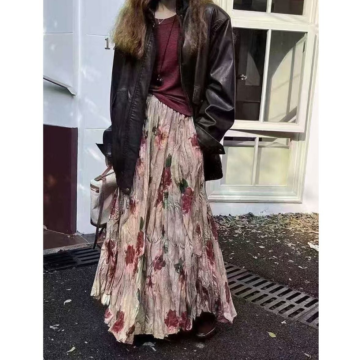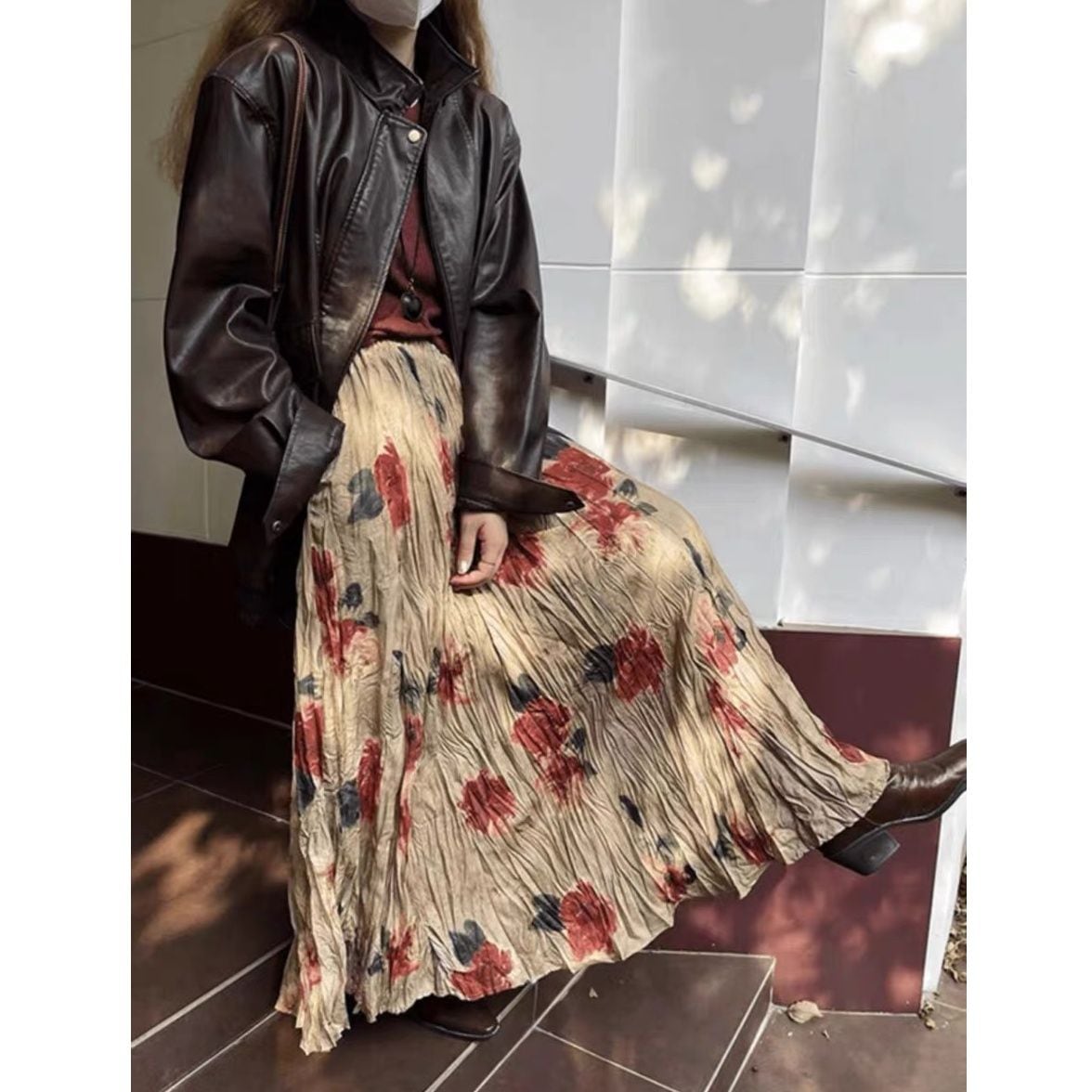 FLOWER PRINT A-LINE WRINKLED MAXI DESIGN SKIRT 1colors M-16124