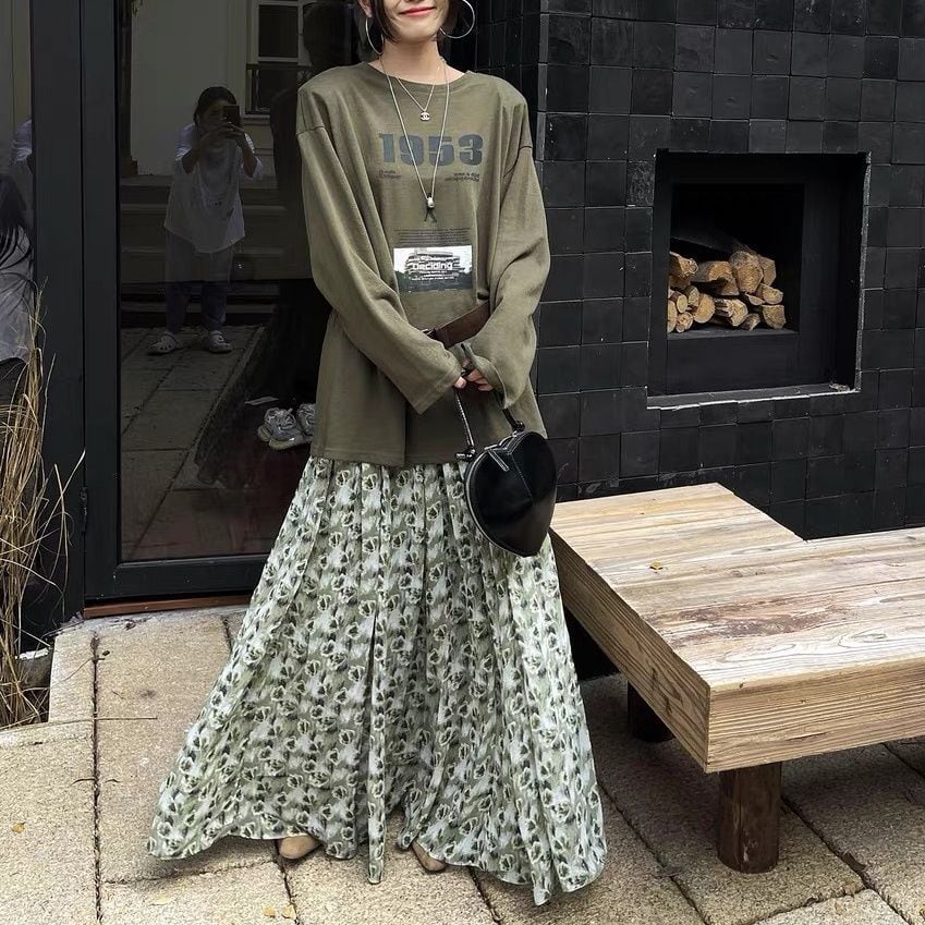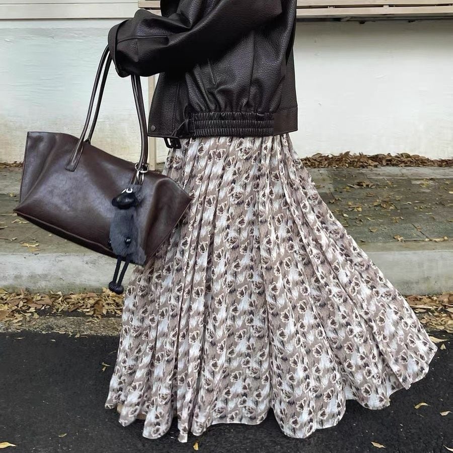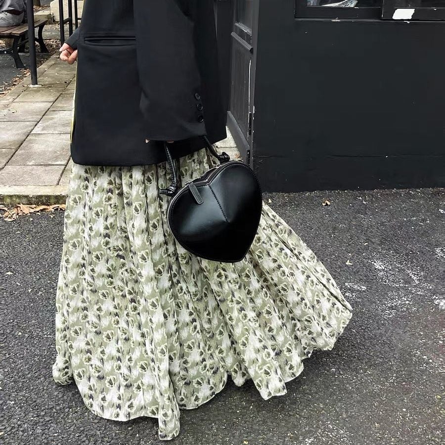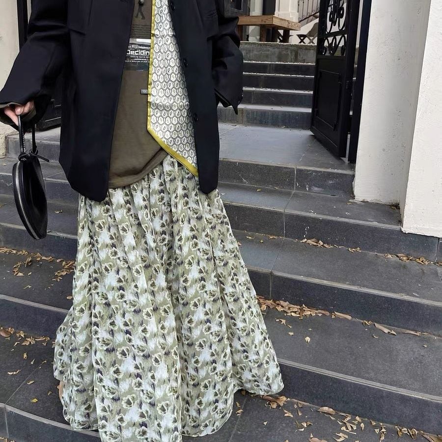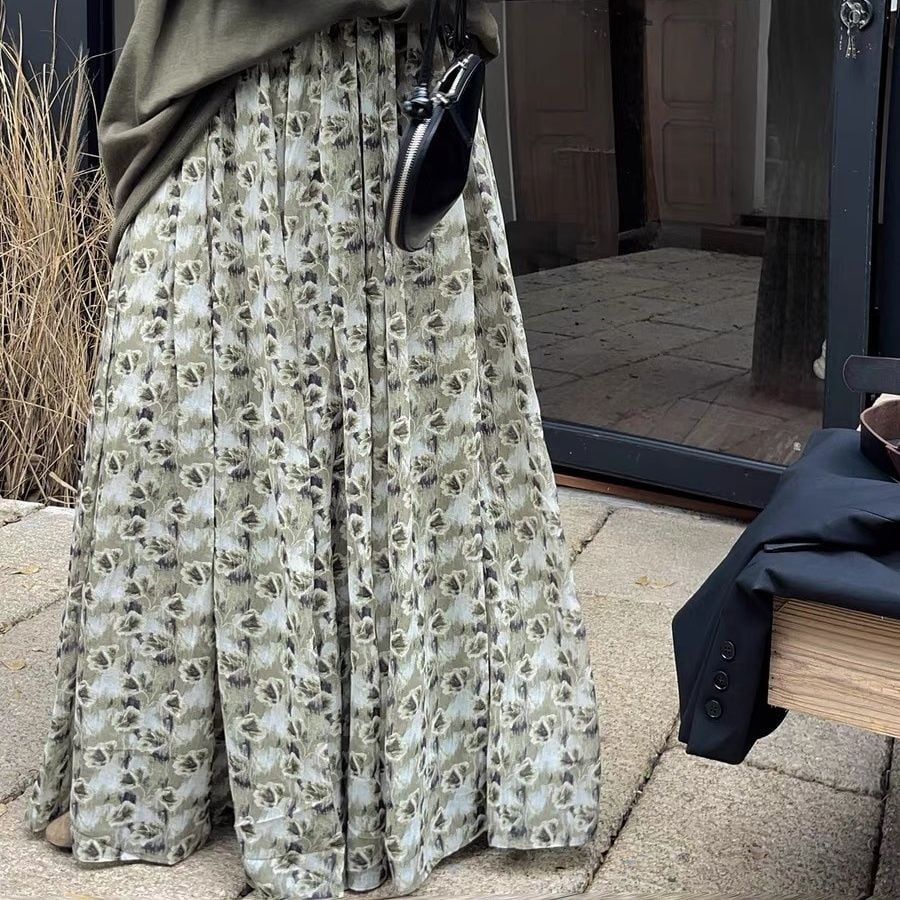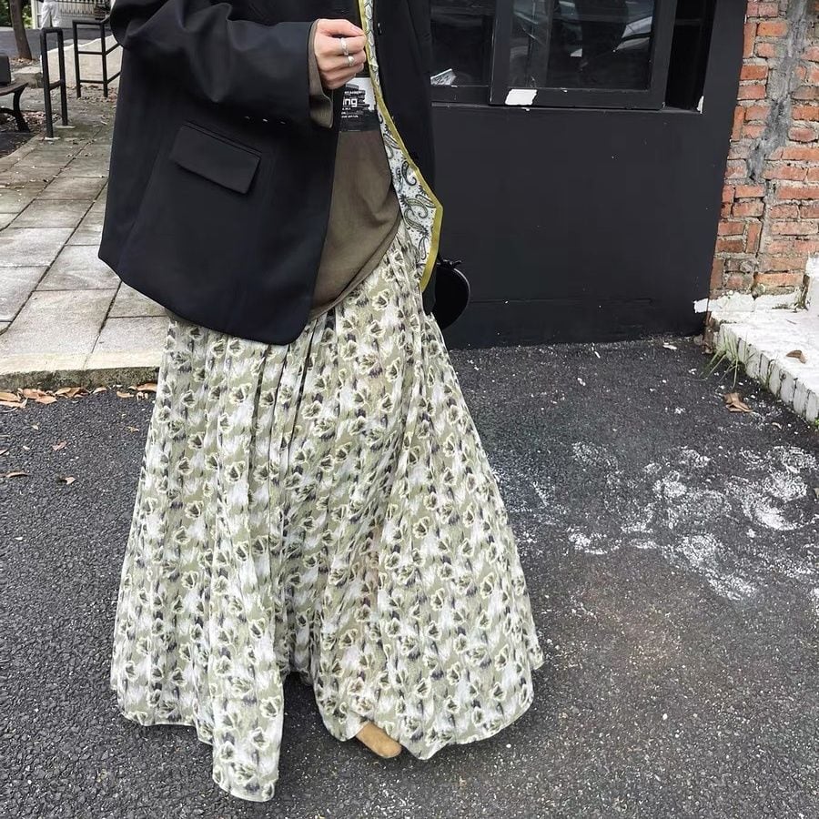 FLOWER PRINT A-LINE WRINKLED MAXI DESIGN SKIRT 2colors M-16126