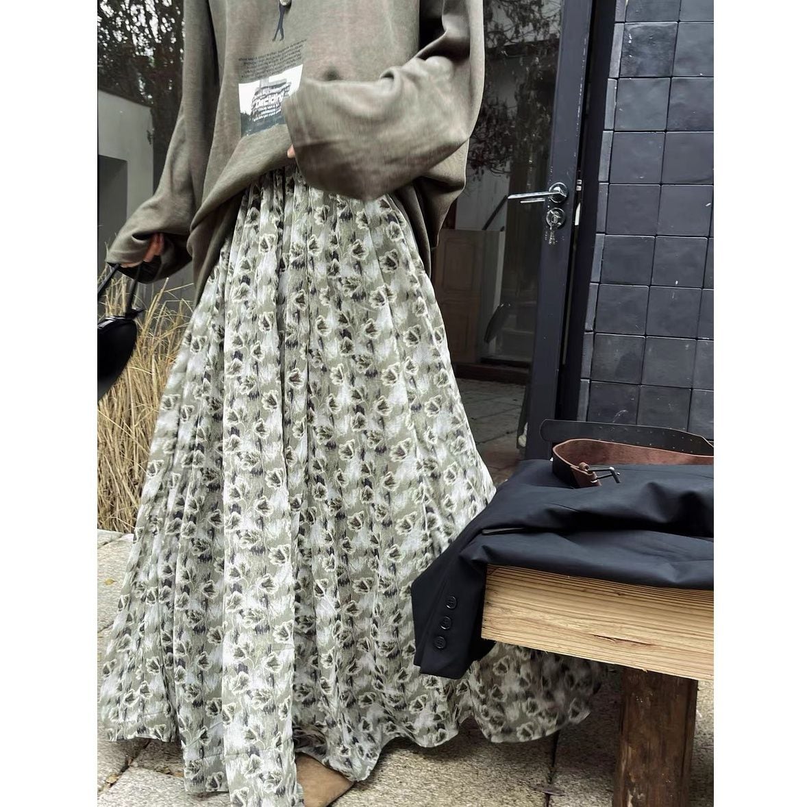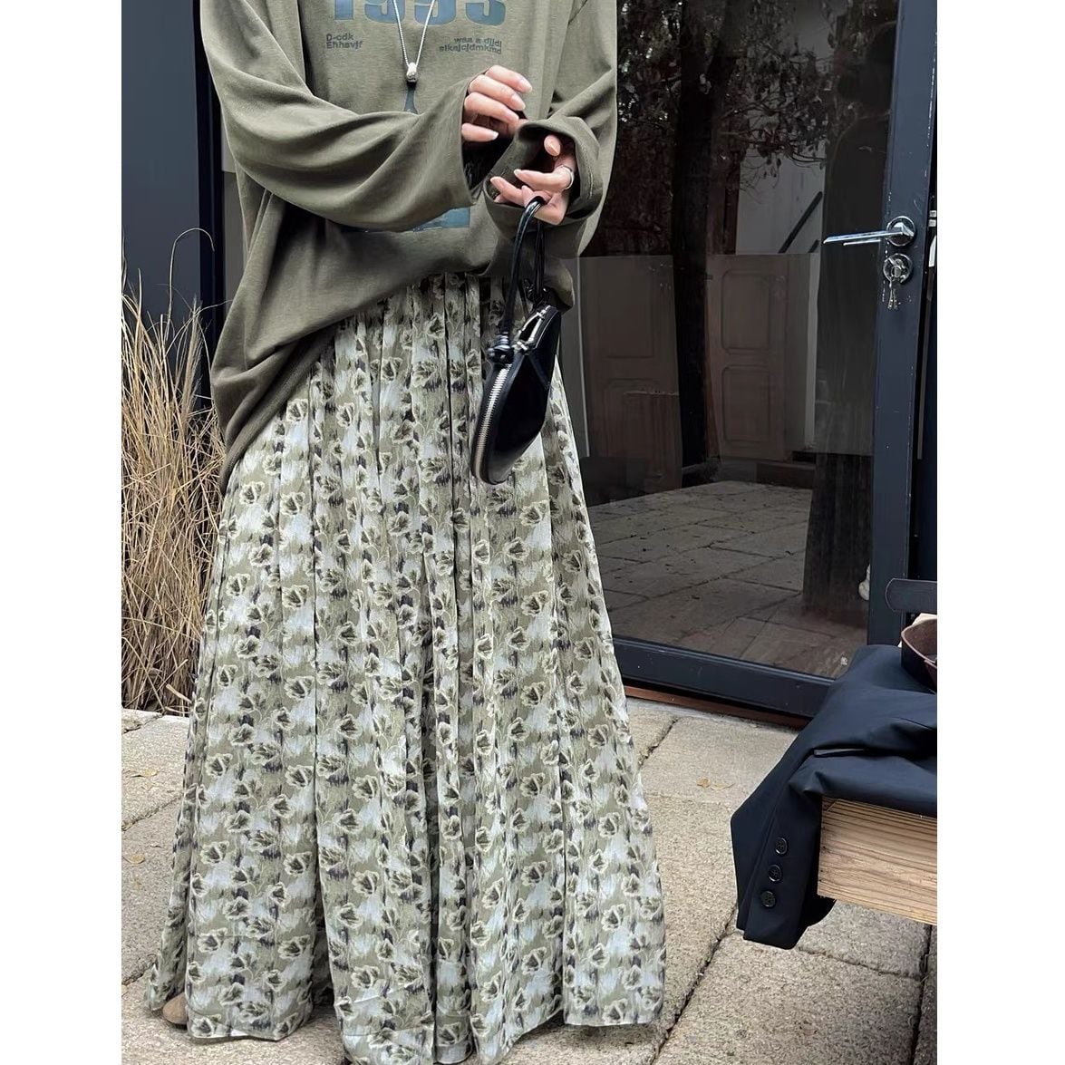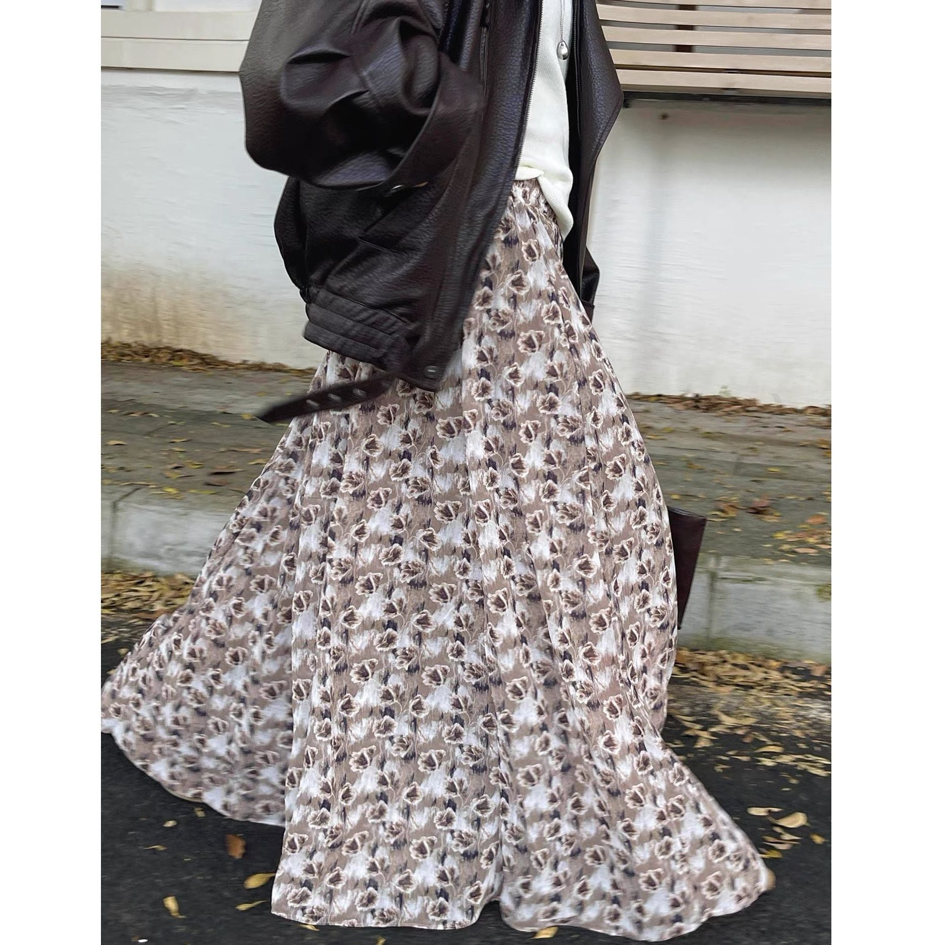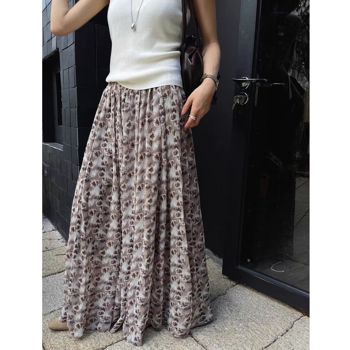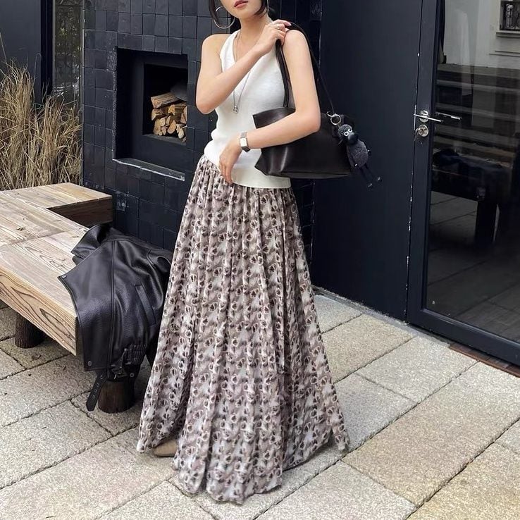 FLOWER PRINT A-LINE WRINKLED MAXI DESIGN SKIRT 2colors M-16126