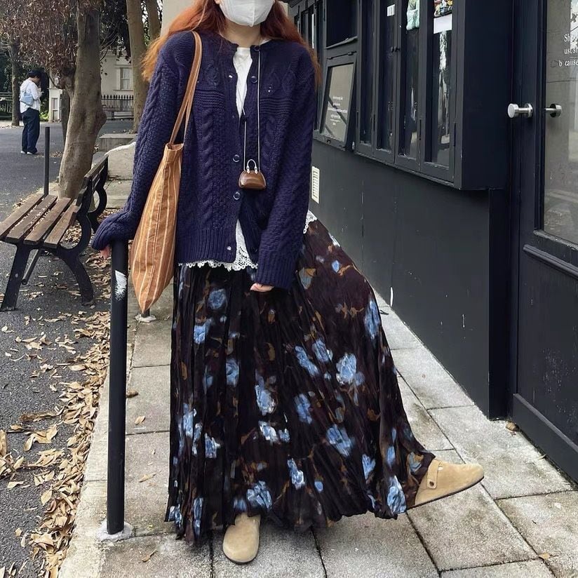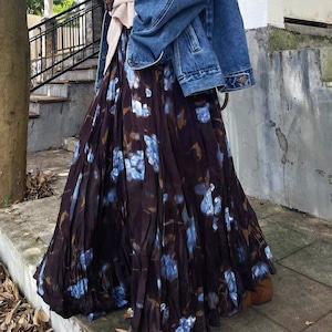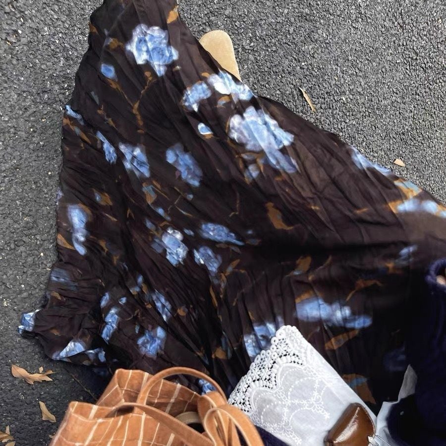 薄くて軽いしわ加工素材でできた、Aライン・マキシ丈のデザインスカートです。ブラウン地にブルーの花柄がアーティスティックな、エレガントで目を惹くアイテムです。通常生地と温かい裏地付きから選べます。
