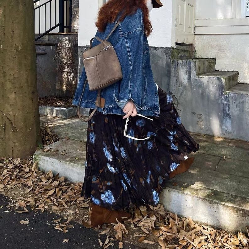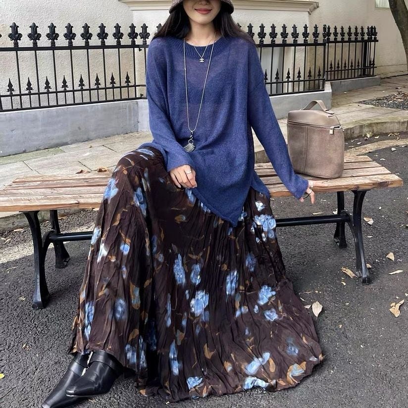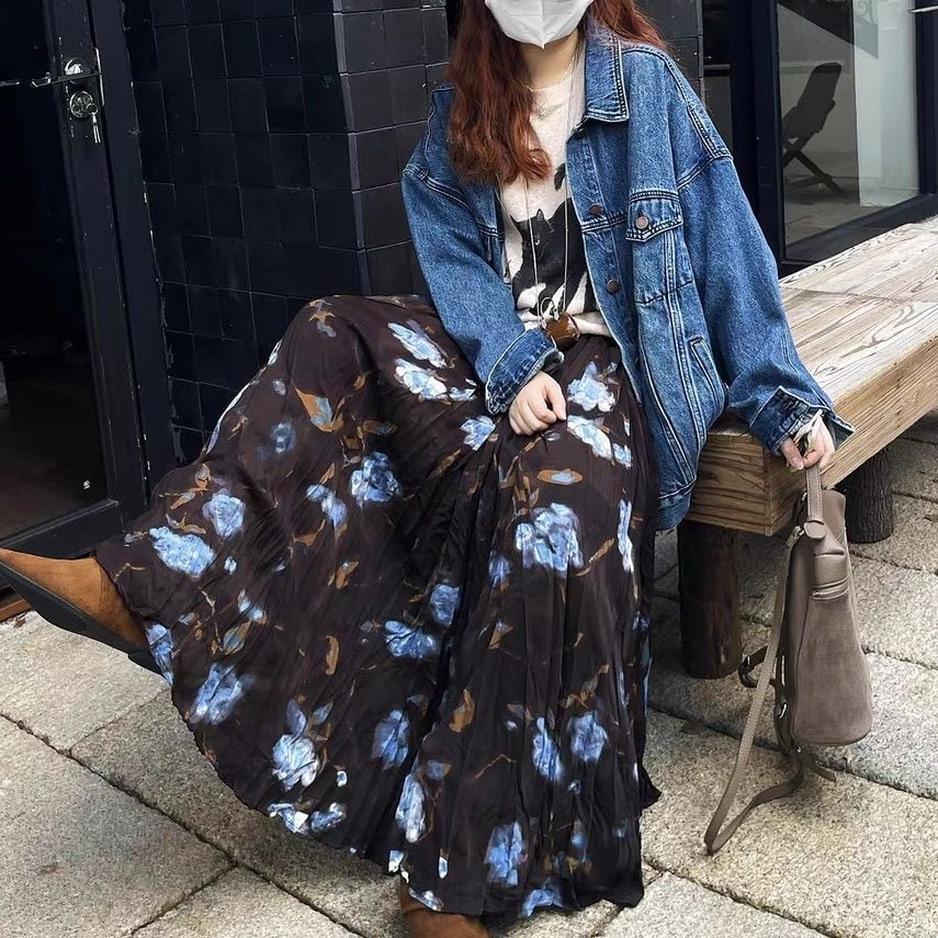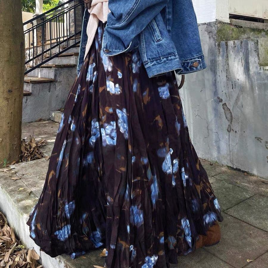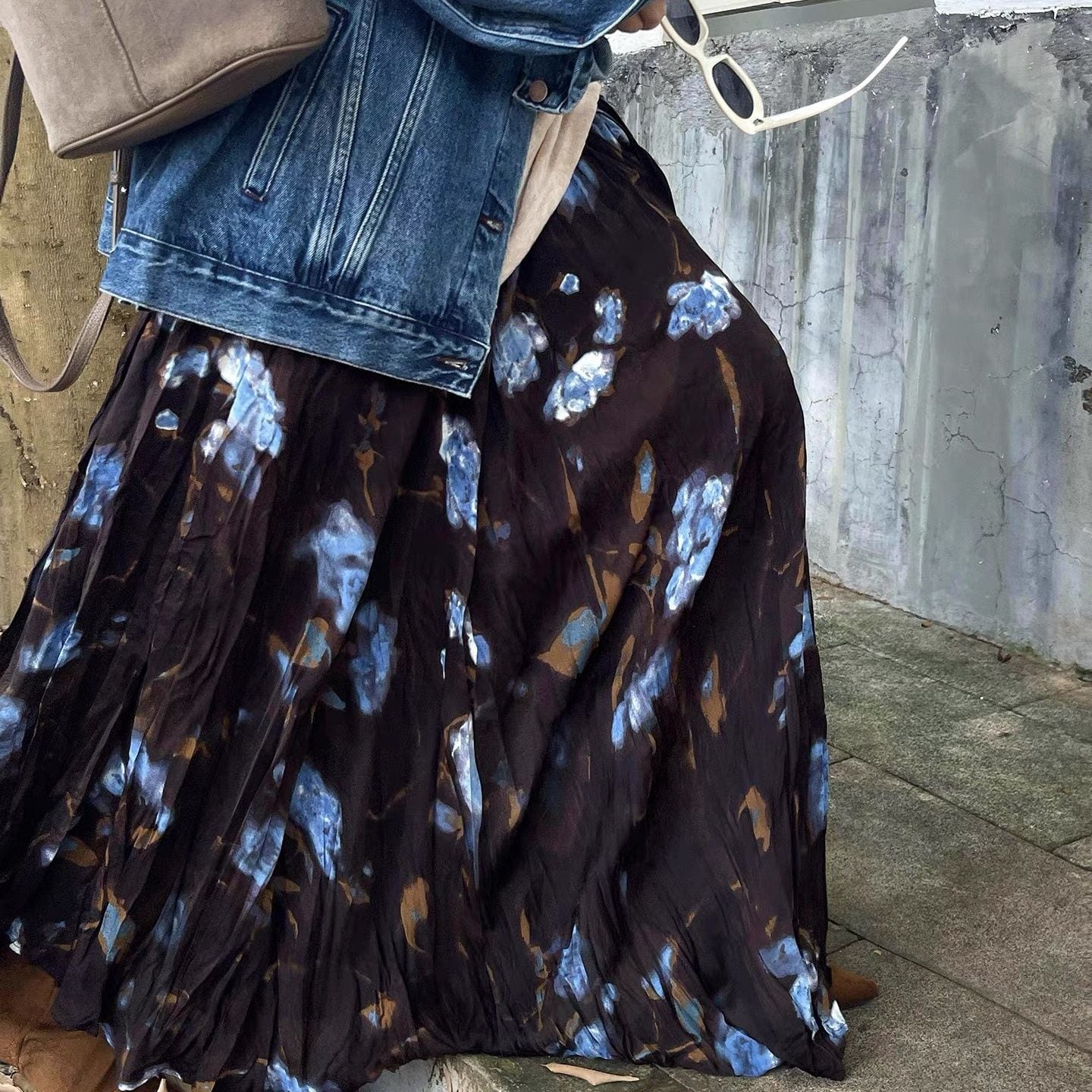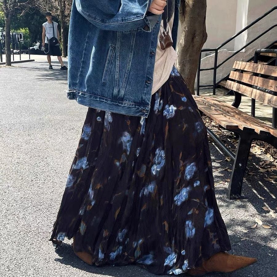 FLOWER PRINT A-LINE WRINKLED MAXI DESIGN SKIRT 1color M-16129