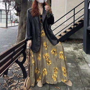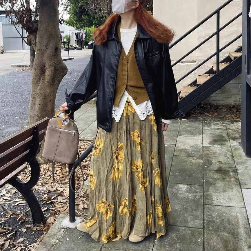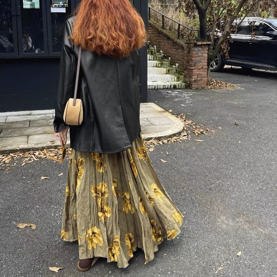 FLOWER PRINT A-LINE WRINKLED MAXI DESIGN SKIRT 1color M-16131