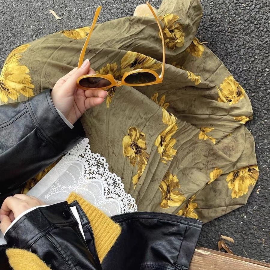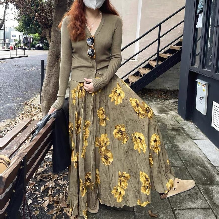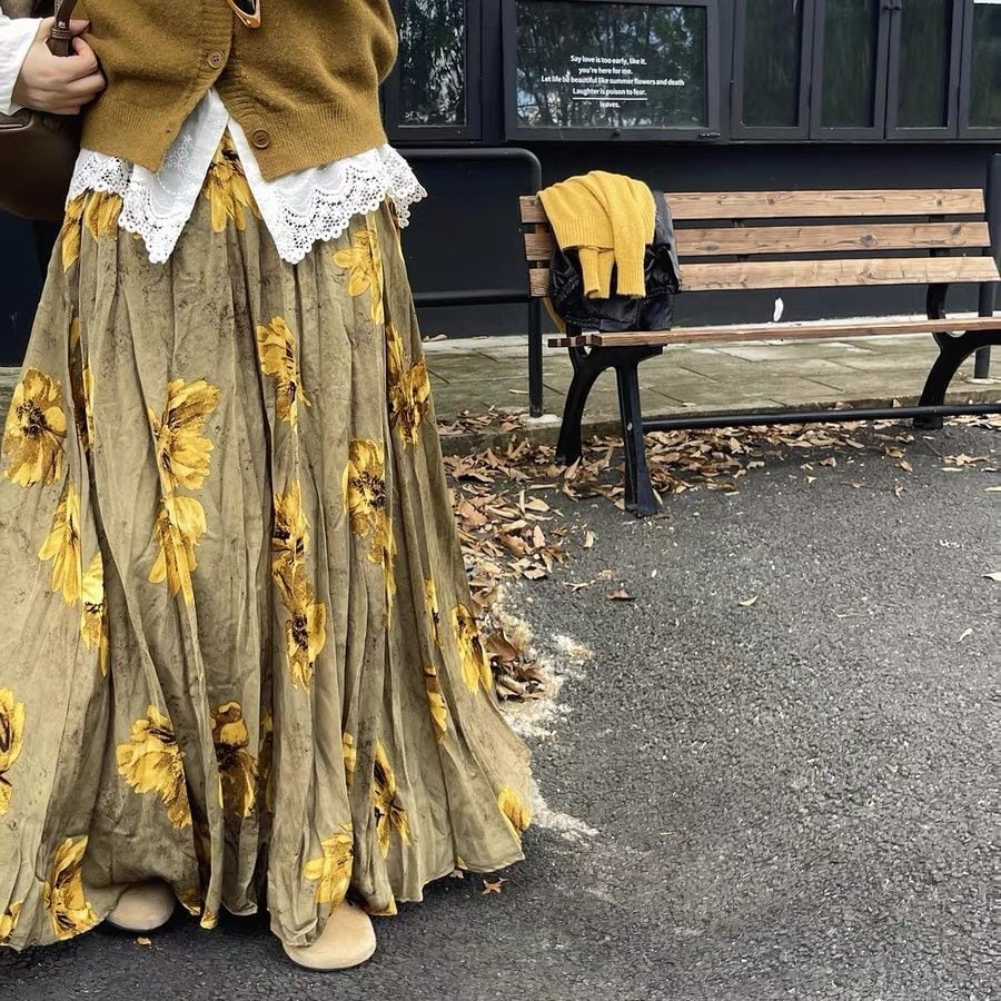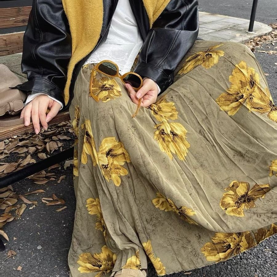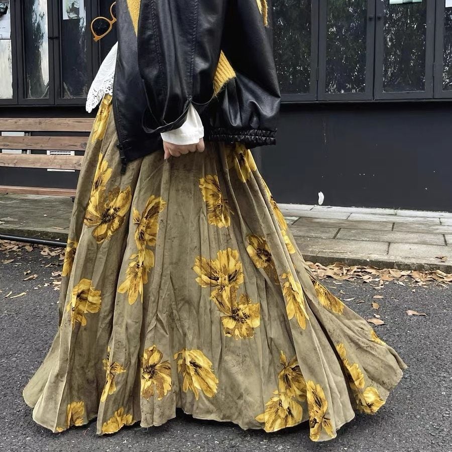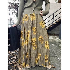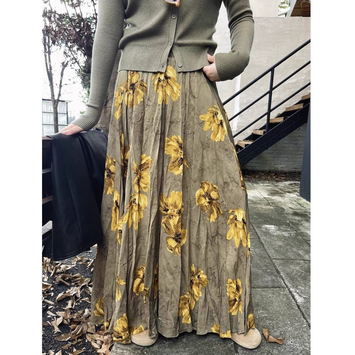 薄くて軽いしわ加工素材でできた、Aライン・マキシ丈のデザインスカートです。カーキ地にイエローの花柄が鮮やかな、大きく広がるシルエットがエレガントで目を惹くアイテムです。通常生地と温かい裏地付きから選べます。