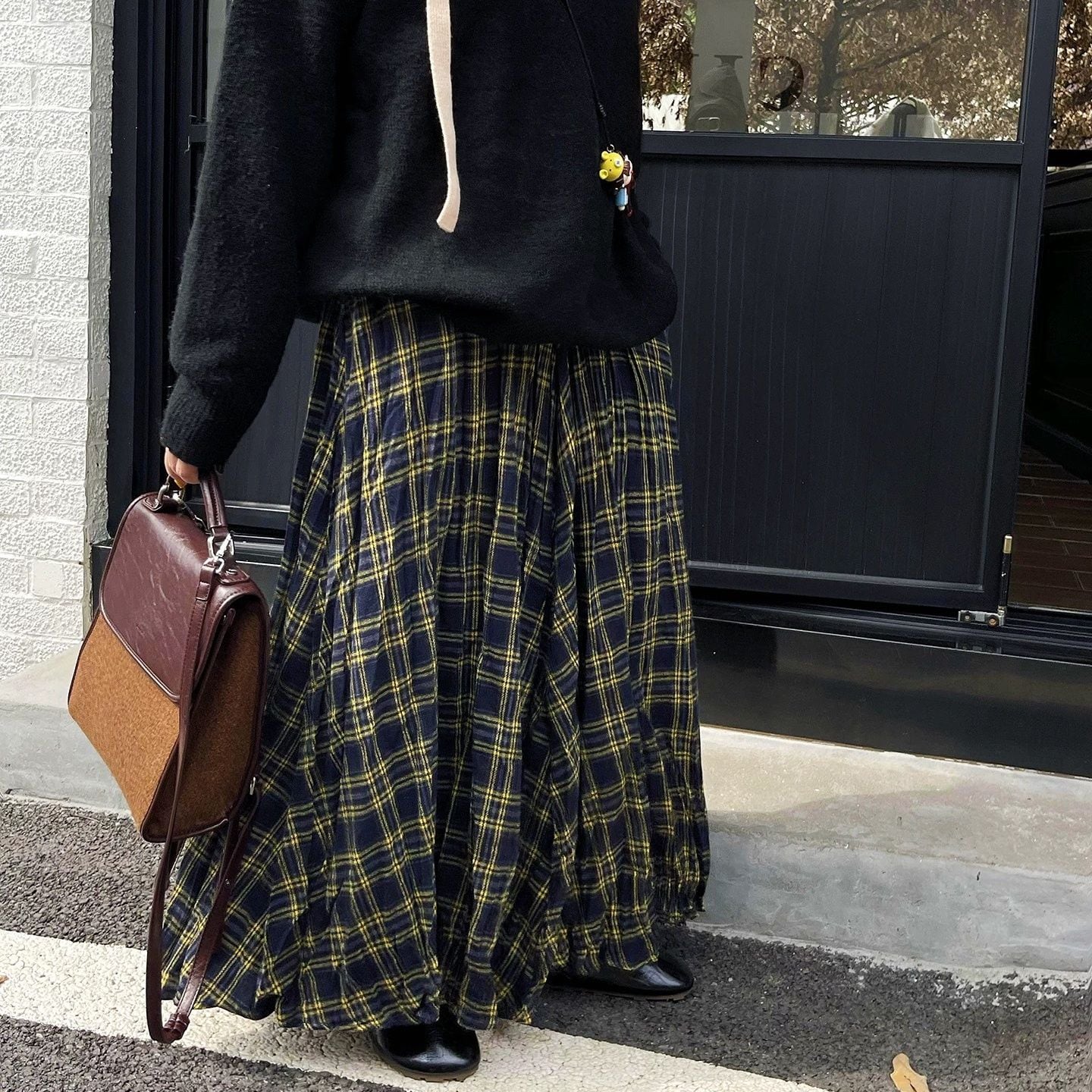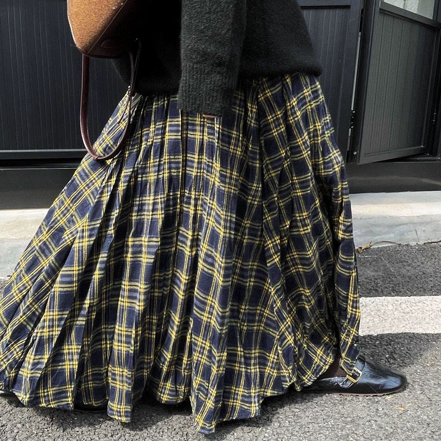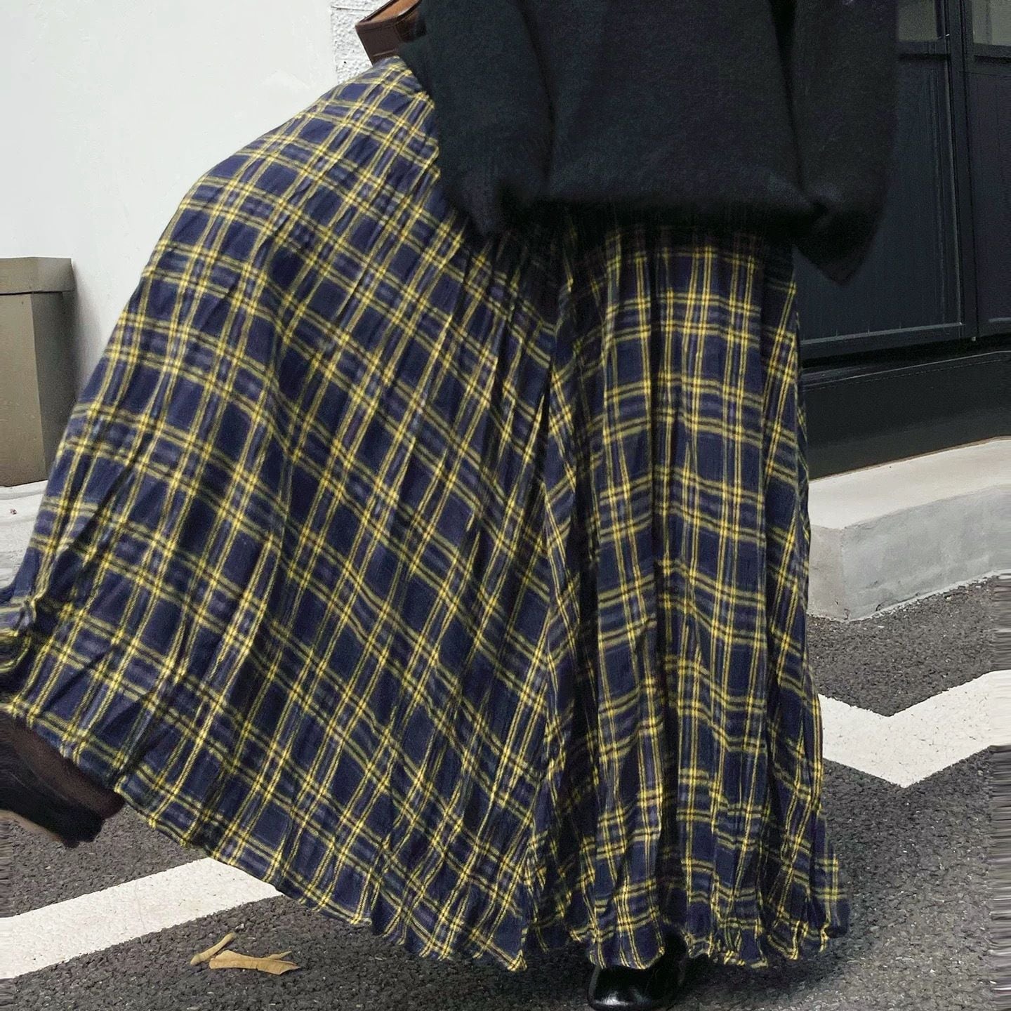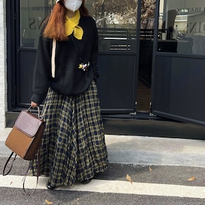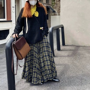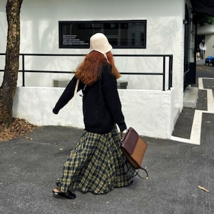 CHECKERED A-LINE WRINKLED MAXI DESIGN SKIRT 3colors M-16132