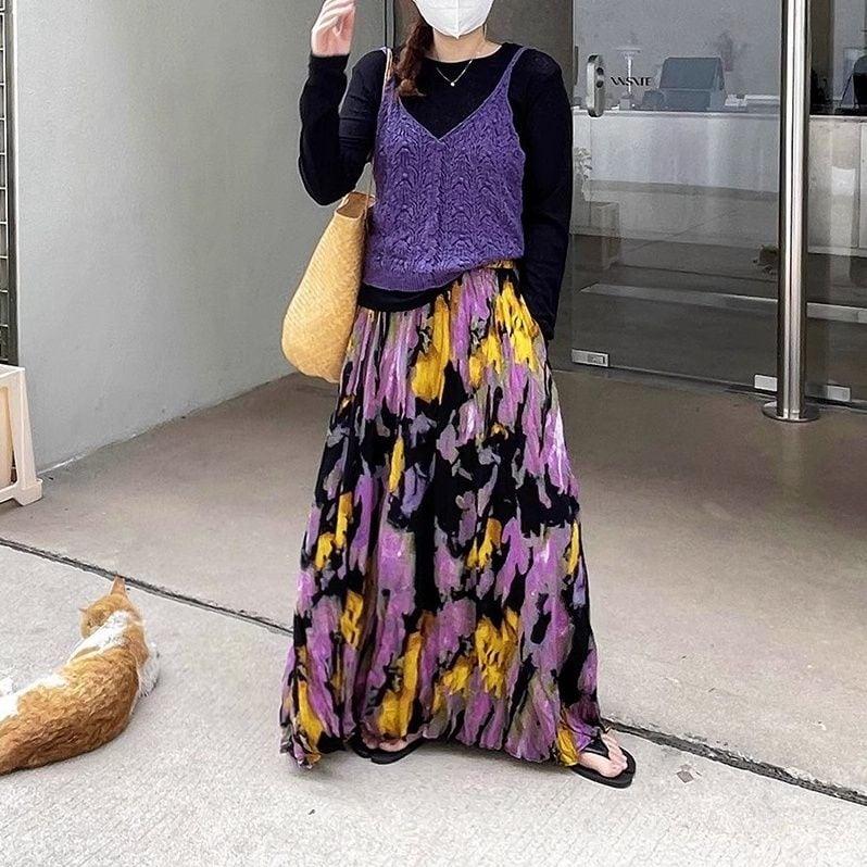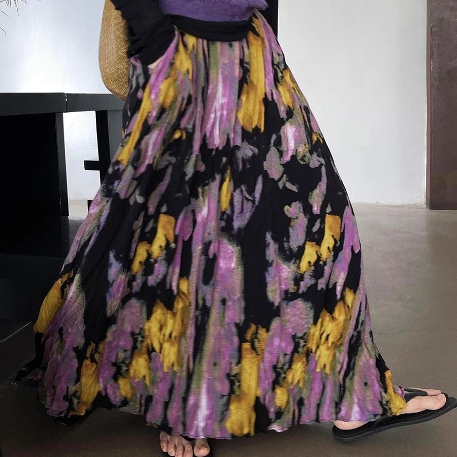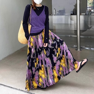 薄くて軽いしわ加工素材でできた、Aライン・マキシ丈のデザインスカートです。大きく広がるシルエットがエレガントで目を惹きます。紫や黄色のアーティスティックなプリントがお洒落な、コーディネートの主役になるアイテムです。