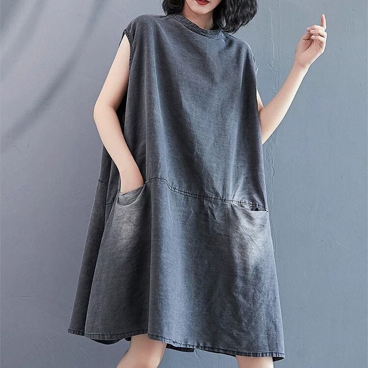DENIM STAND COLLAR SLEEVELESS A-LINE MIDI PULLOVER DRESS 1color M-16150