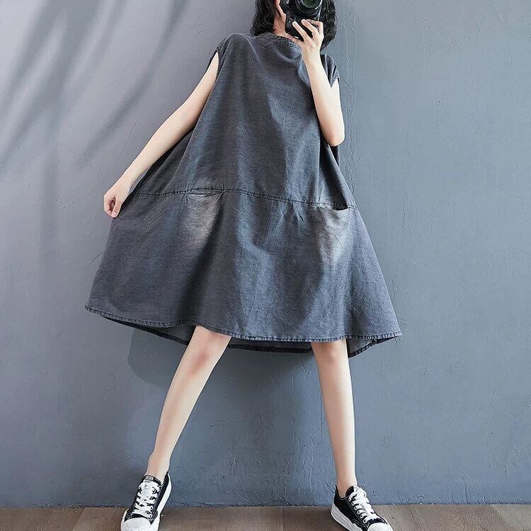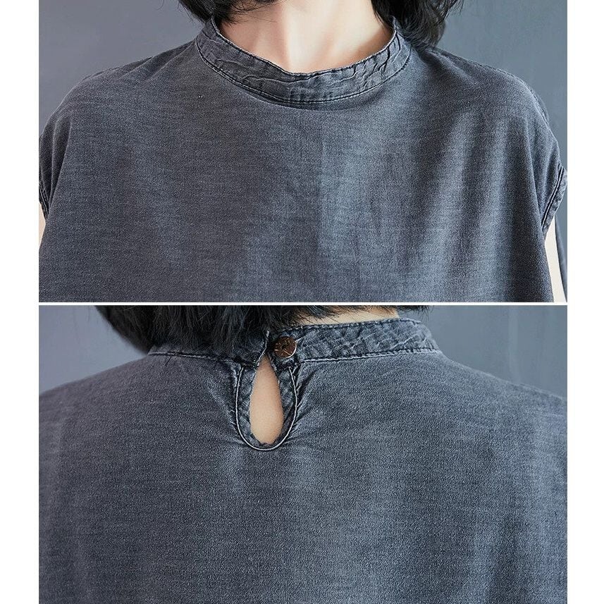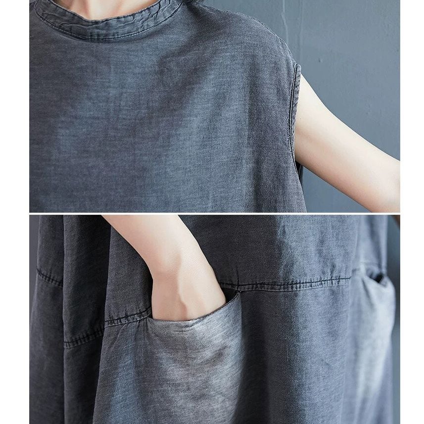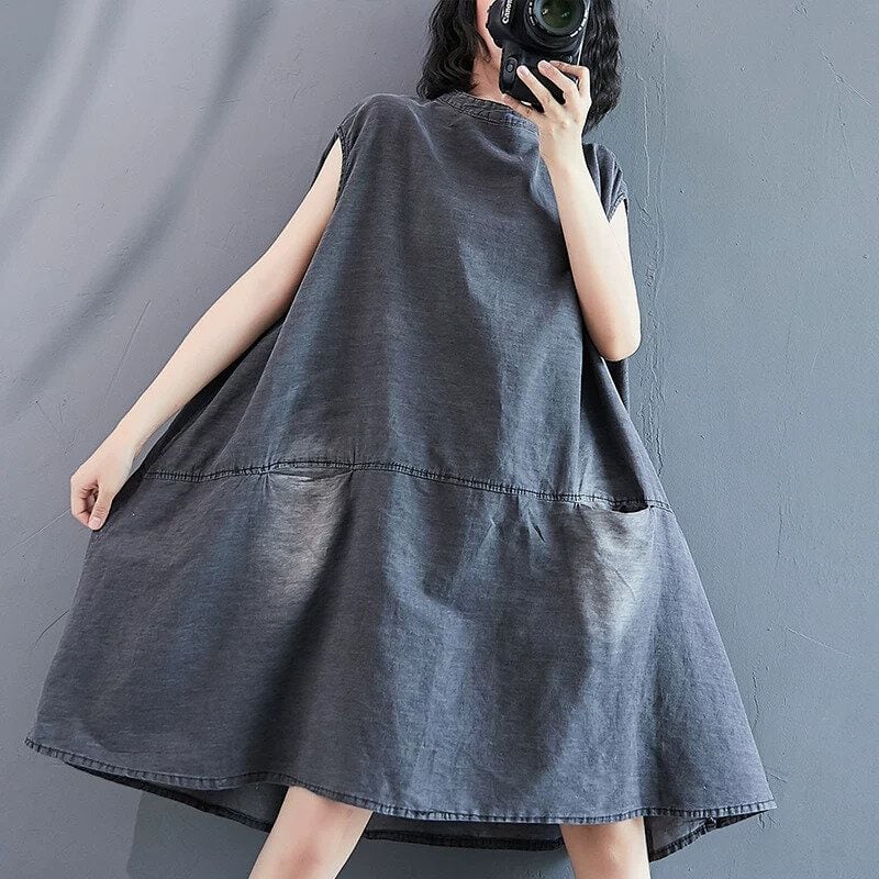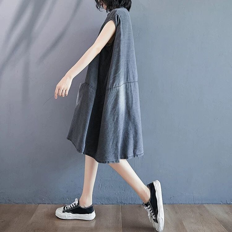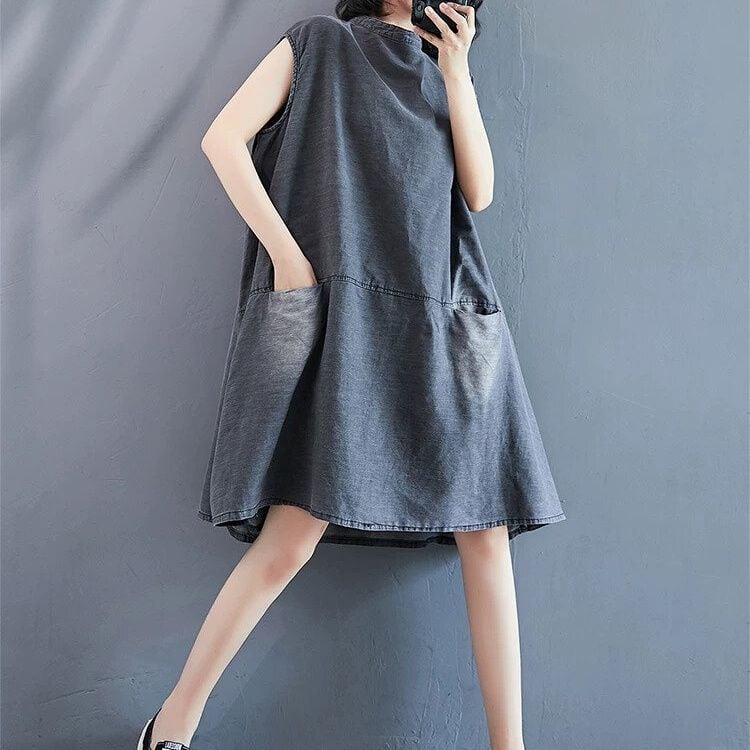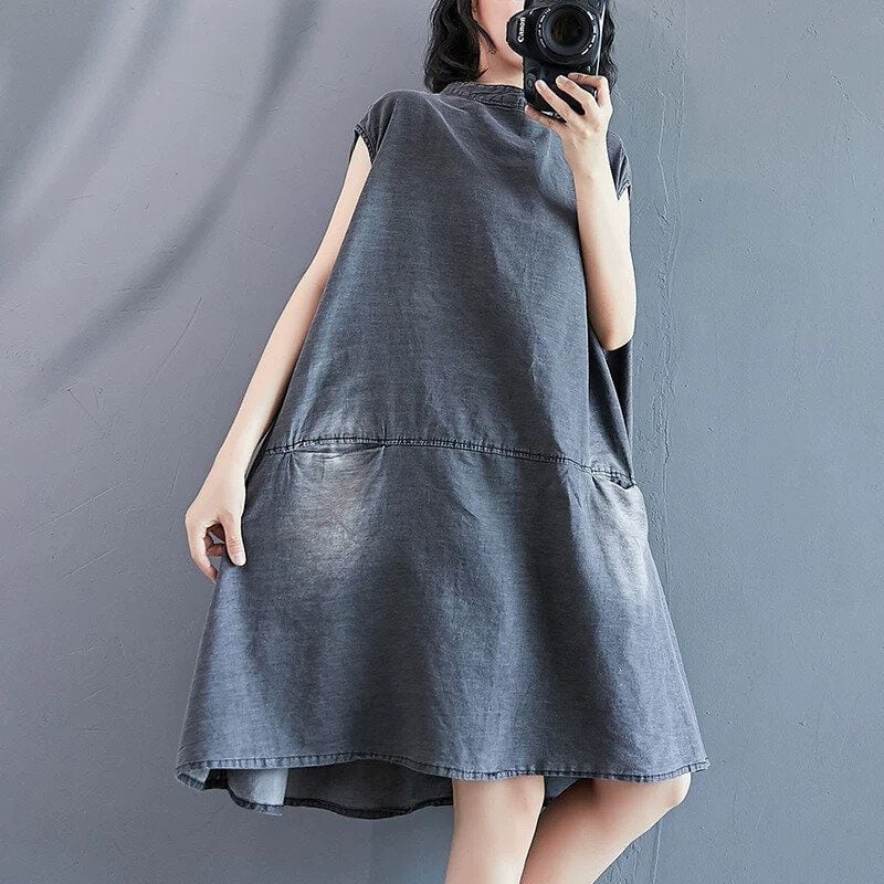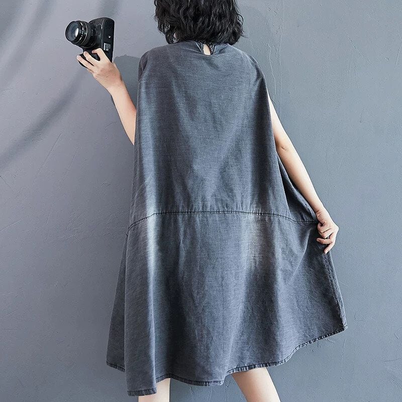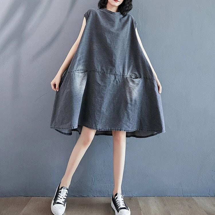 色落ち加工をほどこしたグレーのデニム生地がお洒落な、スタンドカラー・ノースリーブ・ひざ上丈のデザインワンピースです。ワイド幅のAラインシルエットで、シンプルなデザインがクールな印象のカジュアルアイテムです。