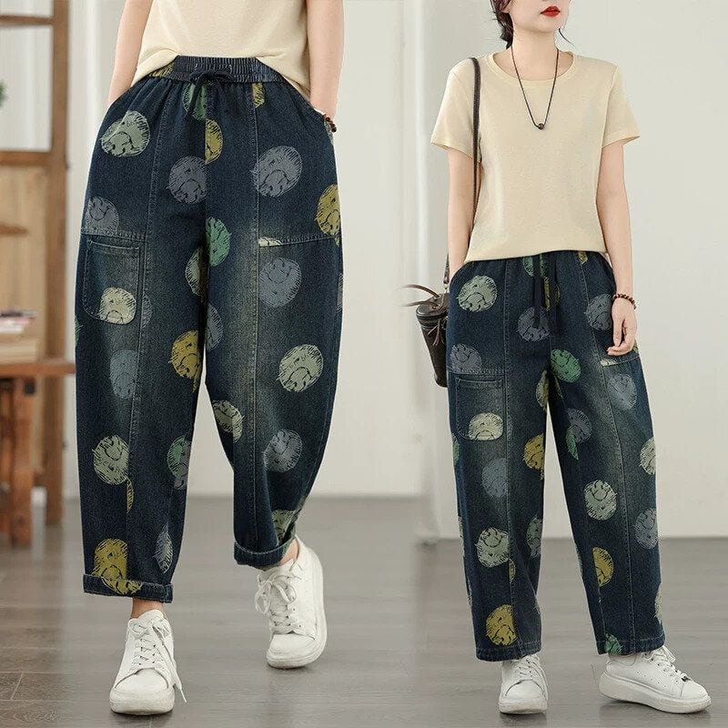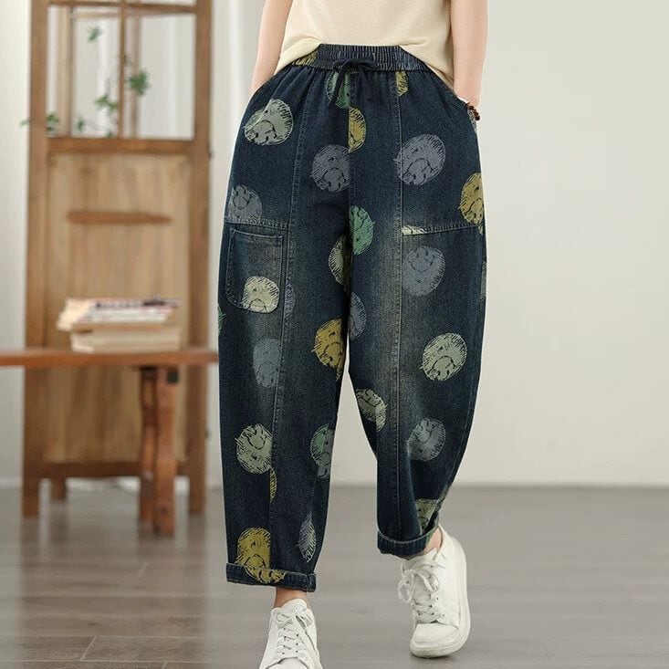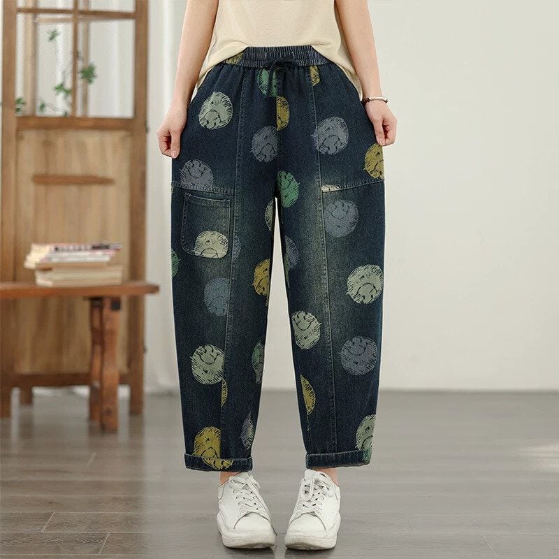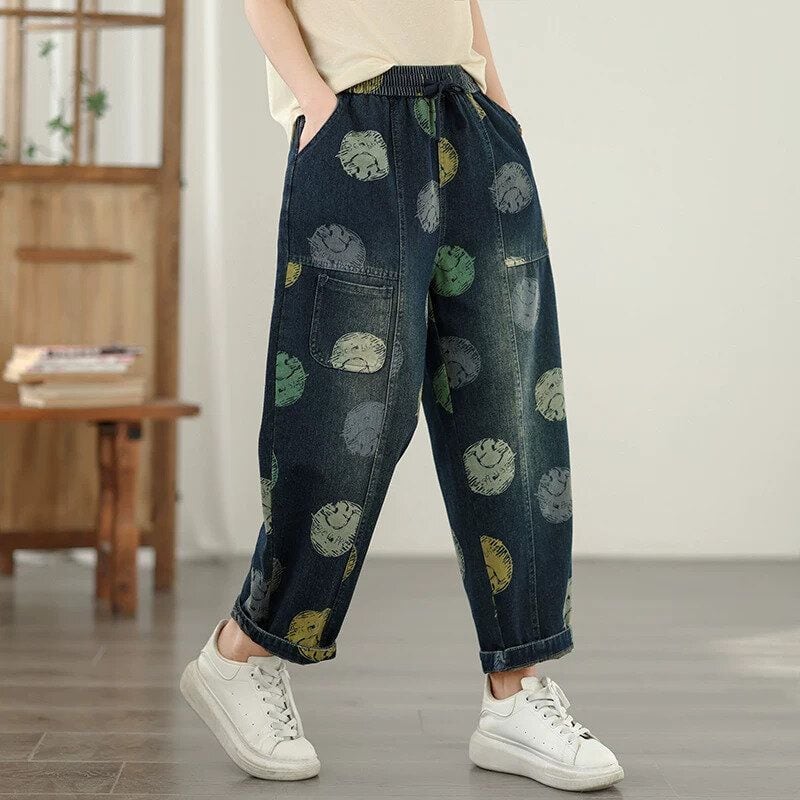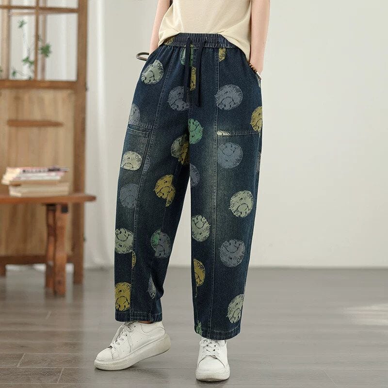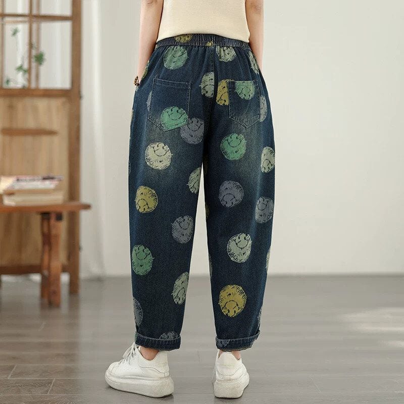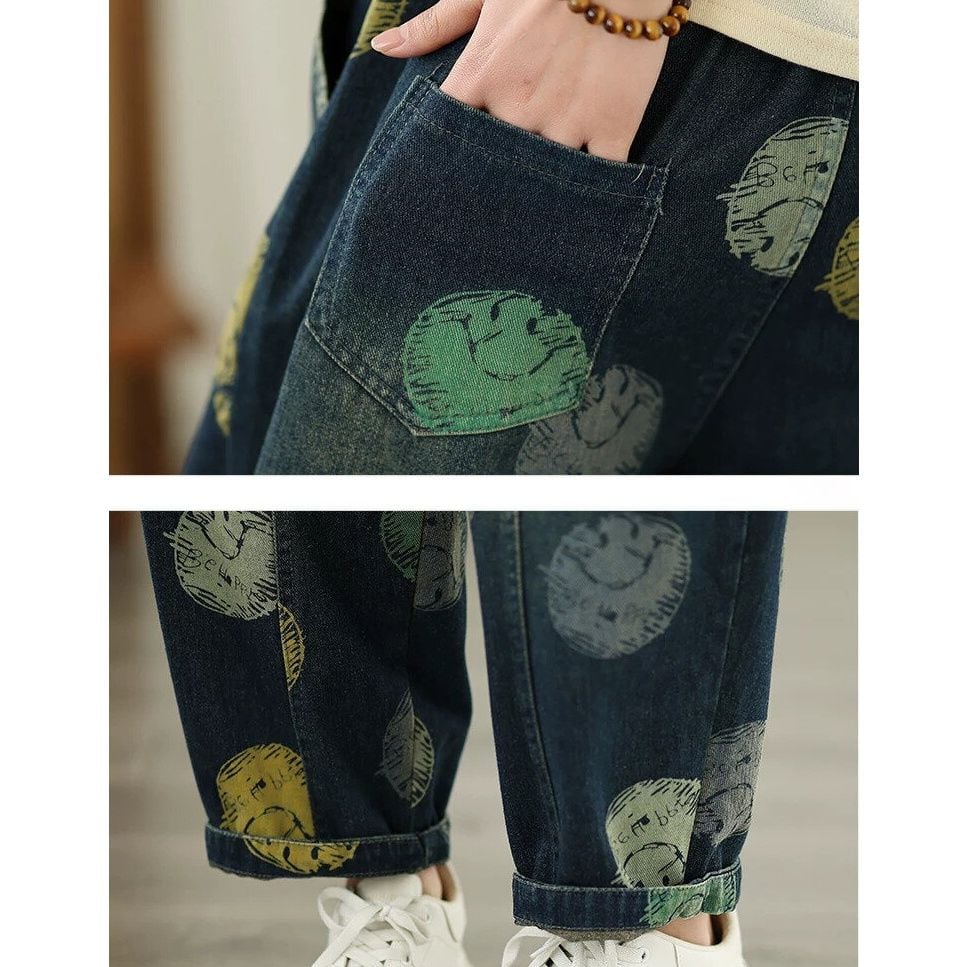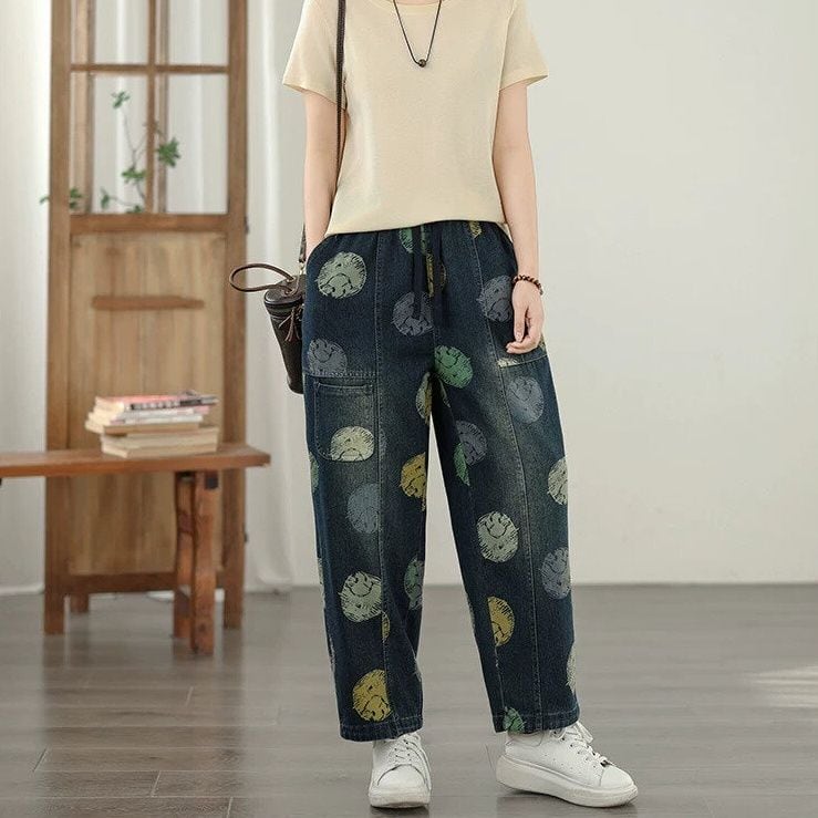 スマイルのイラストで作るマルチカラーのドット柄がキュートな、キャロットシルエットのデニムパンツです。ウエストはゴム+ドローストリングで、履き心地が良いです。スティッチラインや小さなポケットがお洒落な、コーディネートの主役になる目を惹くアイテムです。