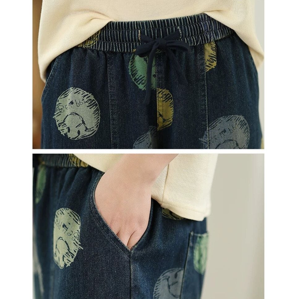PRINT DRAWSTRING WAIST WIDE DENIM PANTS 1color M-16152