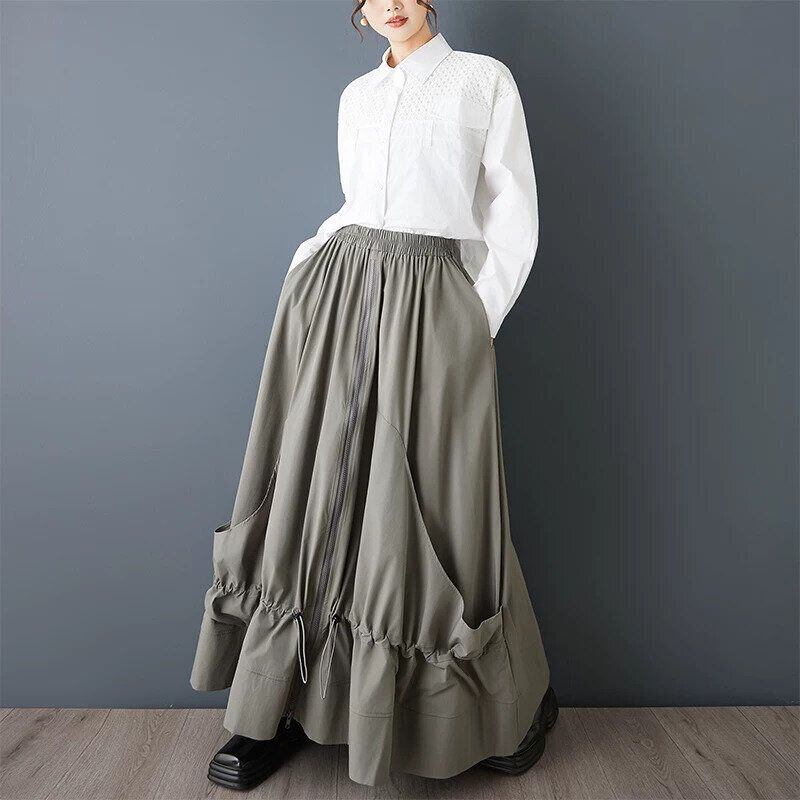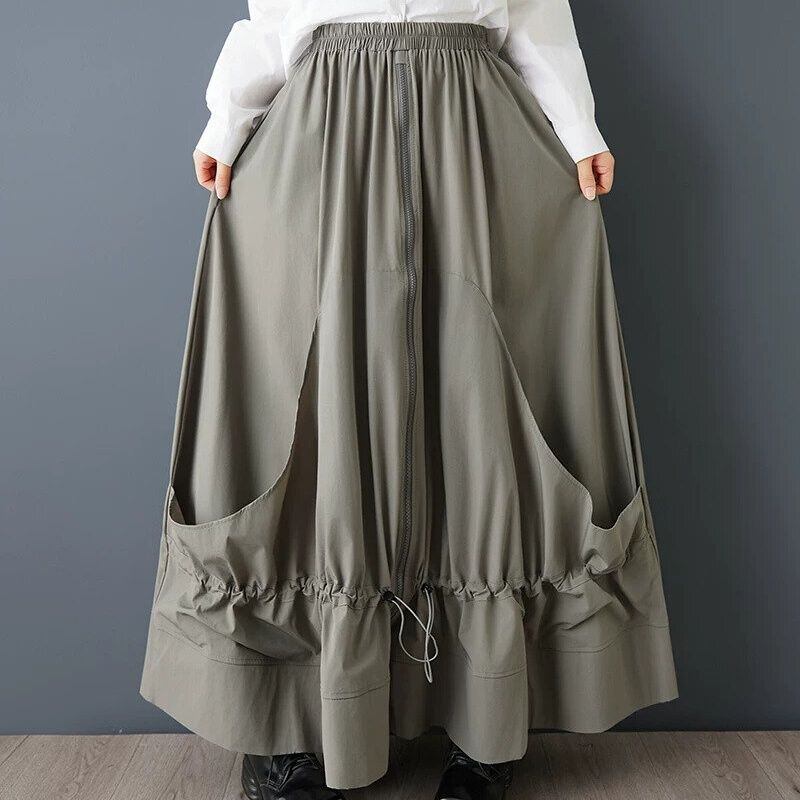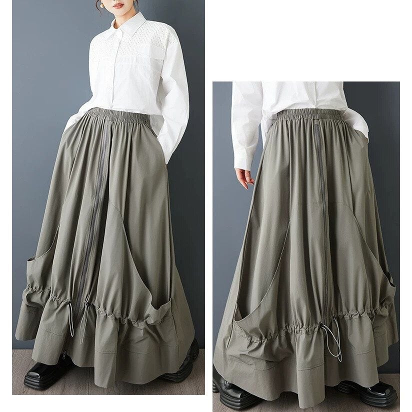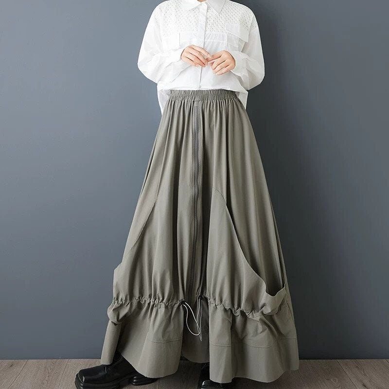 ドローコードが付いたスティッチが作り出すシルエットが魅力的な、Aライン・フルジップ・ロング丈のデザインスカートです。ウエストはゴムなので、着脱が簡単で履き心地が良いです。単色でどんなトップスとも合わせやすい、ドレープが美しいアイテムです。