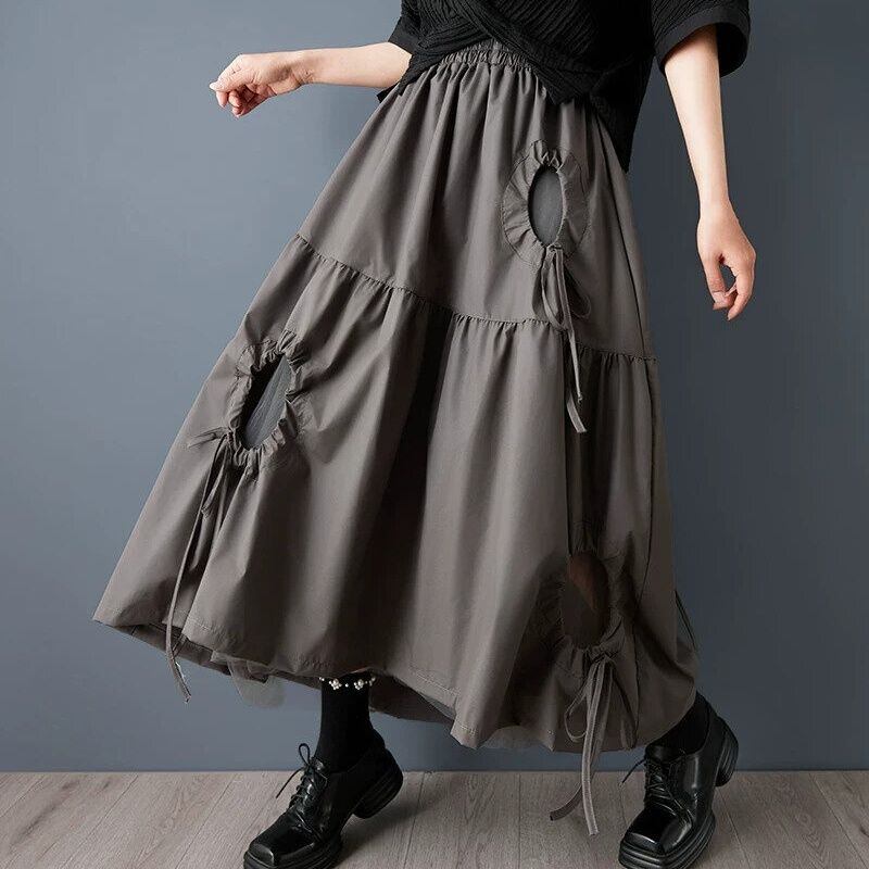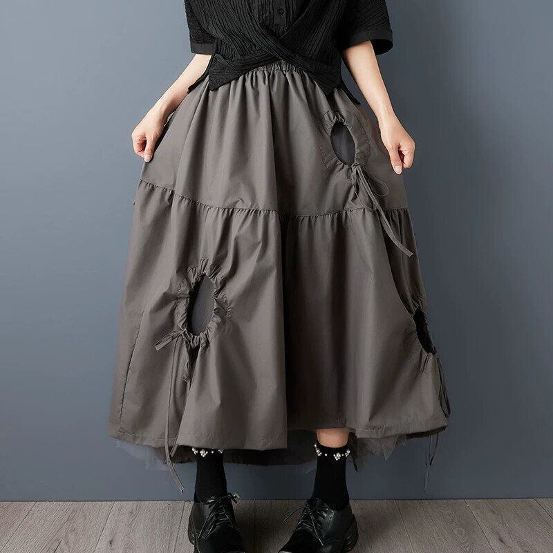 ドローストリングで縁取られたメッシュのホールがキュートな、Aライン・膝下丈のデザインスカートです。ウエストはゴムなので、着脱が簡単で履き心地が良いです。ふんわりとしたシルエットが魅力的な、コーディネートしやすいカジュアルアイテムです。ブラックとグレーの2色から選べます。