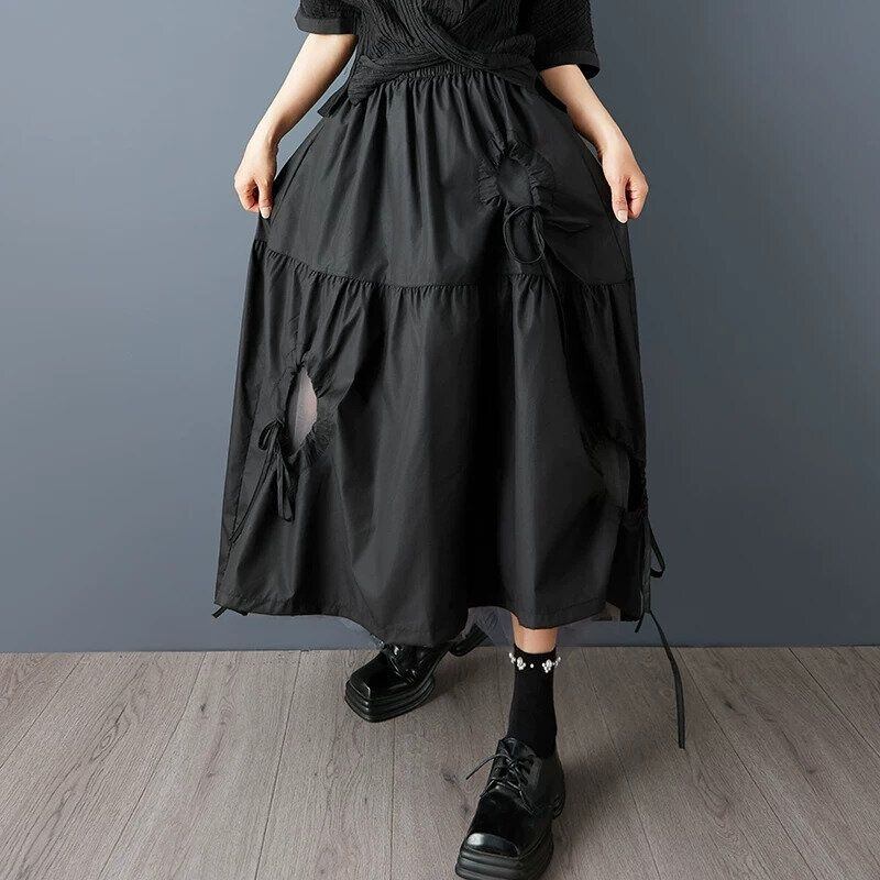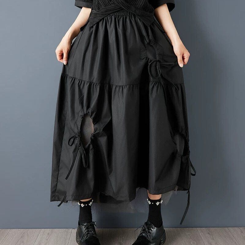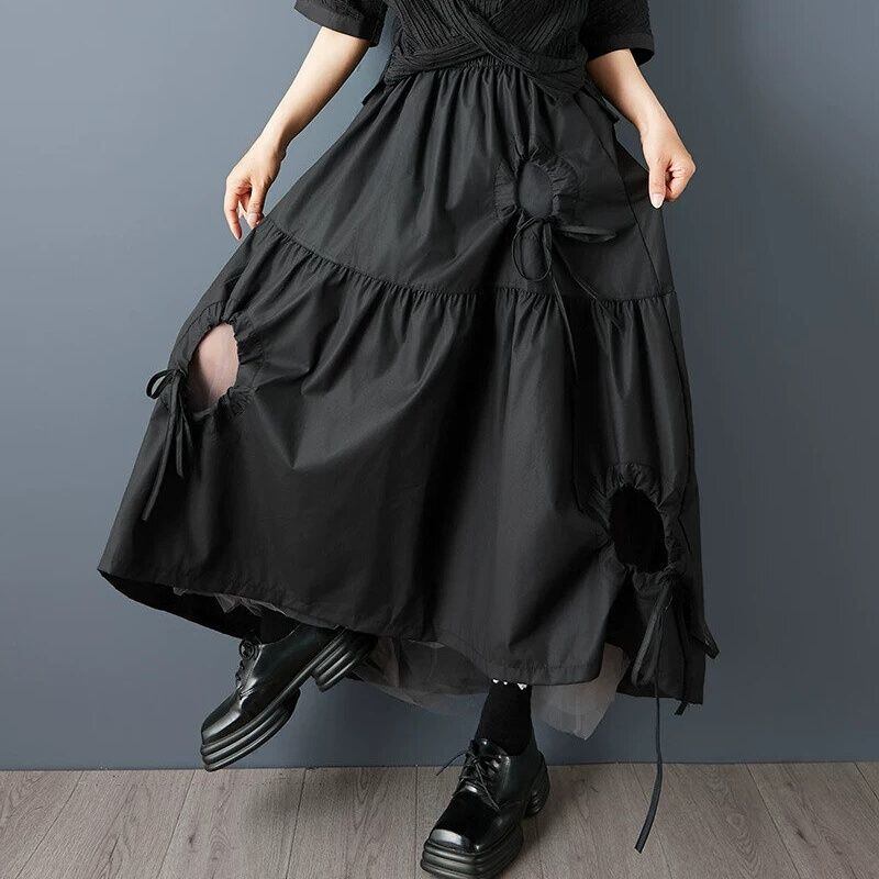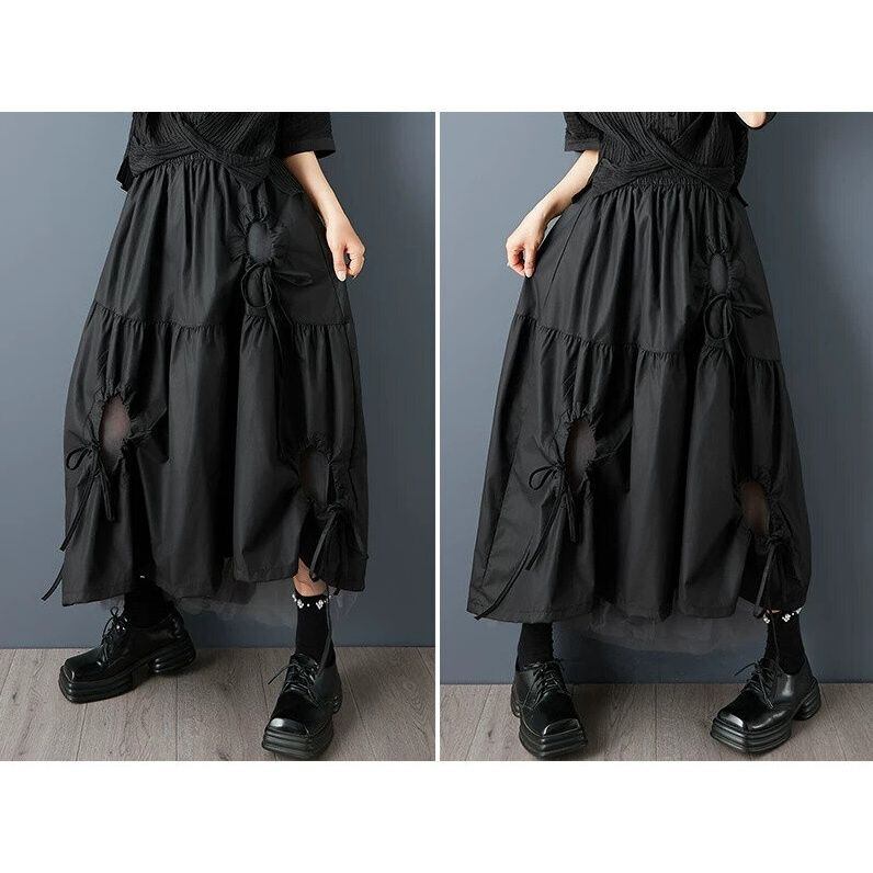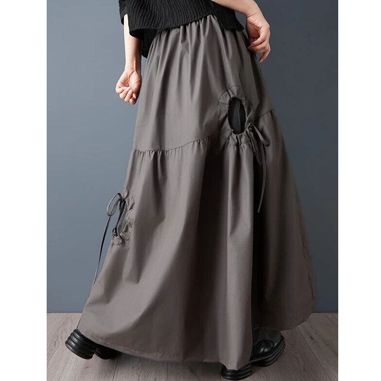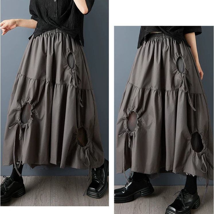 SOLID HOLE DESIGN A-LINE LONG SKIRT 2colors M-16178