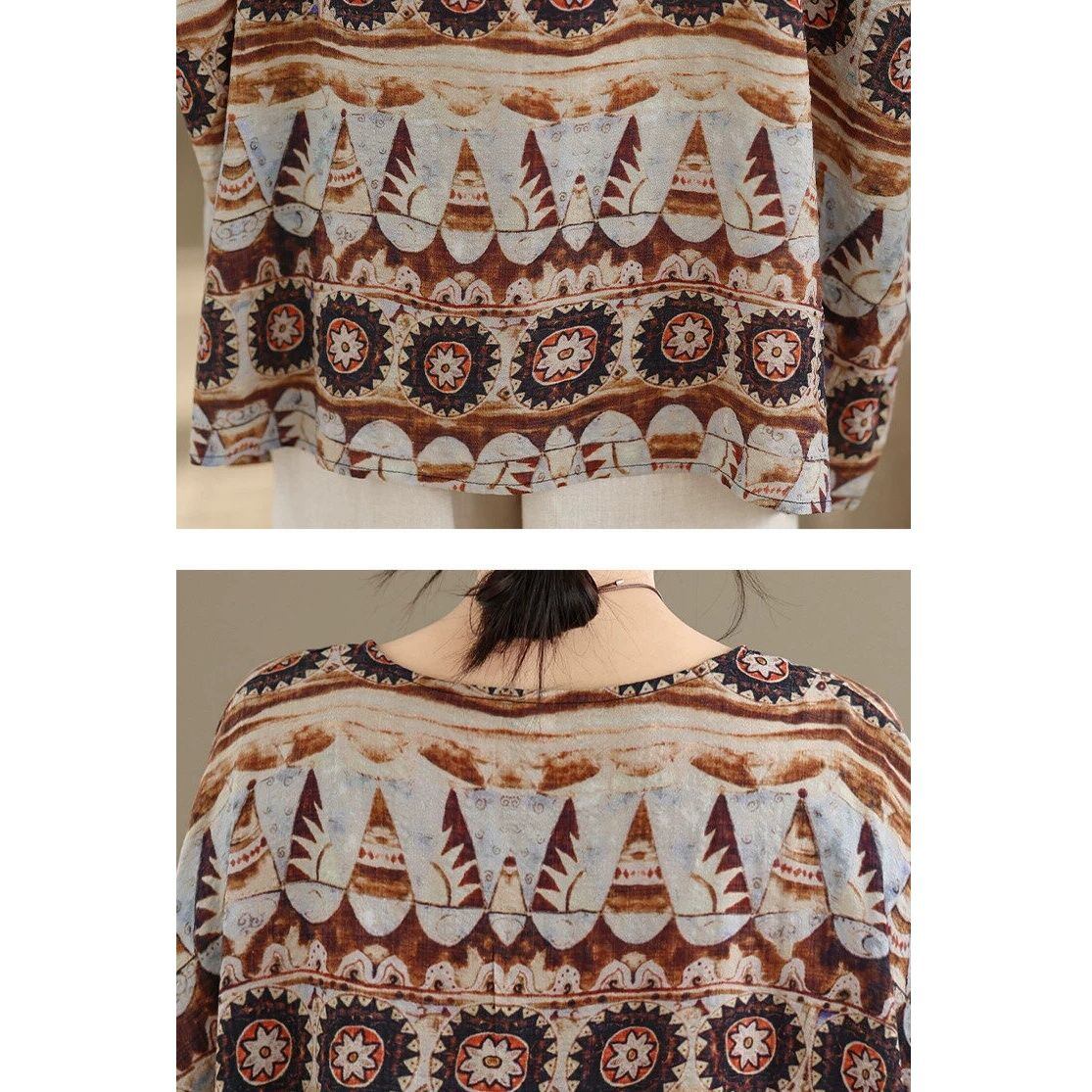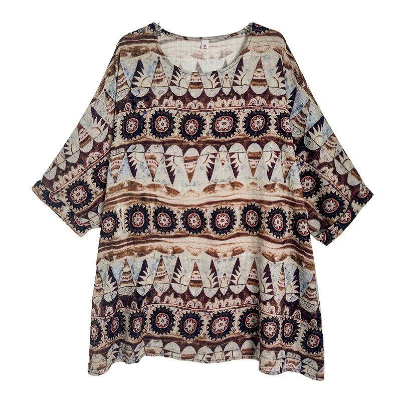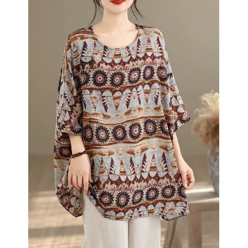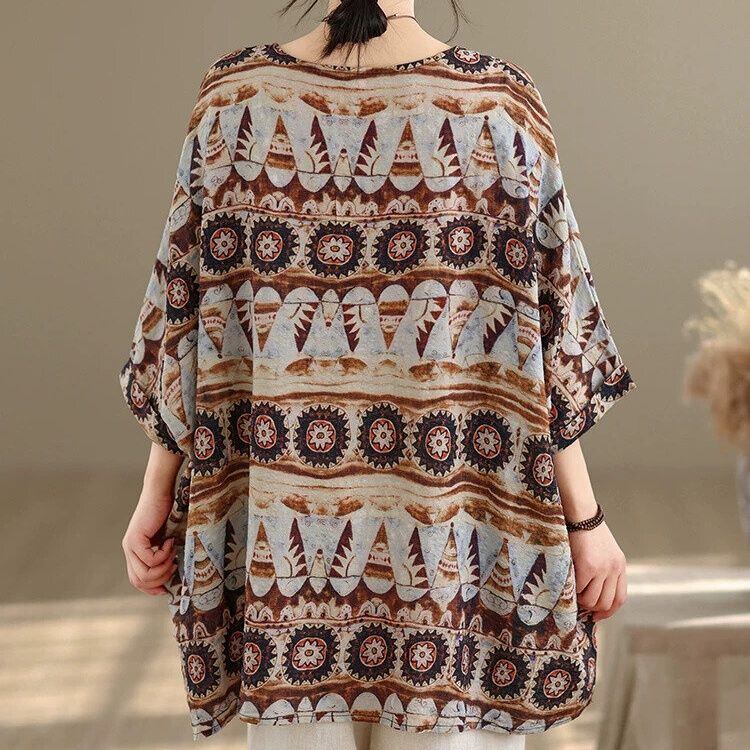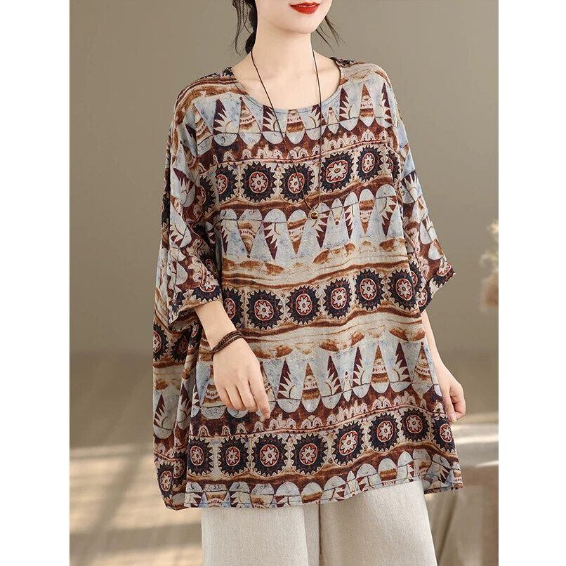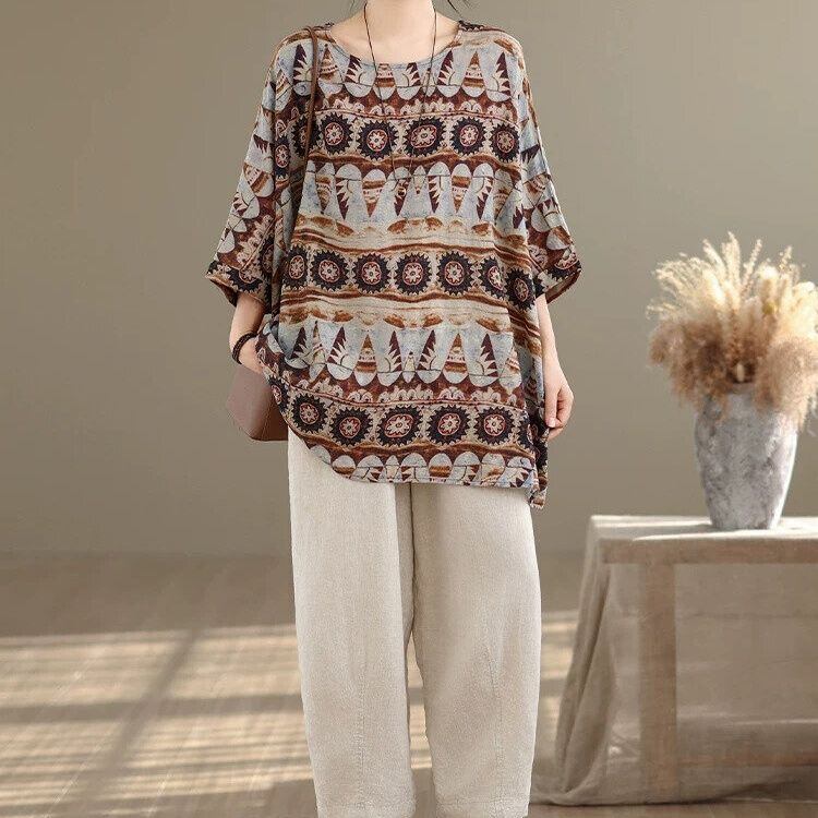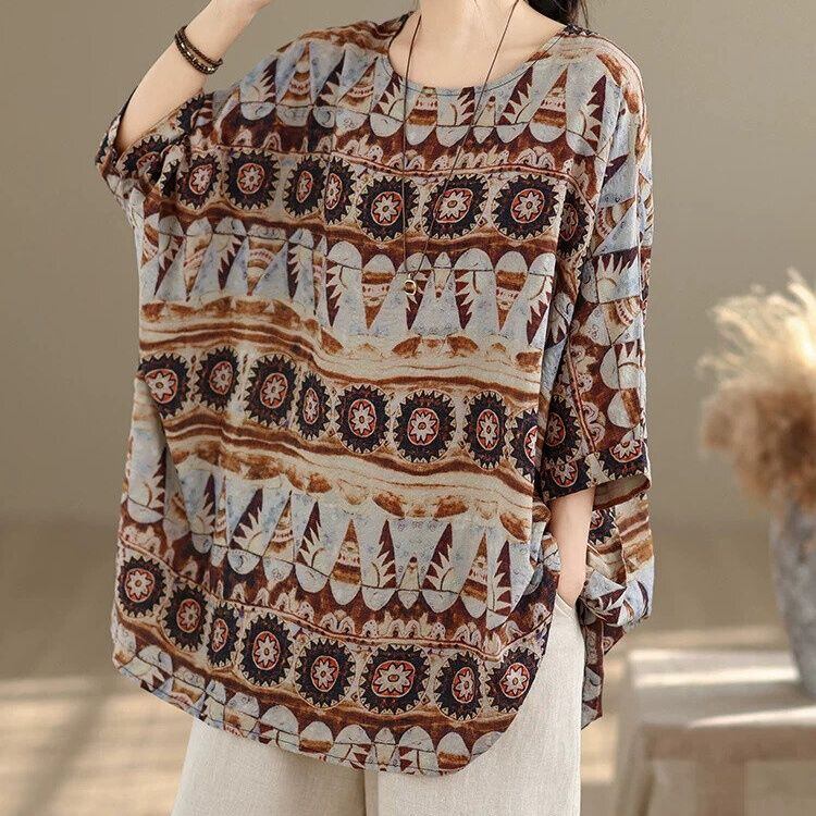 エスニックな柄生地が魅力的な、ボートネック・7分袖・チュニック丈のプルオーバートップです。ゆったりとしたワイド幅のシルエットがボディラインをカバーする、リラックスした印象のカジュアルアイテムです。