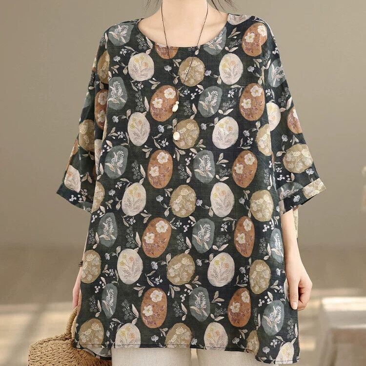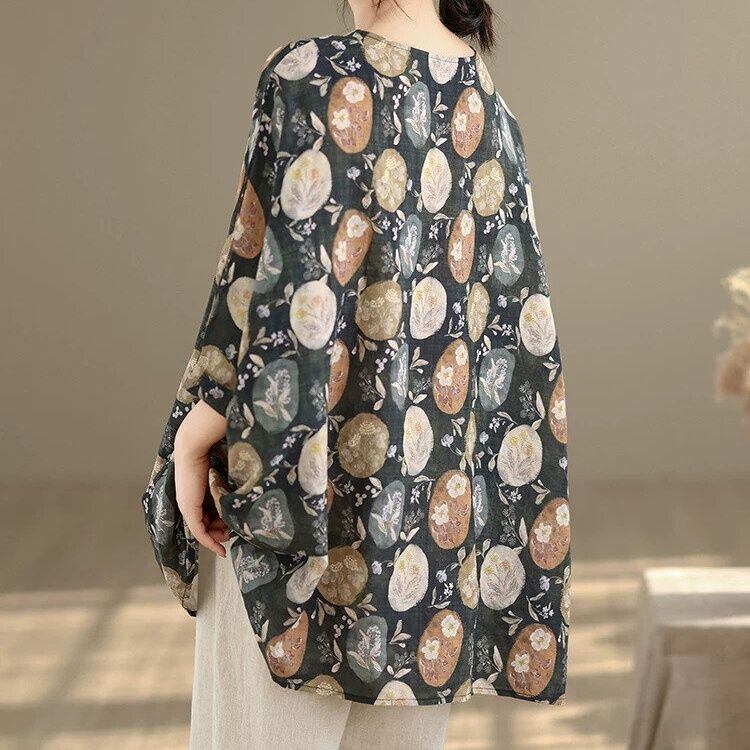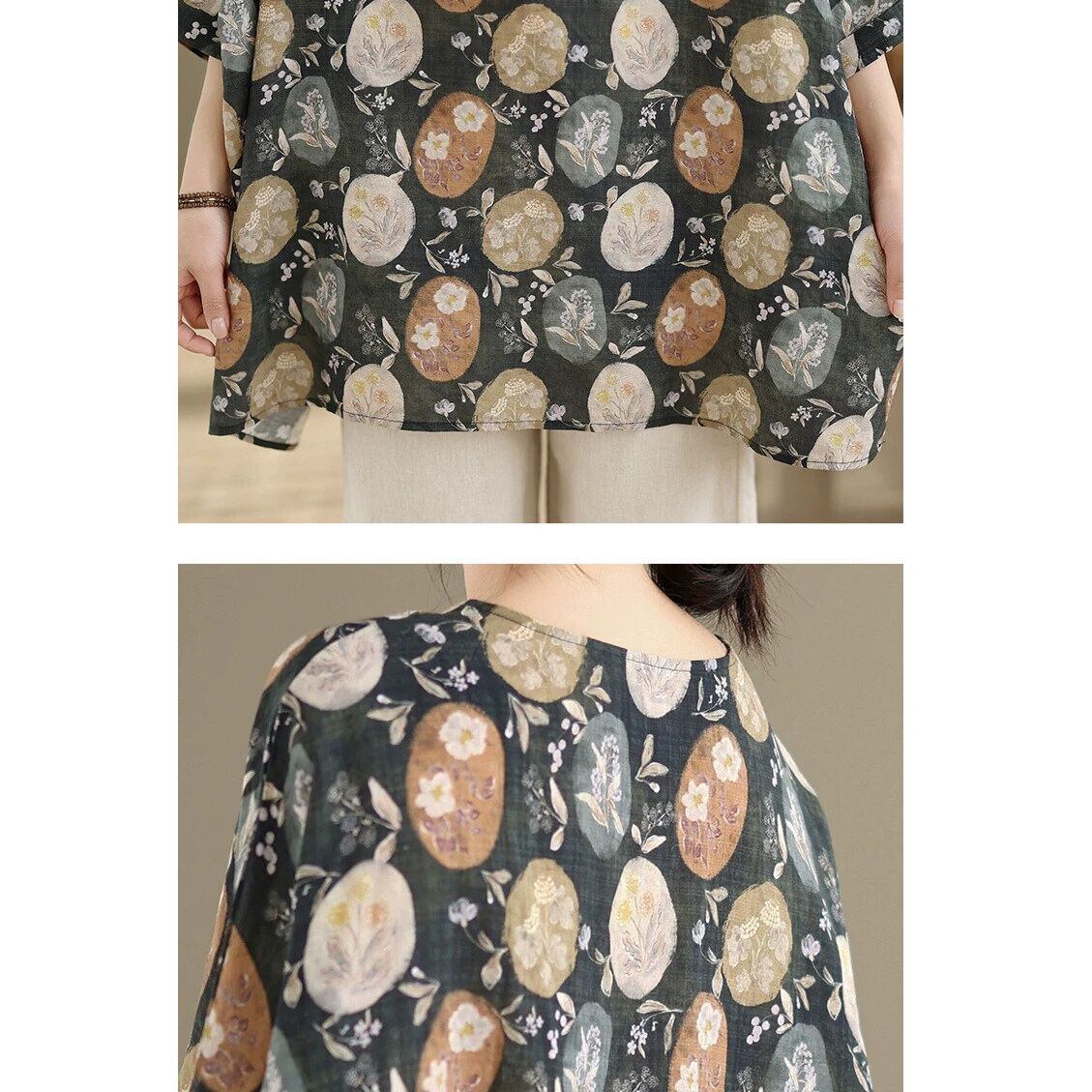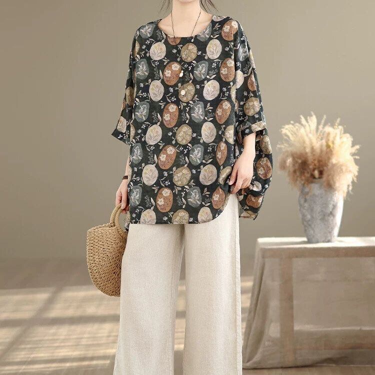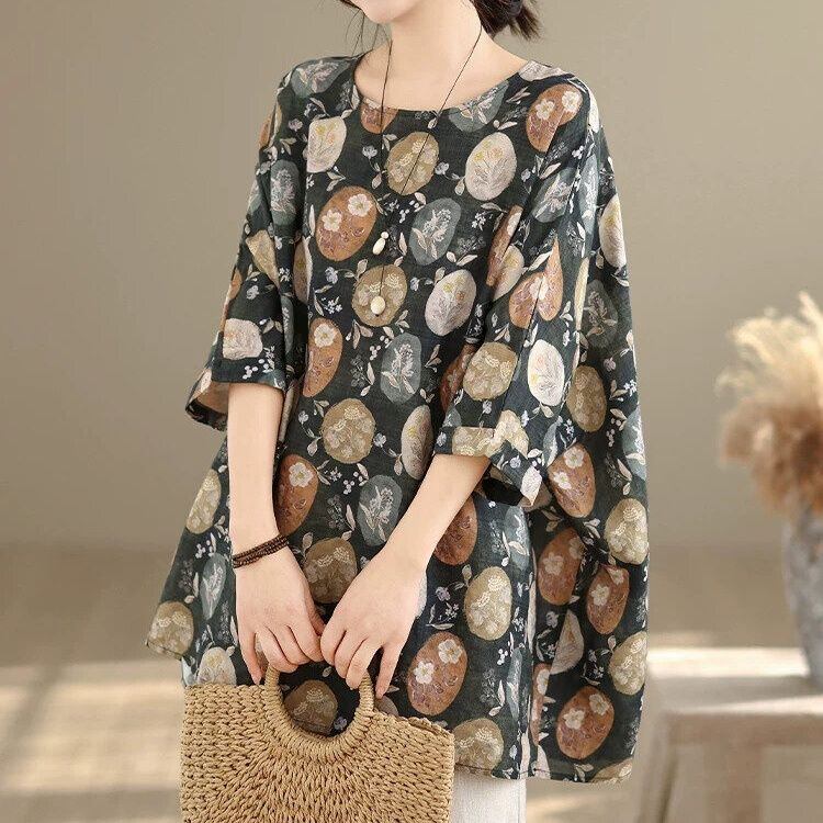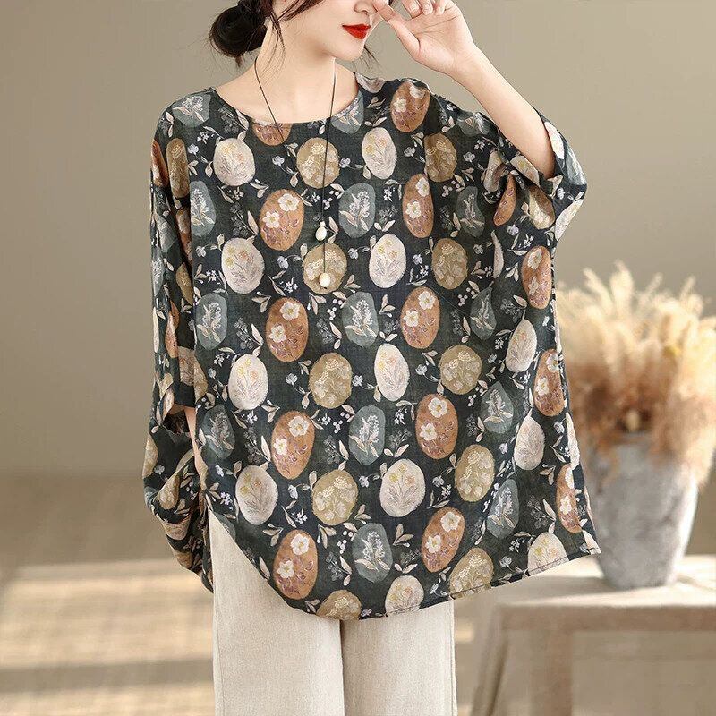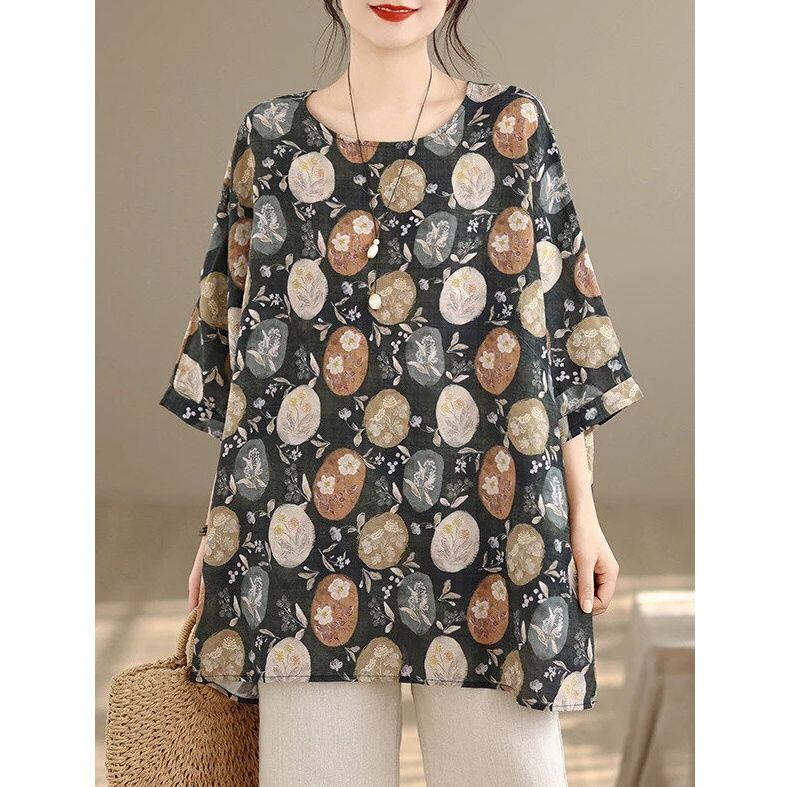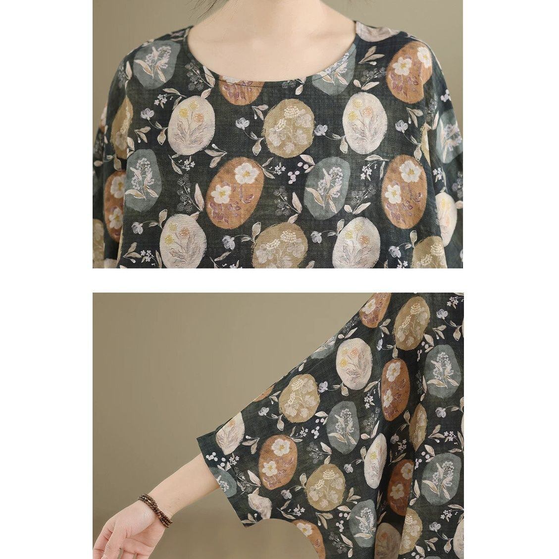 アーティスティックな花×ドット柄が魅力的な、ボートネック・7分袖・チュニック丈のプルオーバートップです。ゆったりとしたワイド幅のシルエットがボディラインをカバーする、リラックスした印象のカジュアルアイテムです。