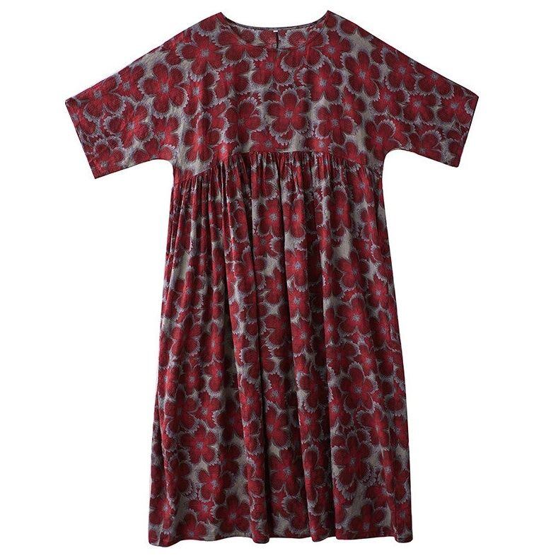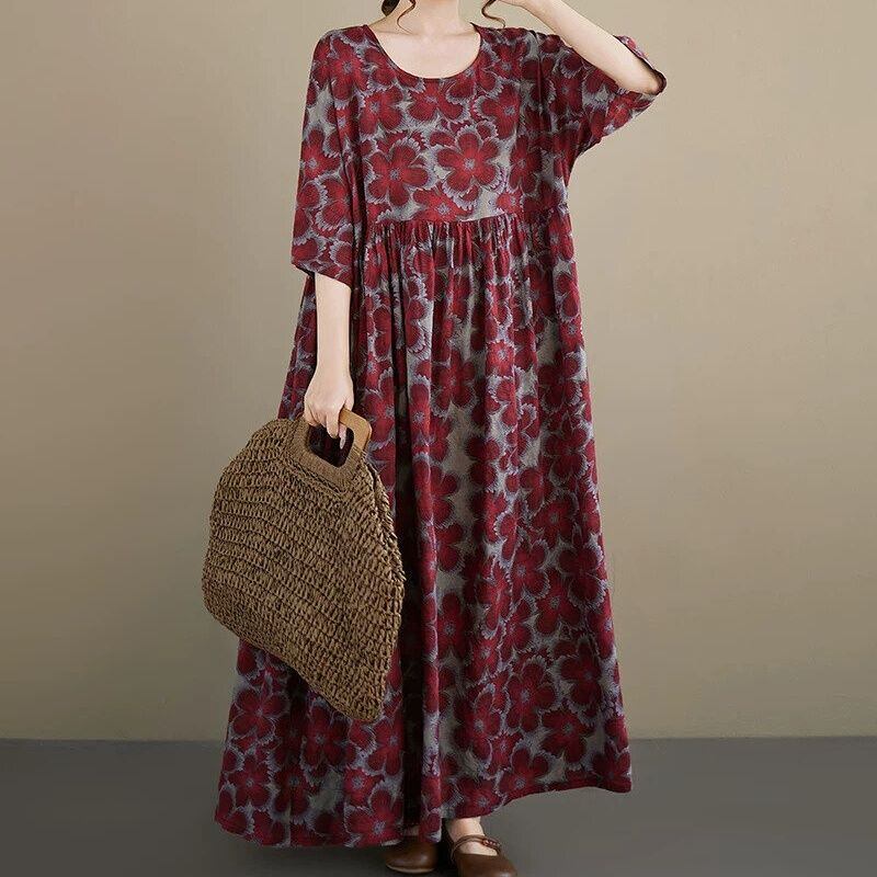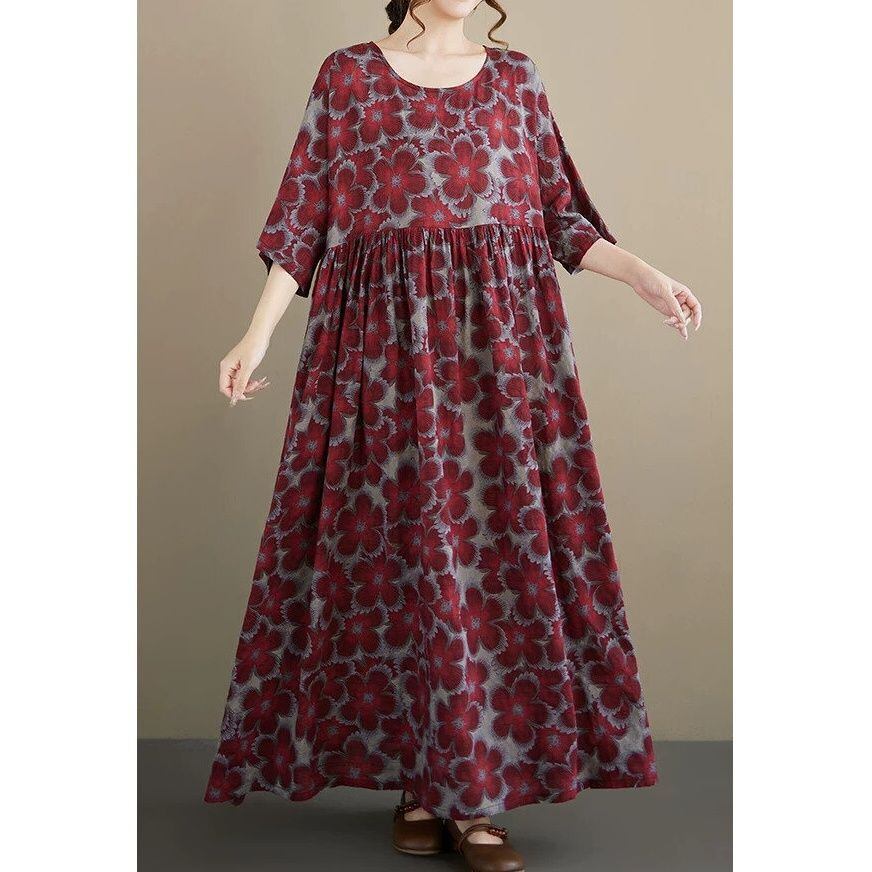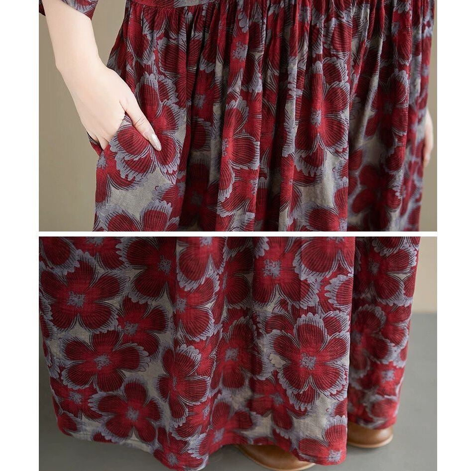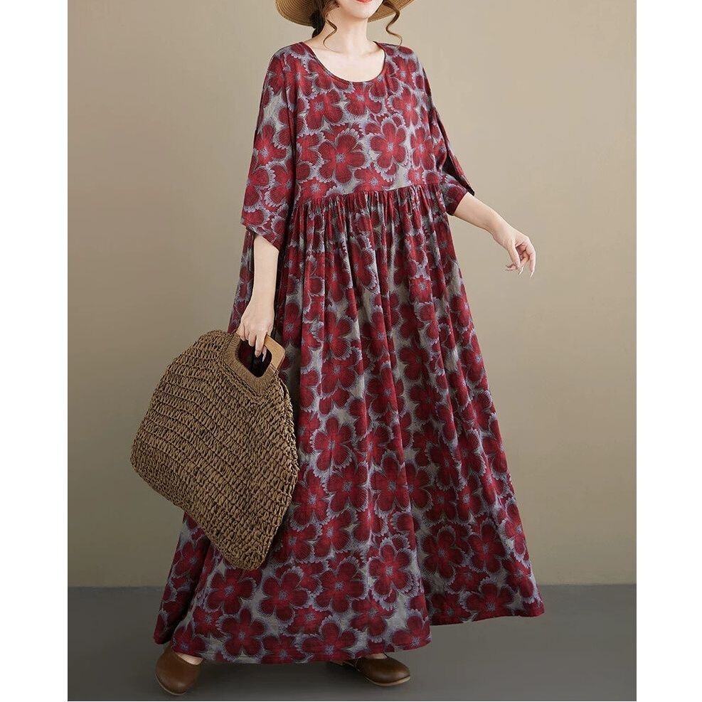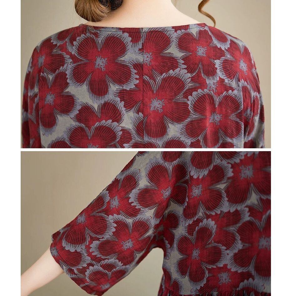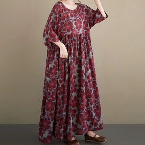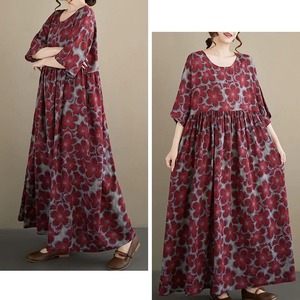 レッドとグレーの花柄生地が目を惹く、ボートネック・7分袖・マキシ丈のプルオーバーワンピースです。胸下の切り返しでギャザー加工された、ゆったりとしたシルエットがエレガントなカジュアルアイテムです。