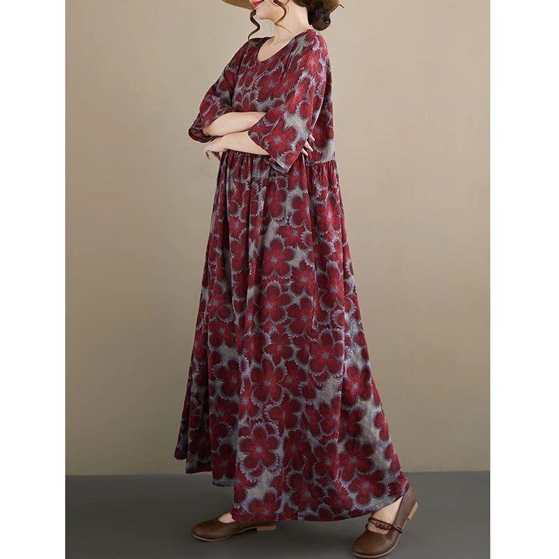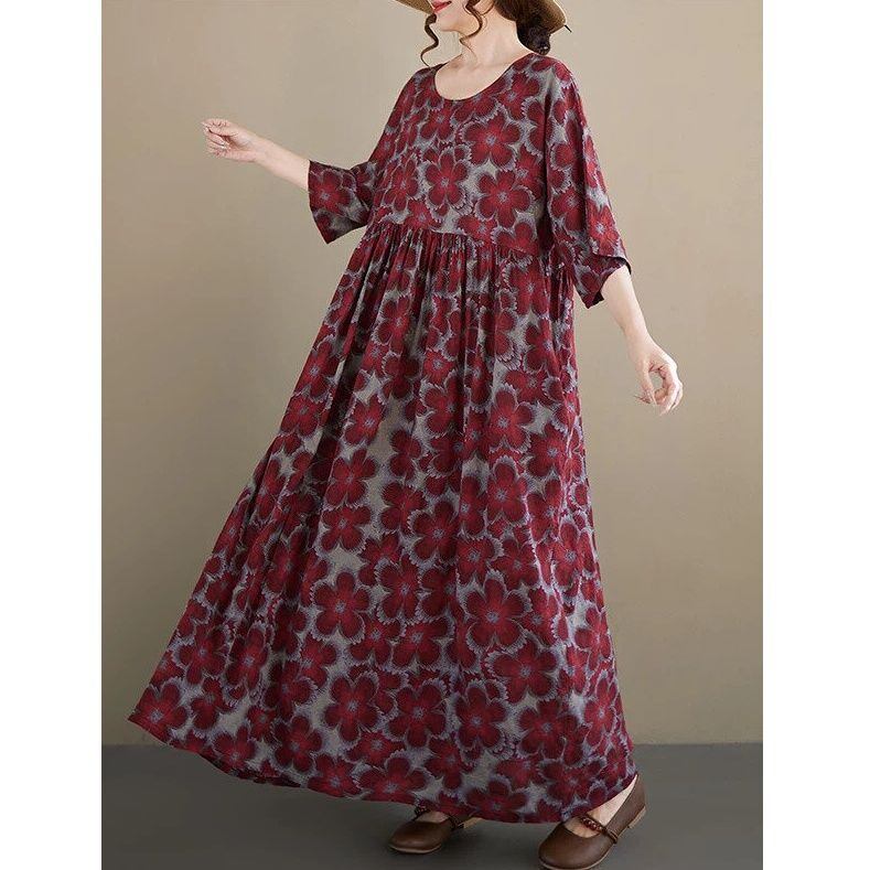 FLOWER PRINT BOAT NECK 3/4 SLEEVES A-LINE MAXI DRESS 1color M-16205