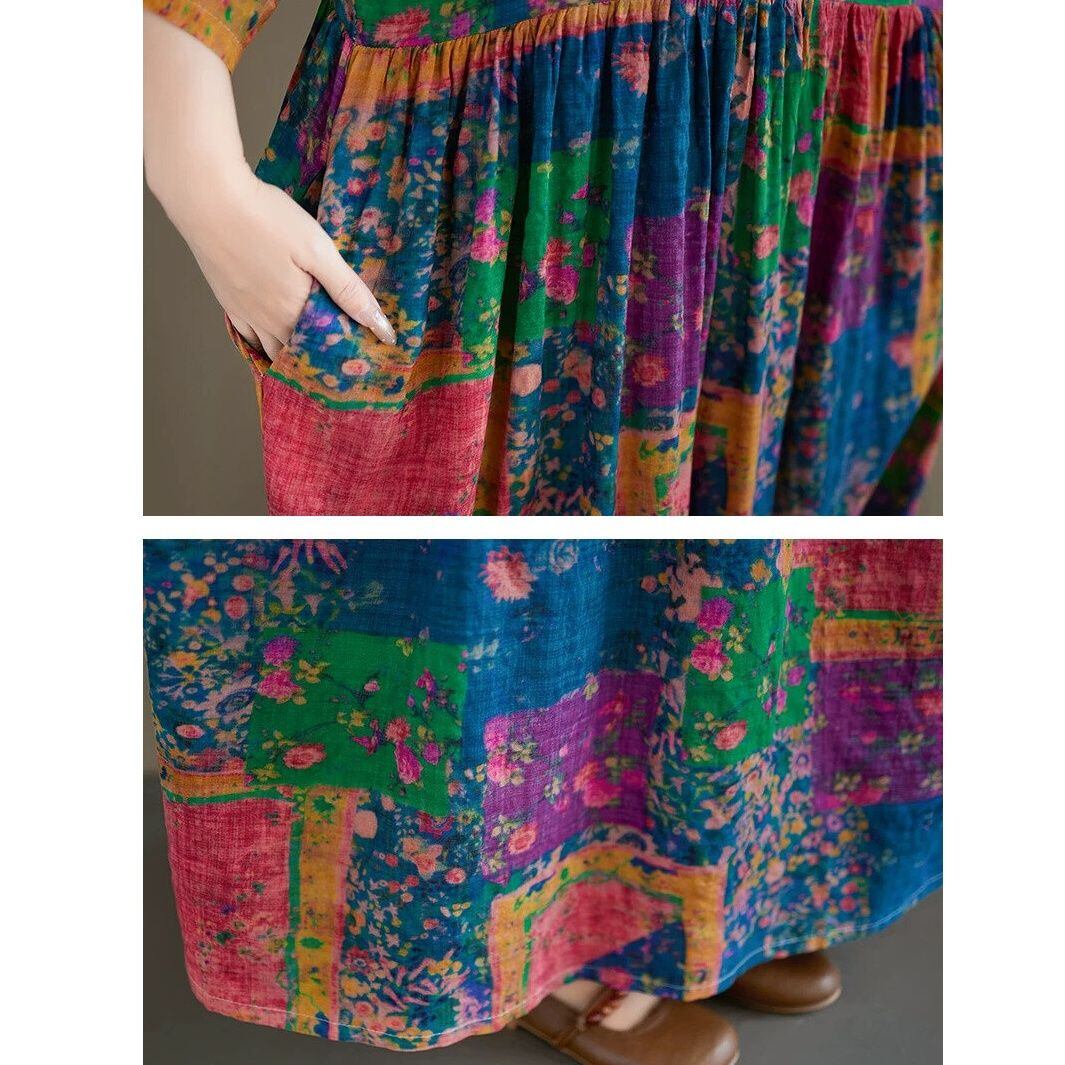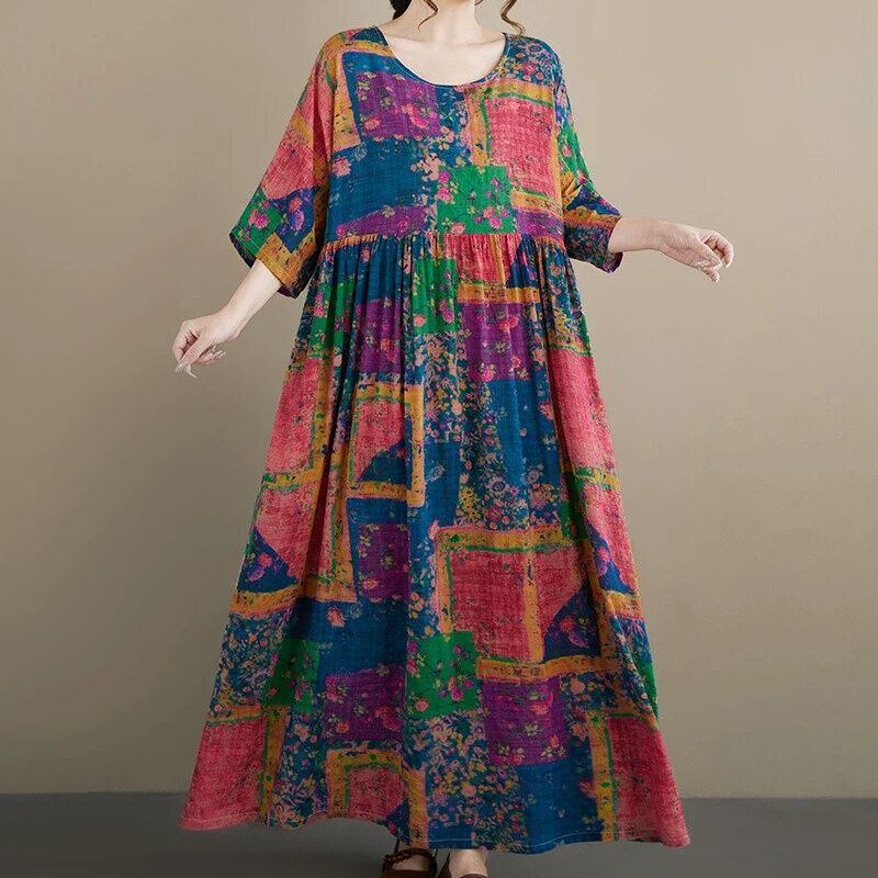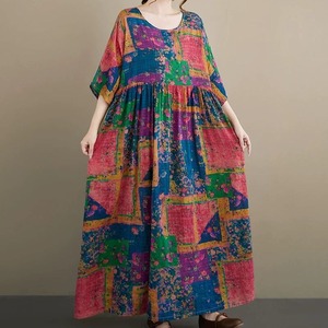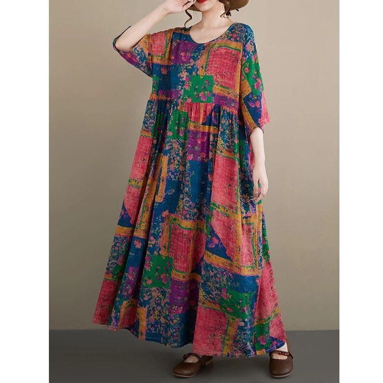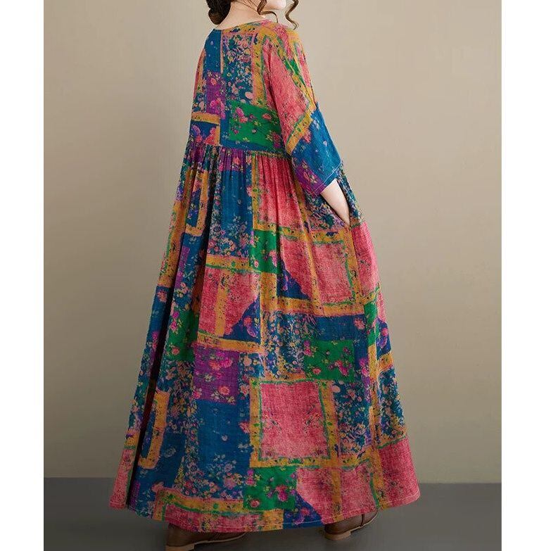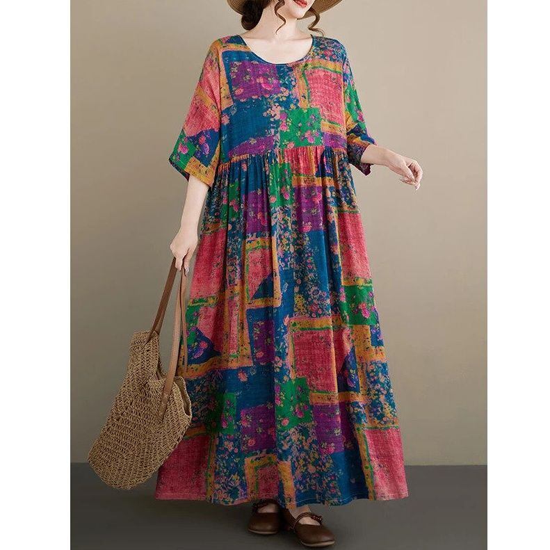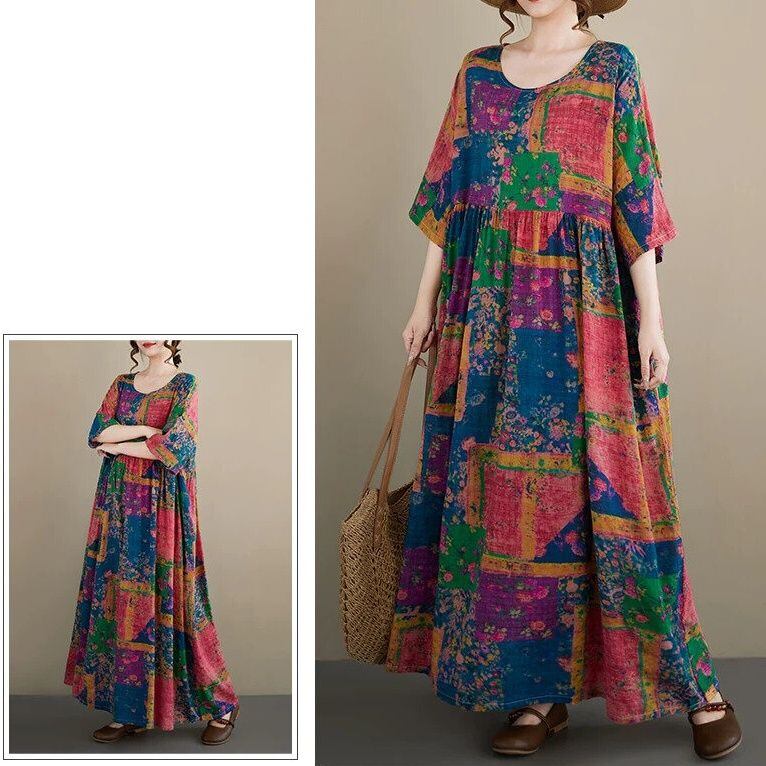 PATCHWORK PRINT BOAT NECK 3/4 SLEEVES A-LINE MAXI DRESS 1color M-16210