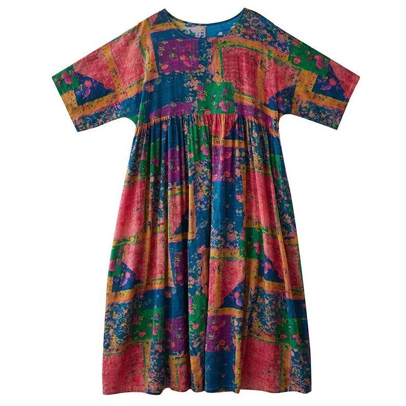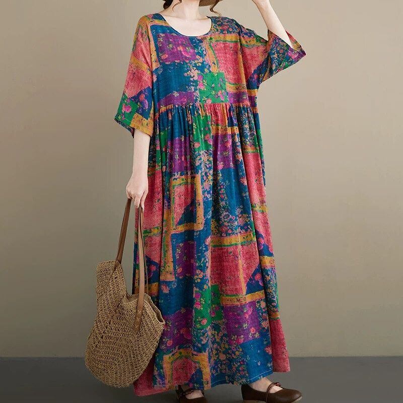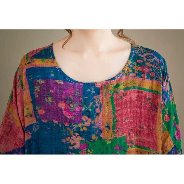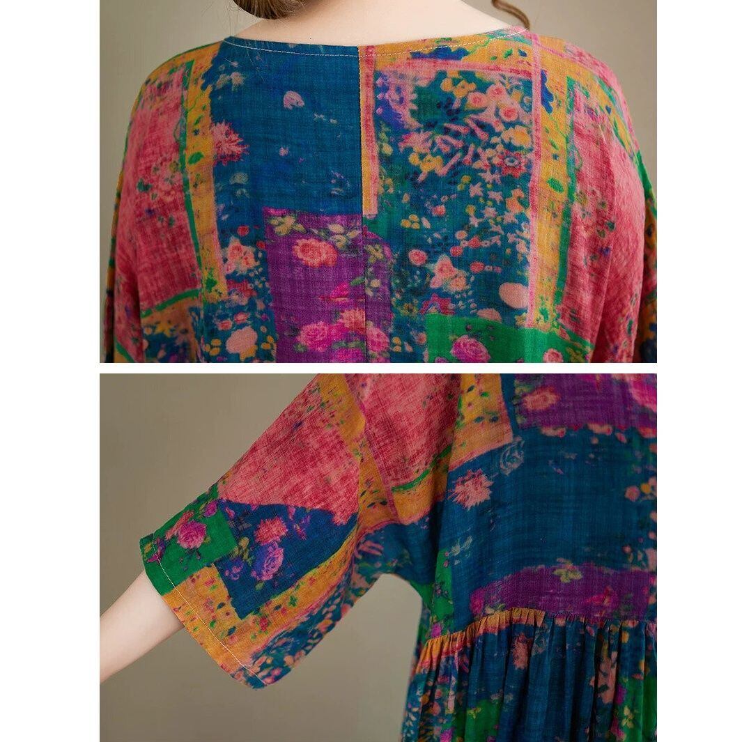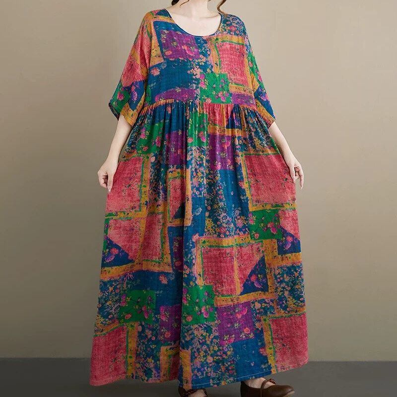 PATCHWORK PRINT BOAT NECK 3/4 SLEEVES A-LINE MAXI DRESS 1color M-16210