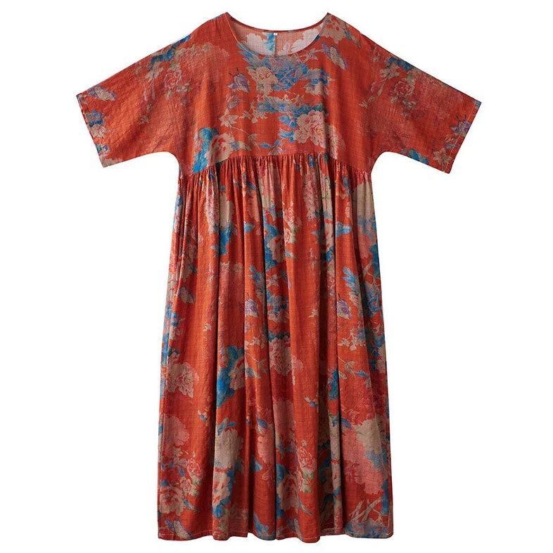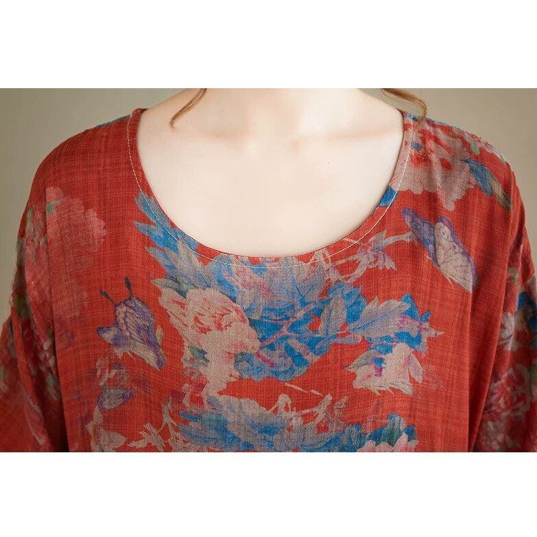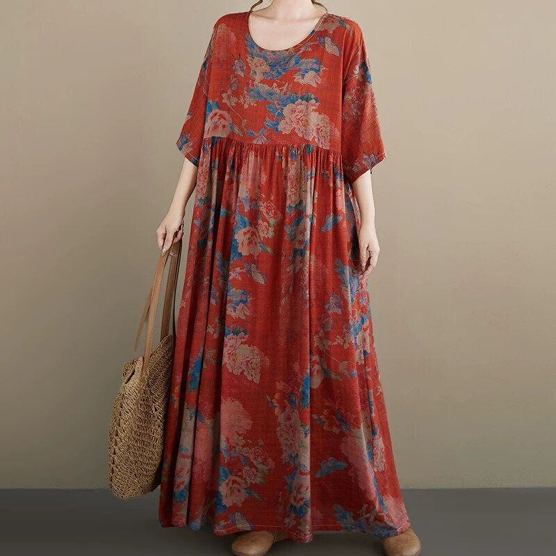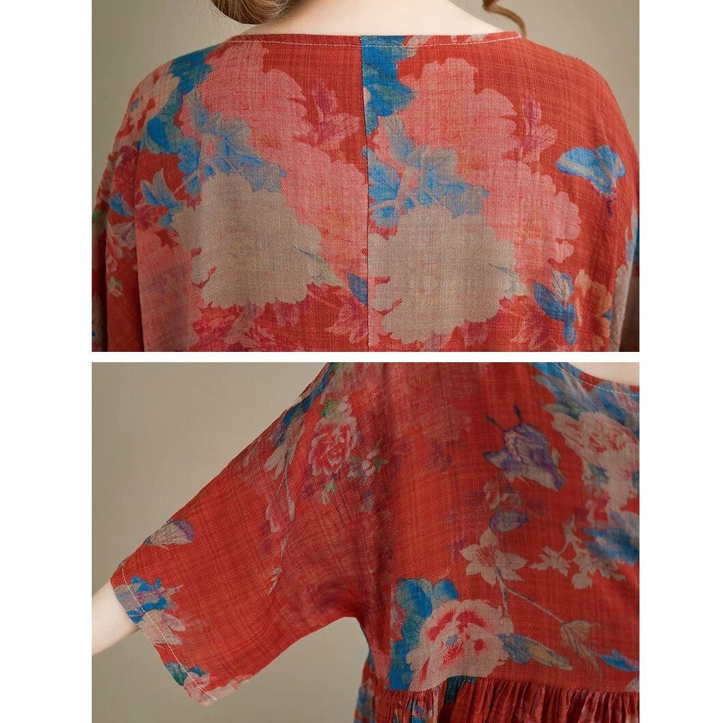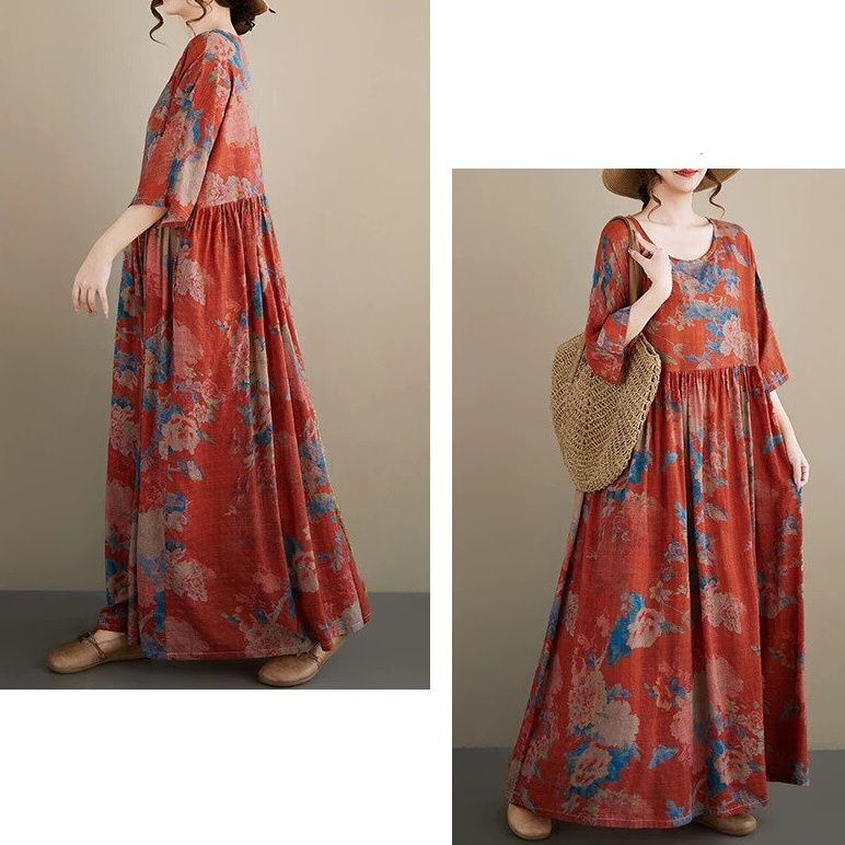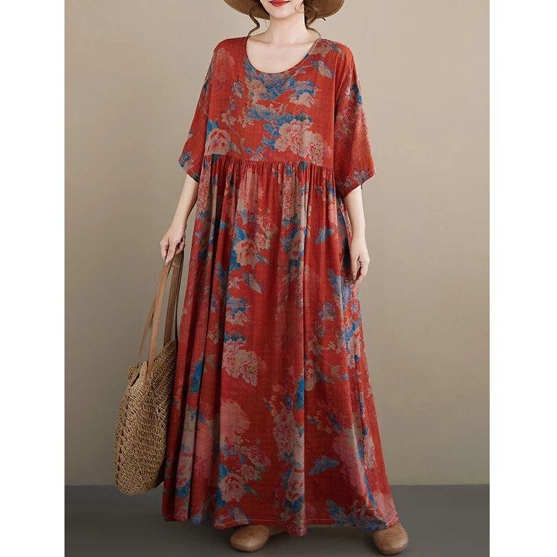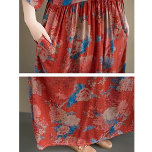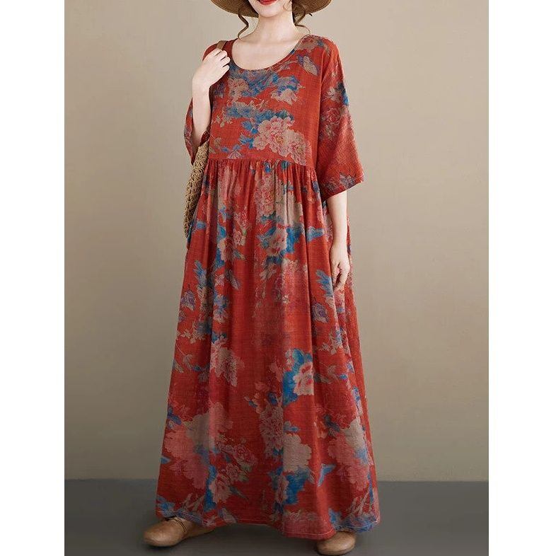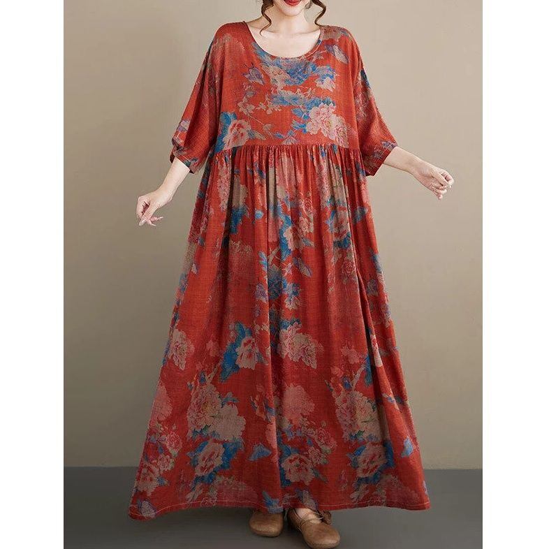 くすんだレッドのレトロな花柄素材がお洒落な、ボートネック・7分袖・マキシ丈のプルオーバーワンピースです。胸下の切り返しでギャザー加工された、ゆったりとしたシルエットがエレガントなカジュアルアイテムです。