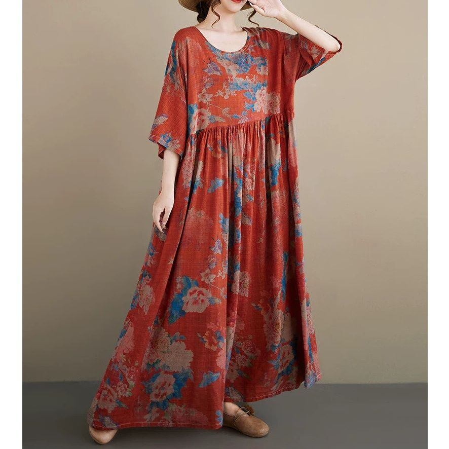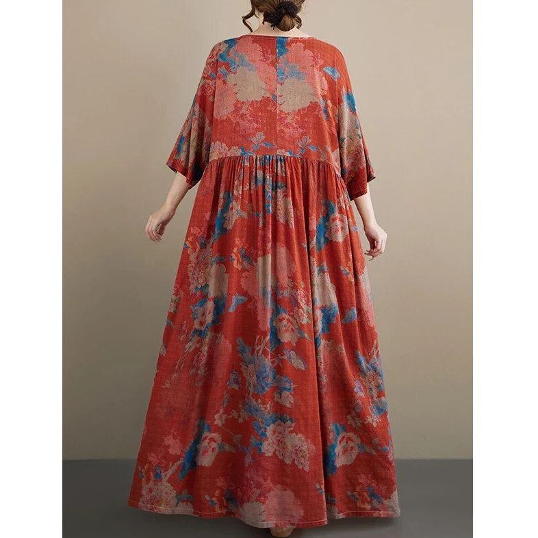FLOWER PRINT BOAT NECK 3/4 SLEEVES A-LINE MAXI DRESS 1color M-16212