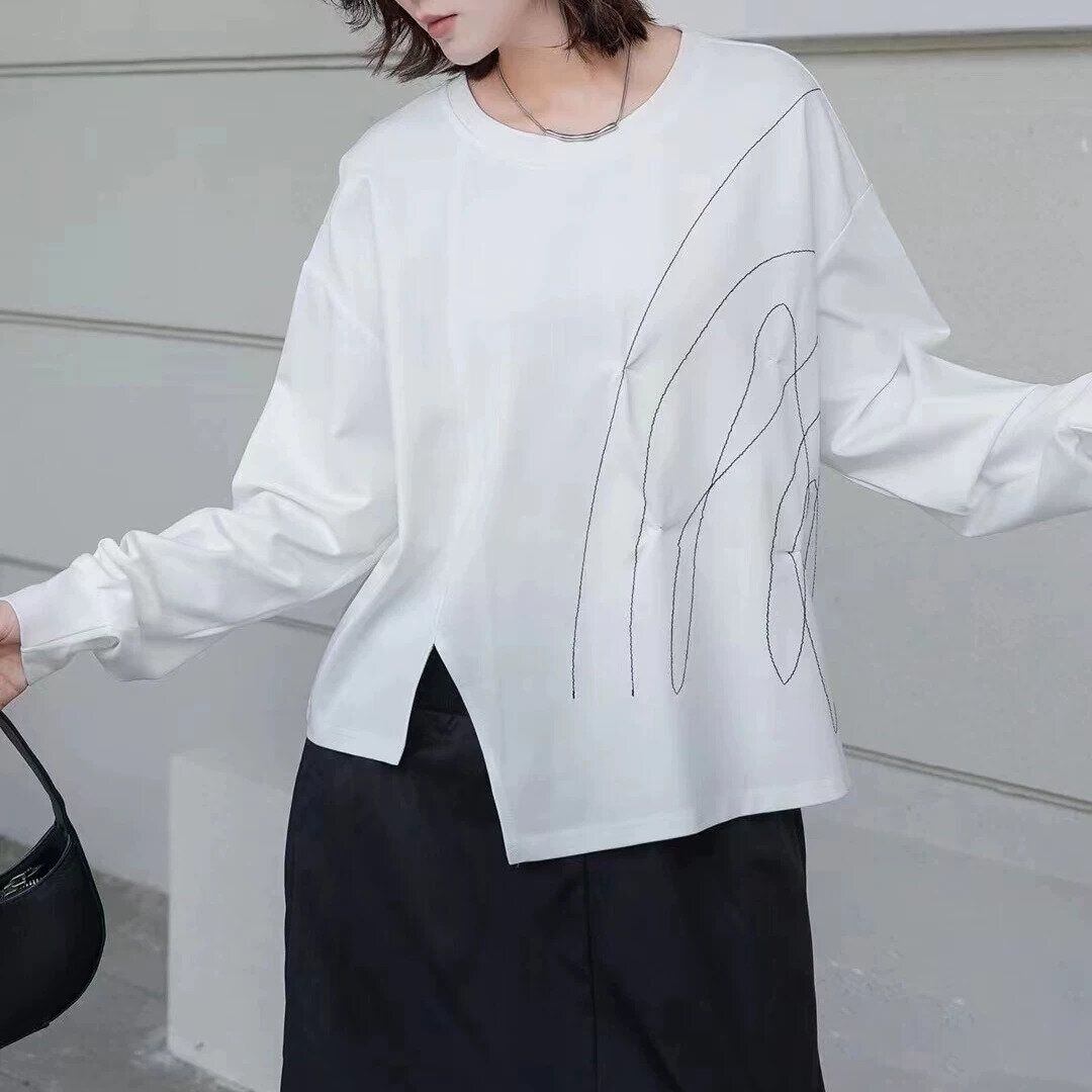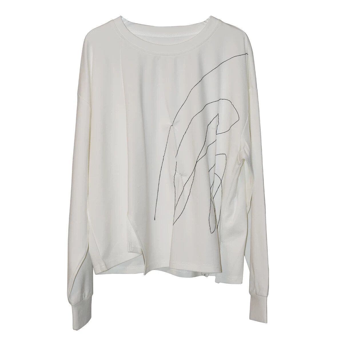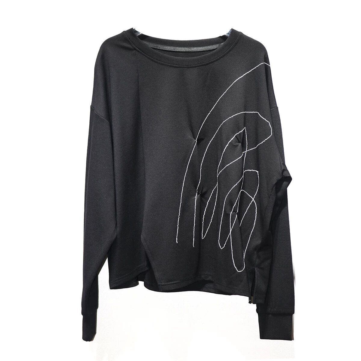 スティッチラインで描いたアーティスティックな柄がお洒落な、ラウンドネック・イレギュラーヘムのスウェットシャツです。ゆったりとしたシルエットに、アシンメトリックの裾がアクセントになった、何にでも合わせやすいカジュアルアイテムです。