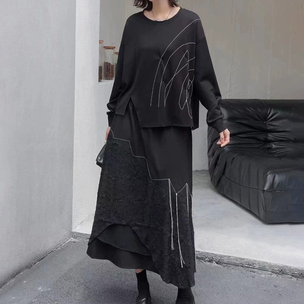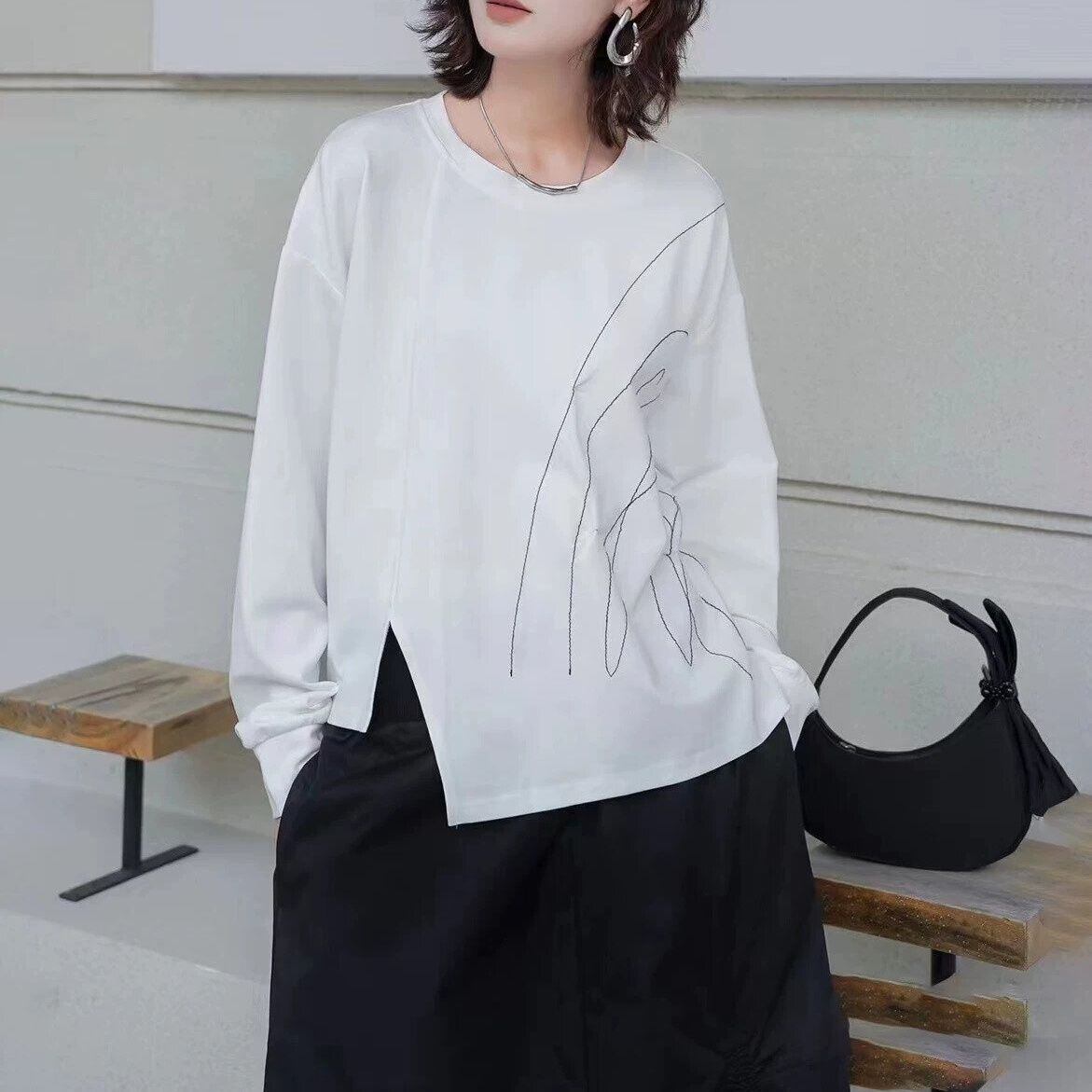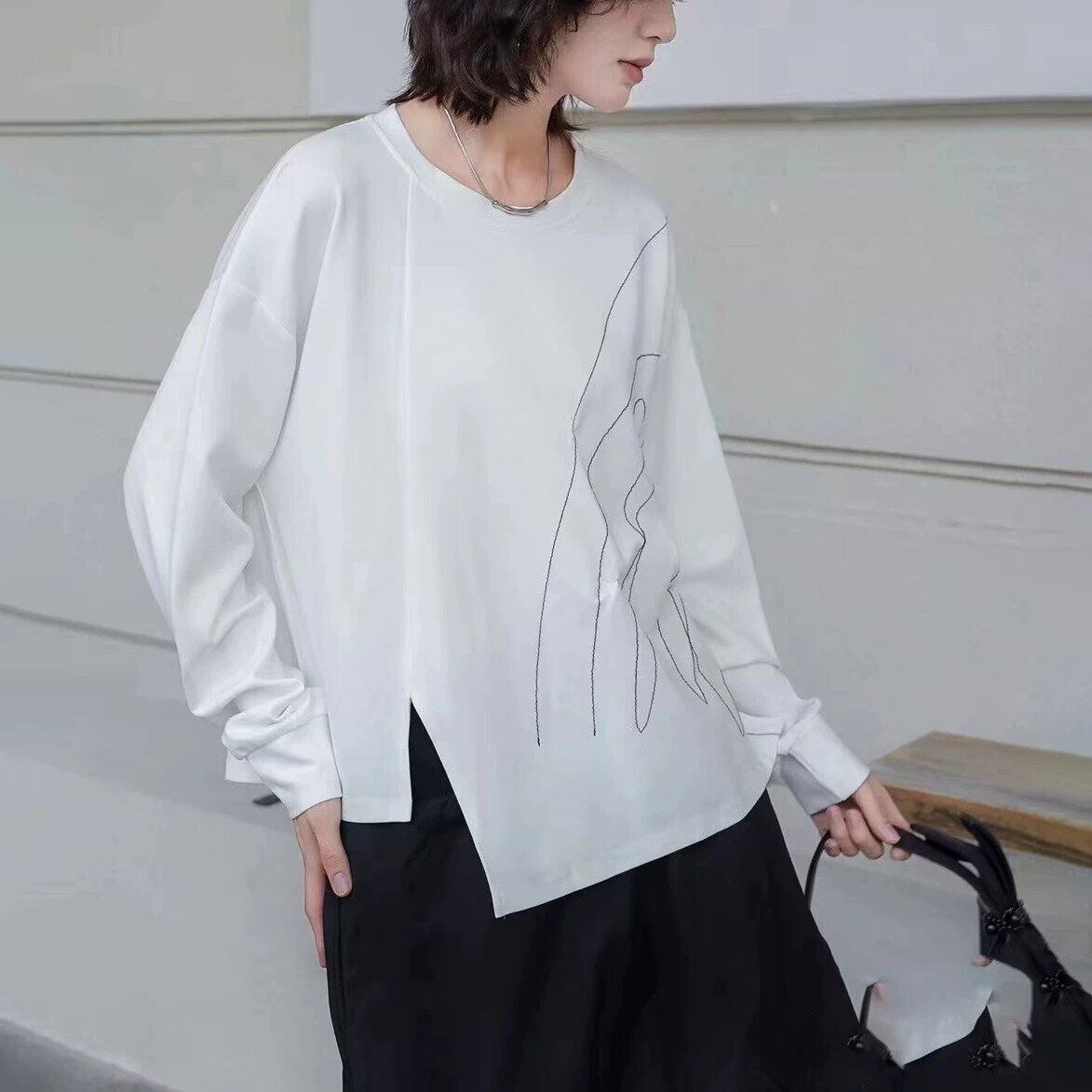 スティッチラインで描いたアーティスティックな柄がお洒落な、ラウンドネック・イレギュラーヘムのスウェットシャツです。ゆったりとしたシルエットに、アシンメトリックの裾がアクセントになった、何にでも合わせやすいカジュアルアイテムです。