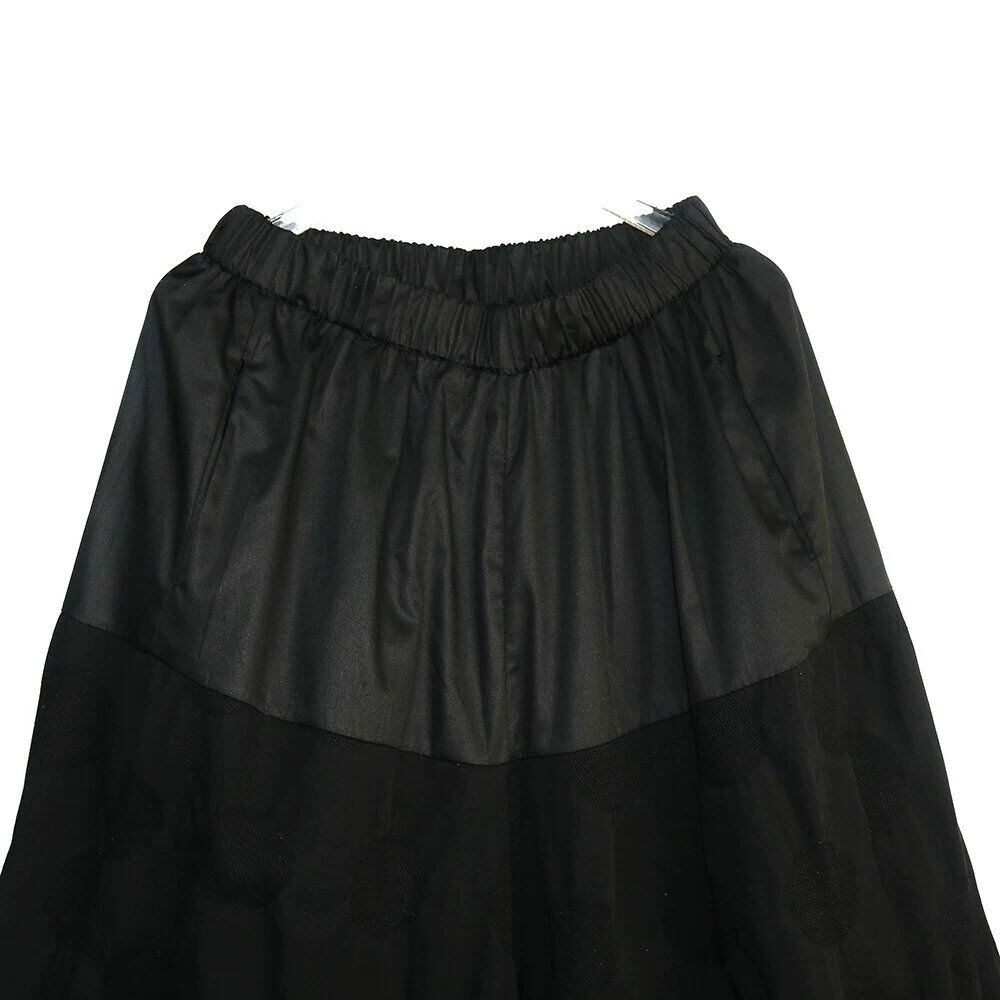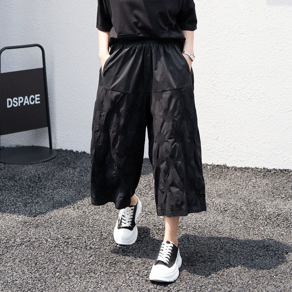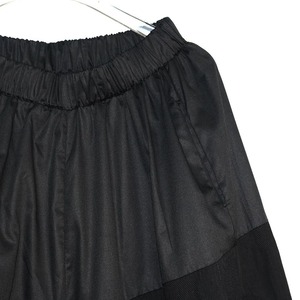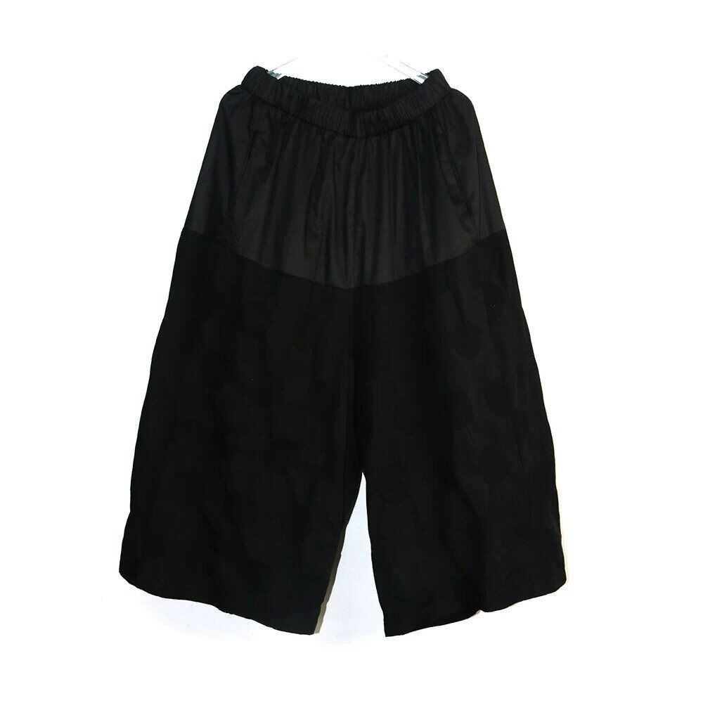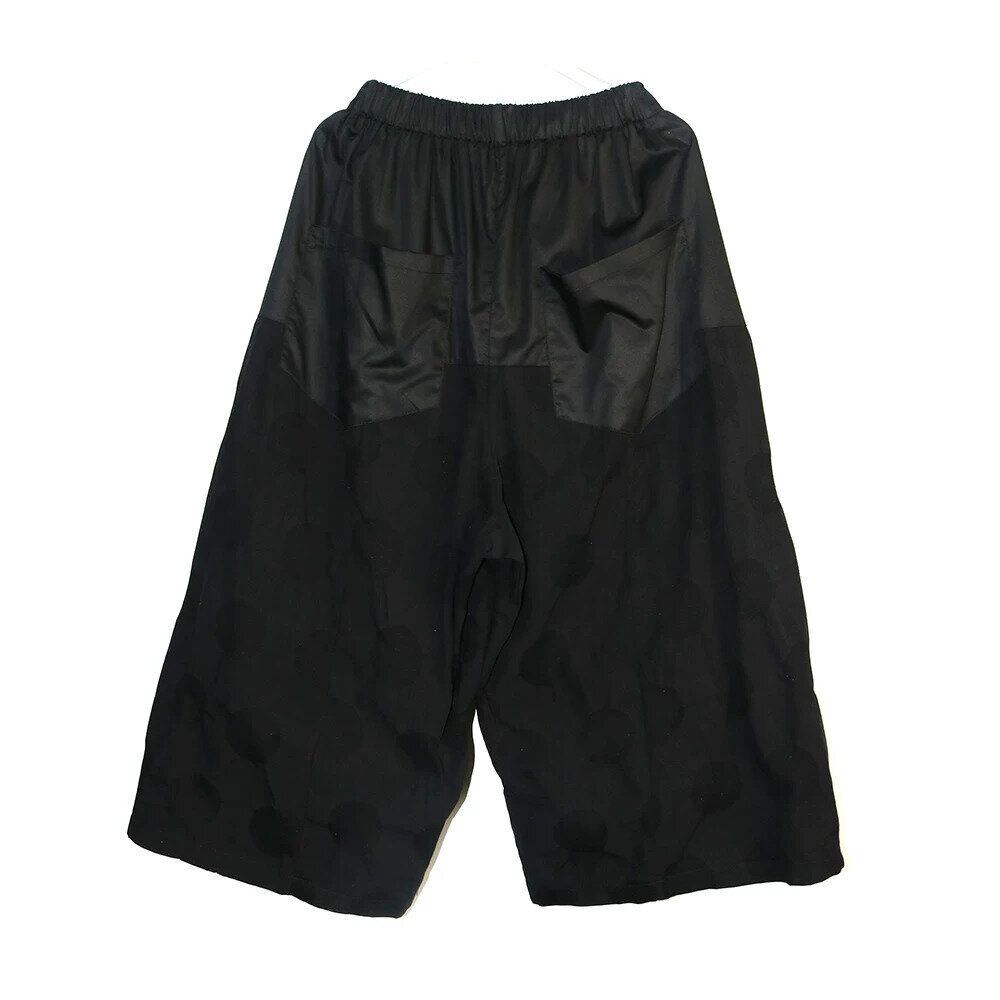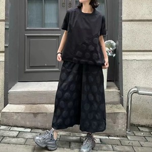 同色異素材のスティッチデザインがユニークな、ワイドレッグ・クロップドパンツです。ウエストはゴムなので、着脱が簡単で履き心地が良いです。立体的なドット柄の生地がキュートな、ブラックでどんなトップスとも合わせやすいアイテムです。
