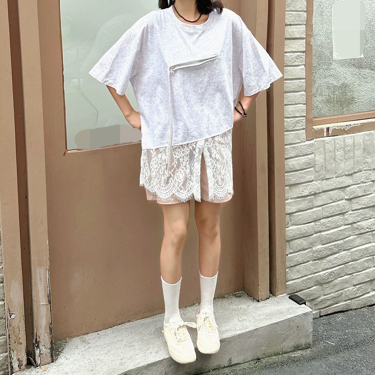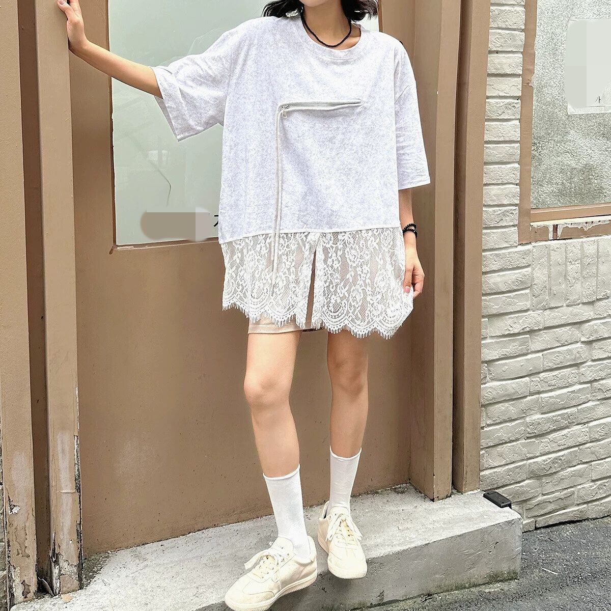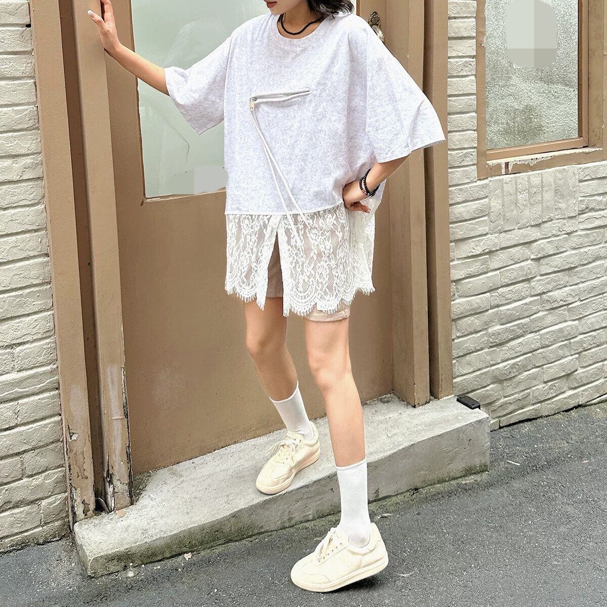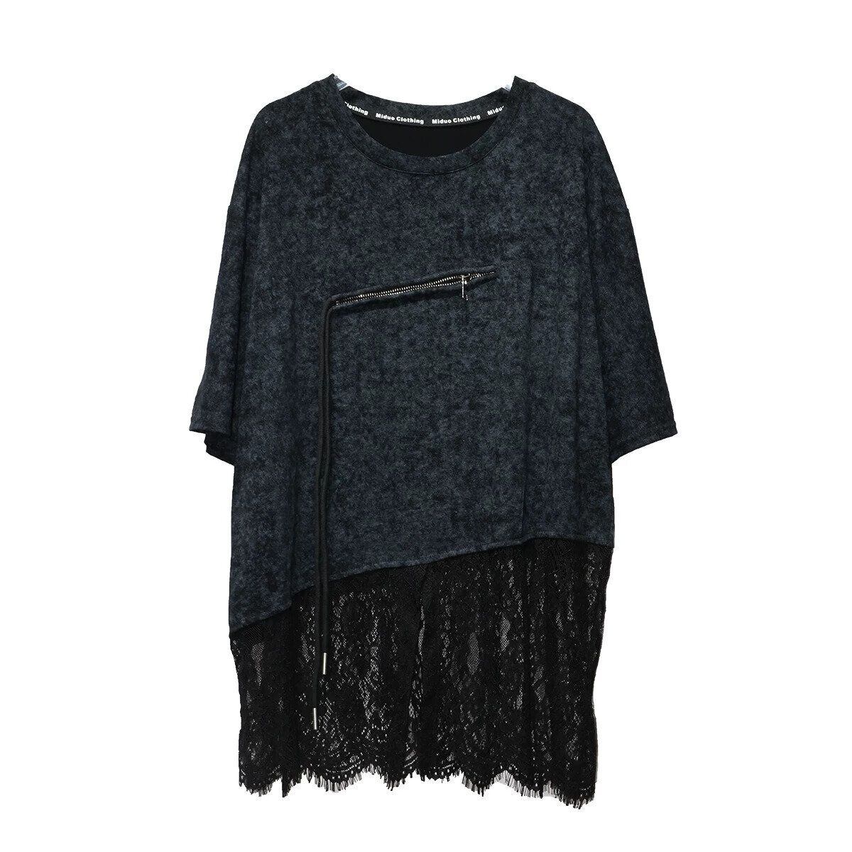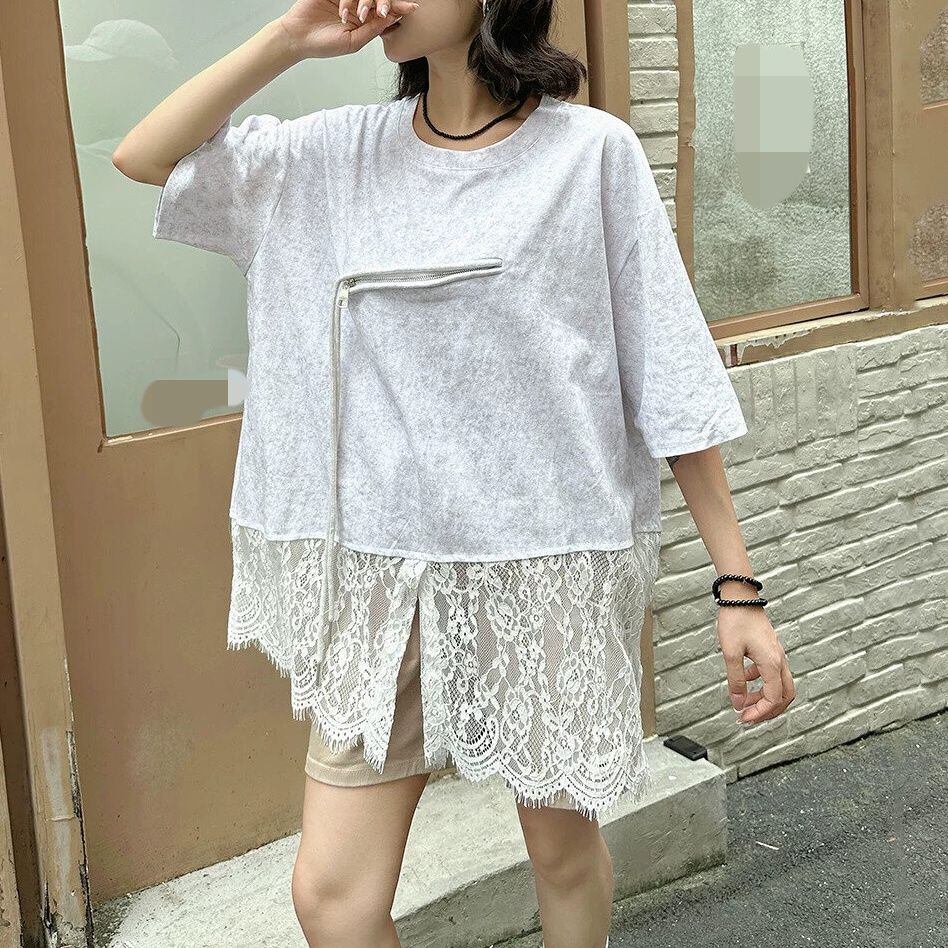 ZIP TRIMMED LACED HEM TUNIC T-SHIRT 3colors M-16247