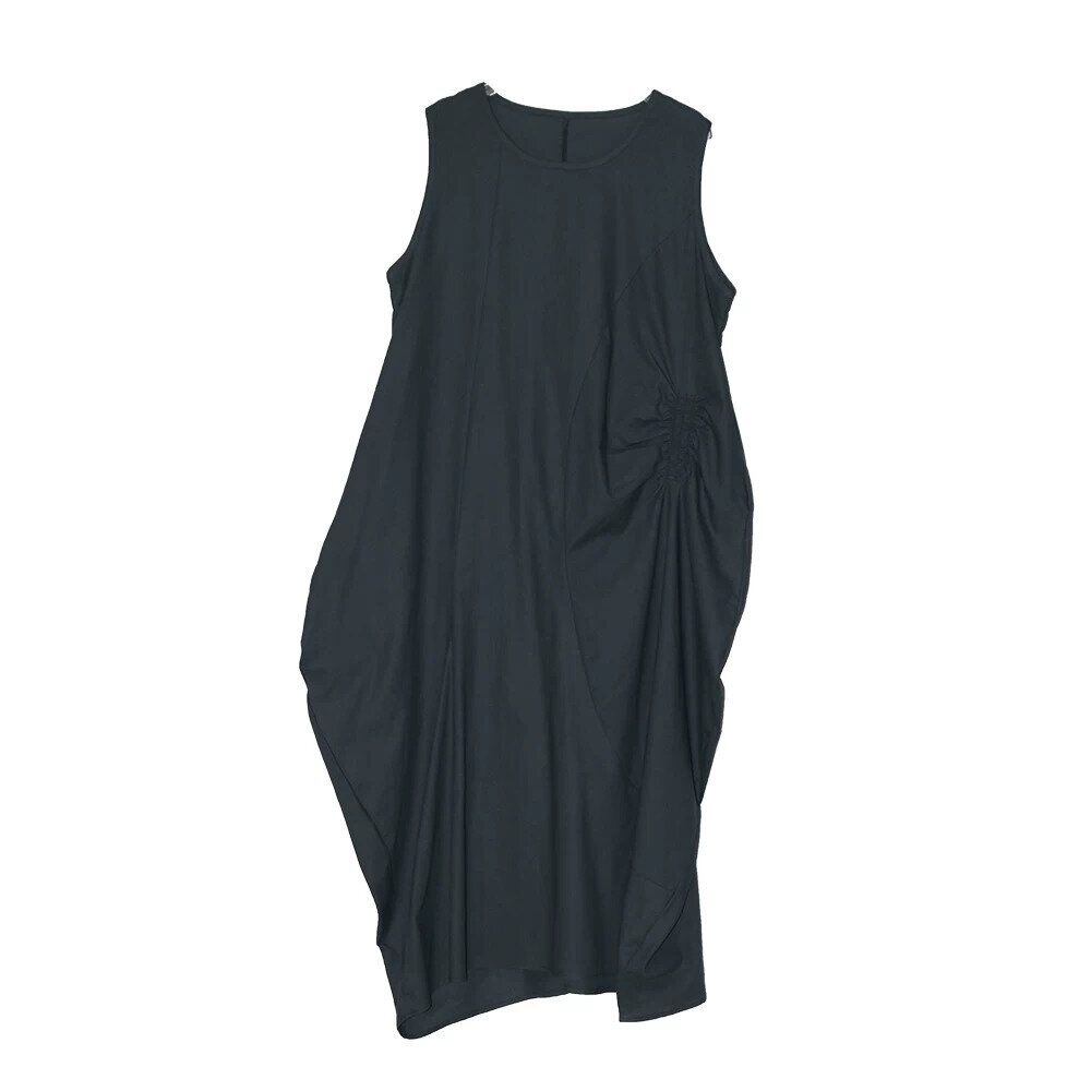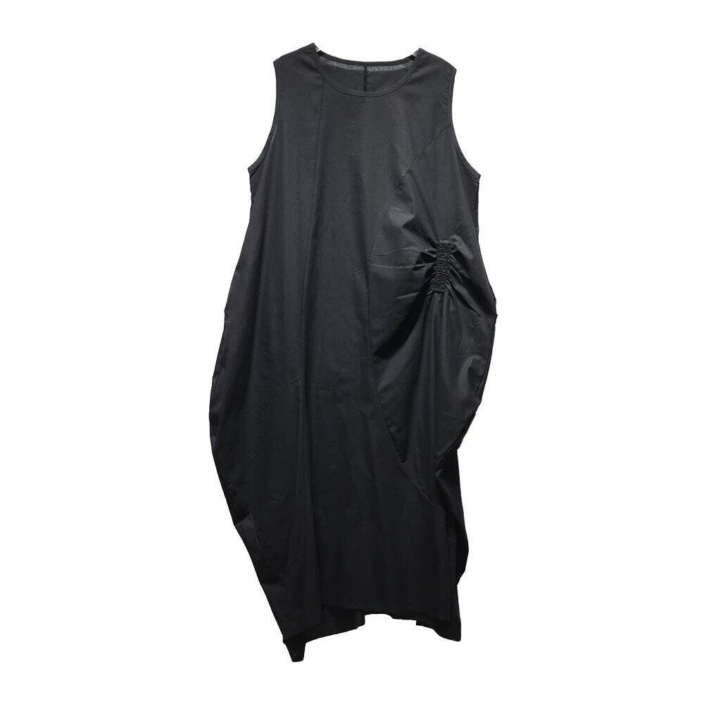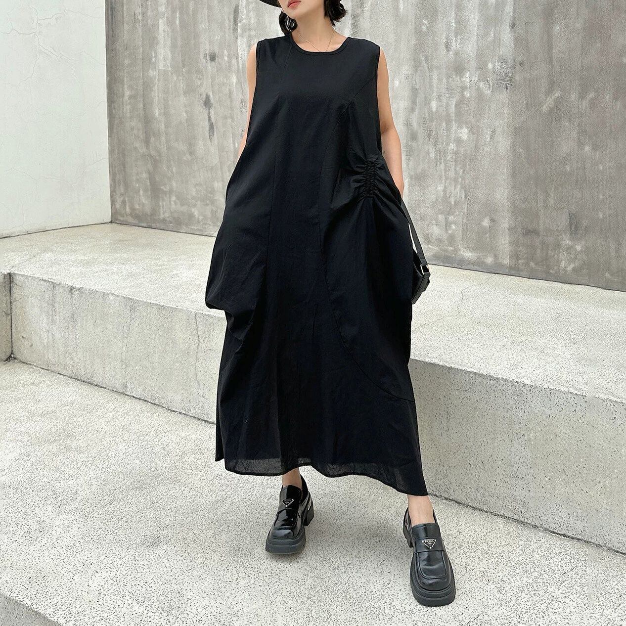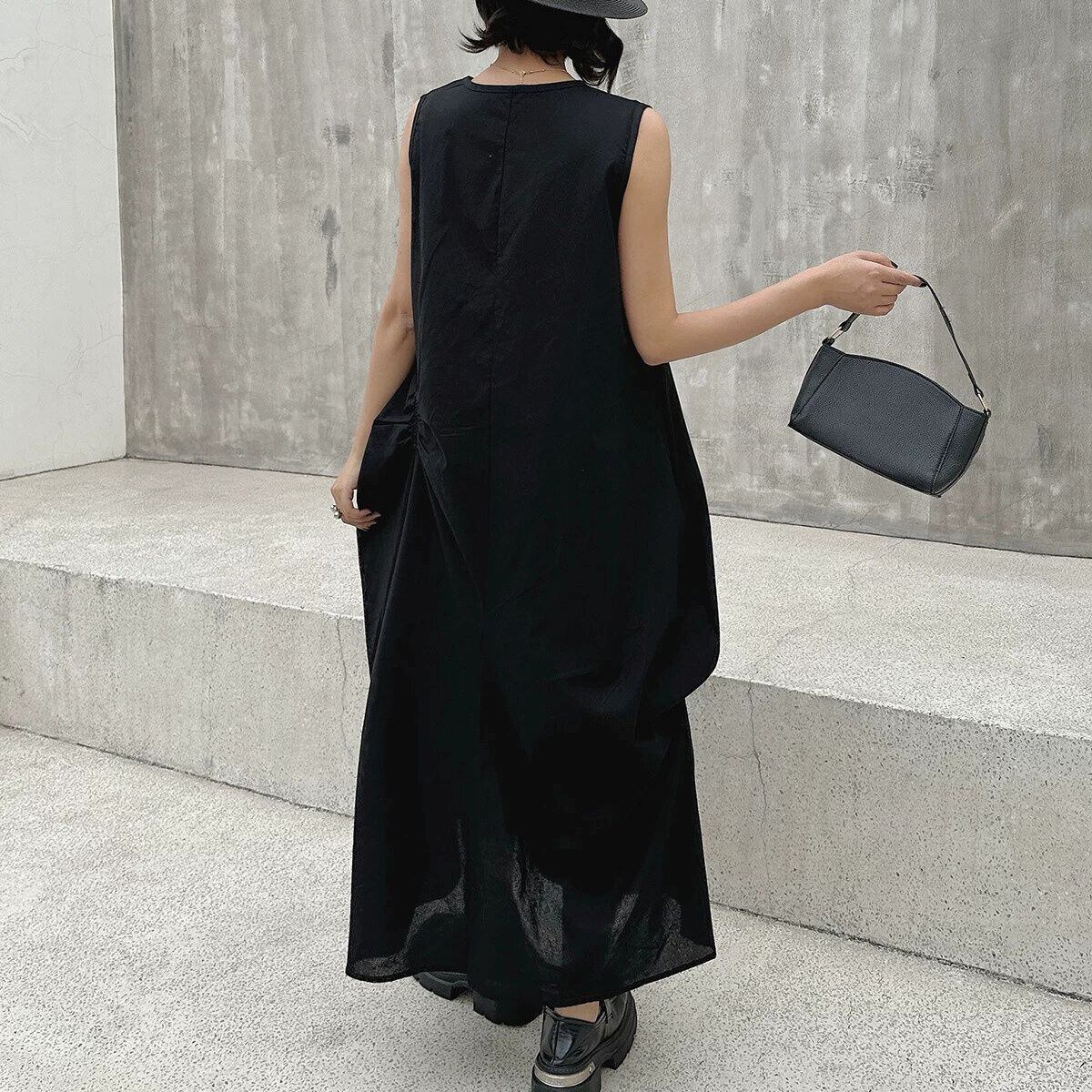 アシンメトリックでユニークなシルエットがお洒落な、ラウンドネック・ノースリーブ・ロング丈のプルオーバーワンピースです。透け感のある単色素材が涼し気な、エレガントな印象のアイテムです。色は3色から選べます。