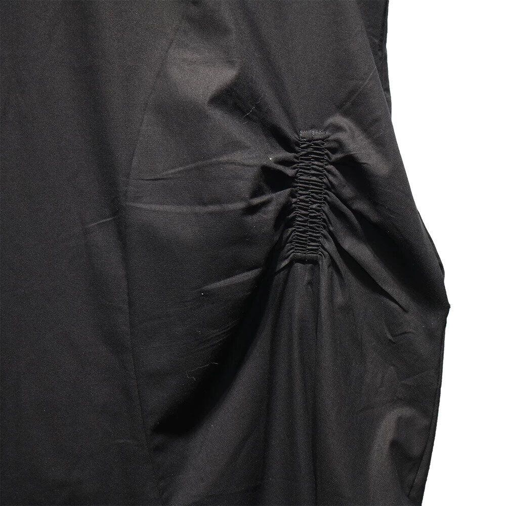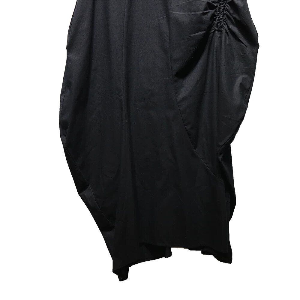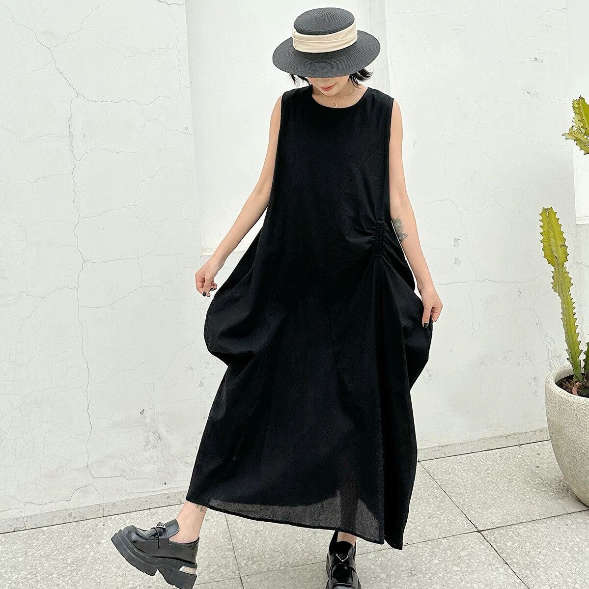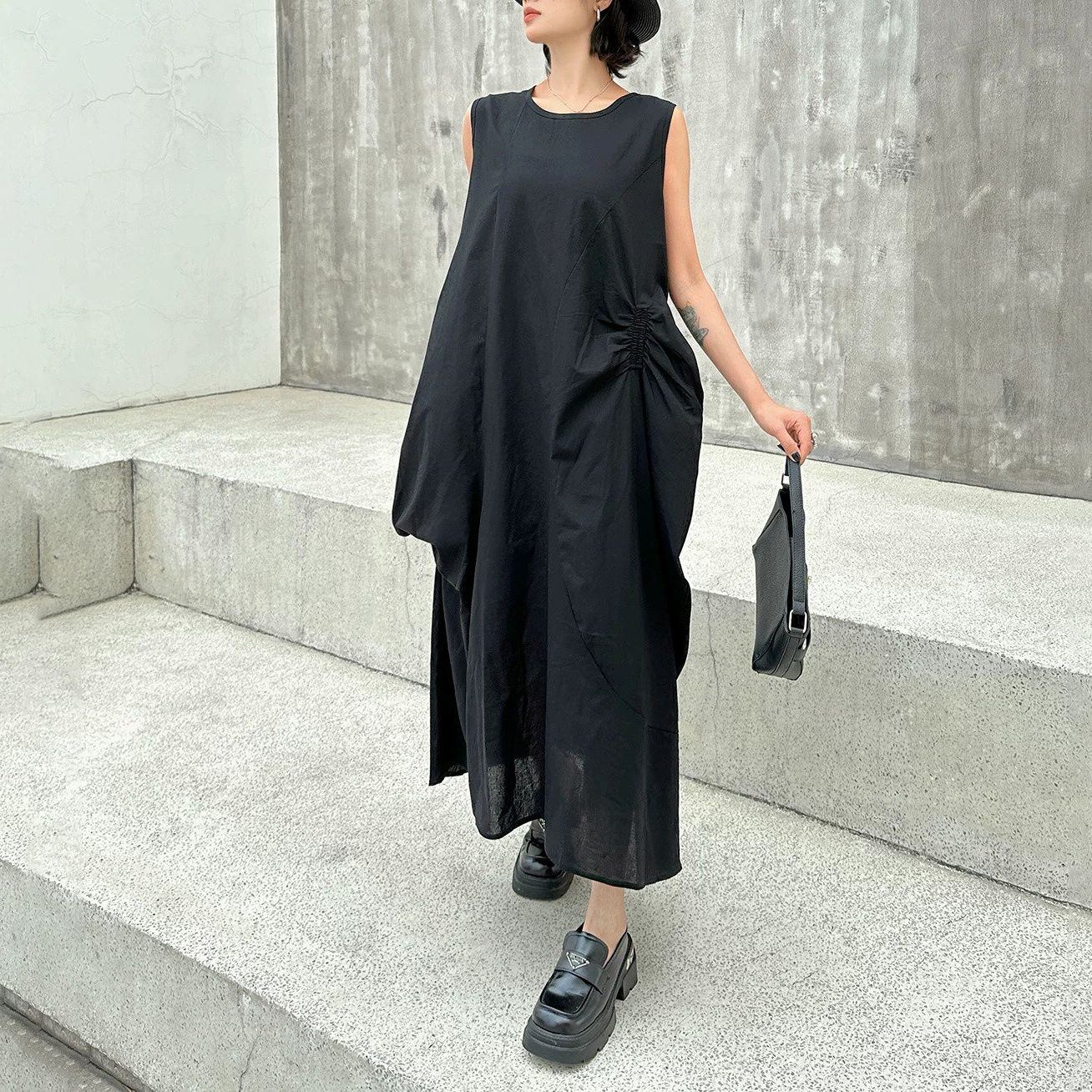 アシンメトリックでユニークなシルエットがお洒落な、ラウンドネック・ノースリーブ・ロング丈のプルオーバーワンピースです。透け感のある単色素材が涼し気な、エレガントな印象のアイテムです。色は3色から選べます。