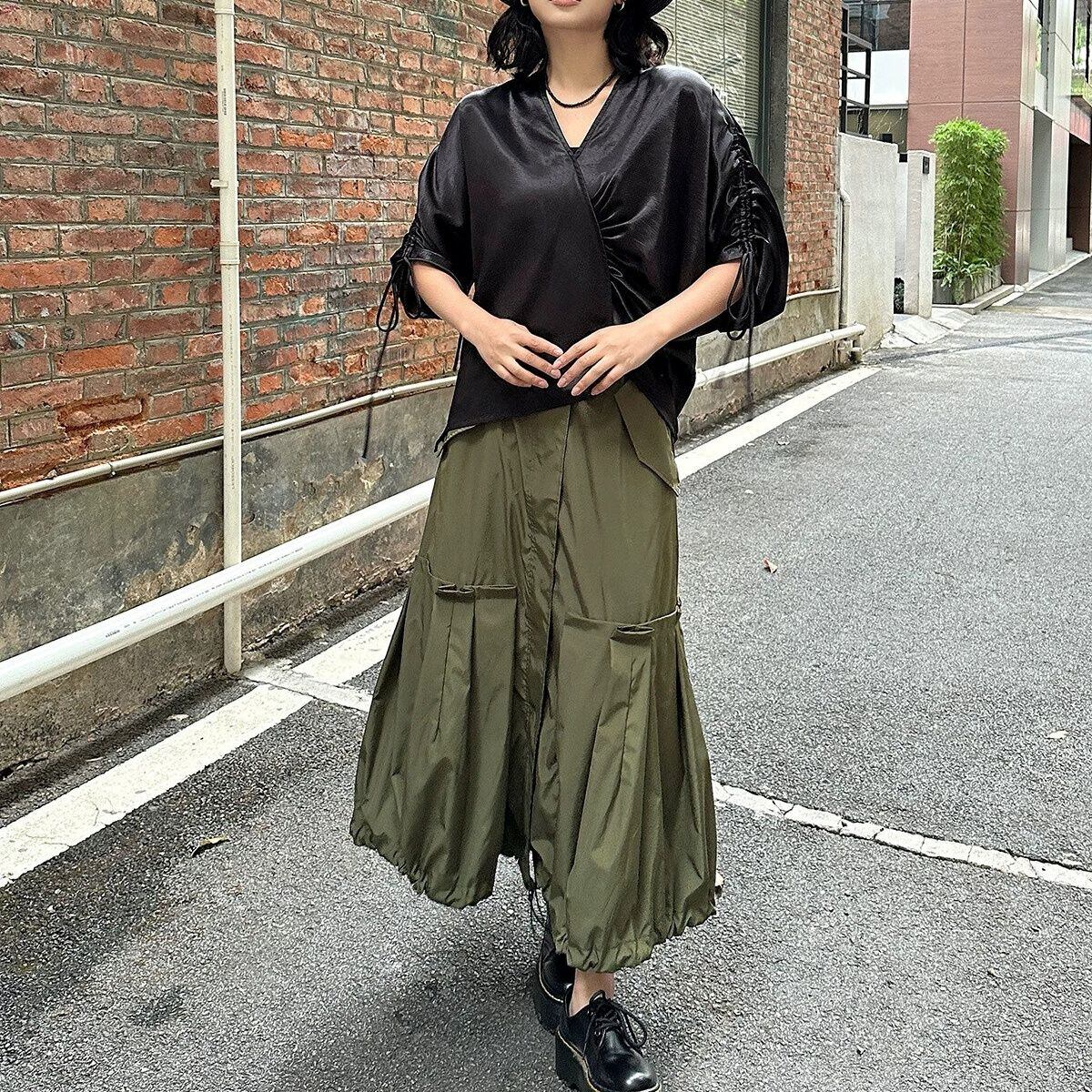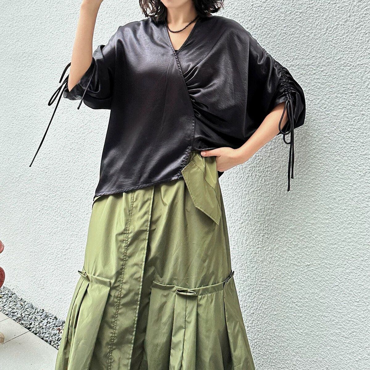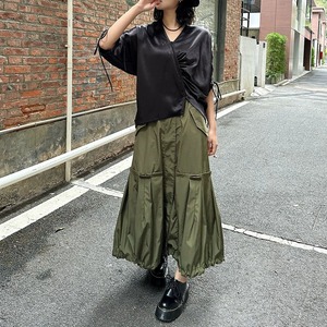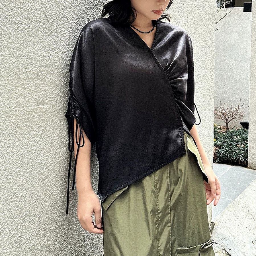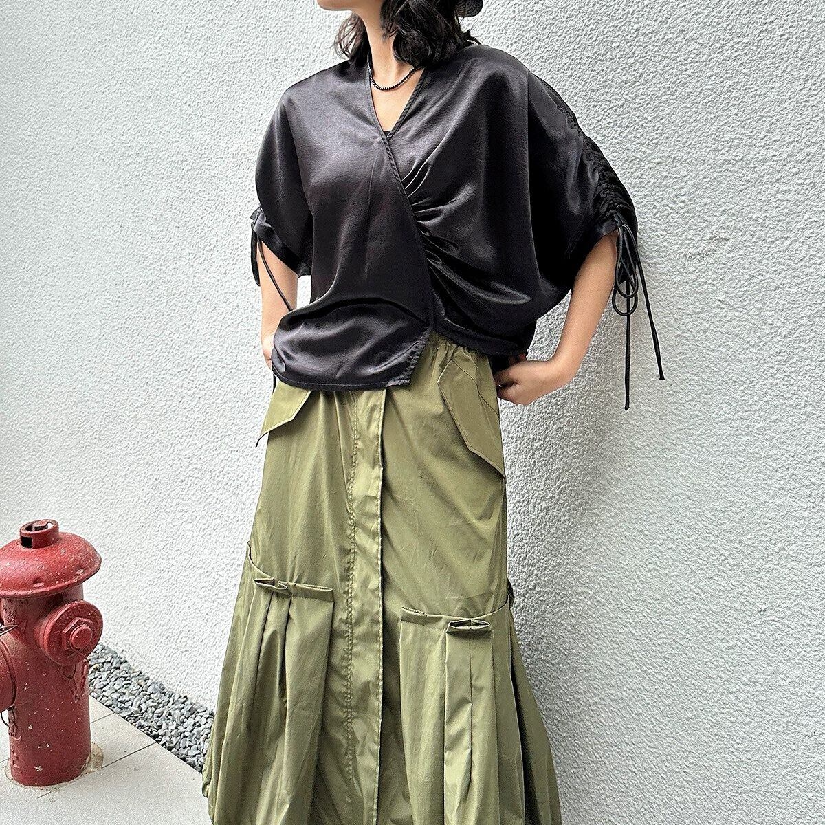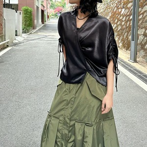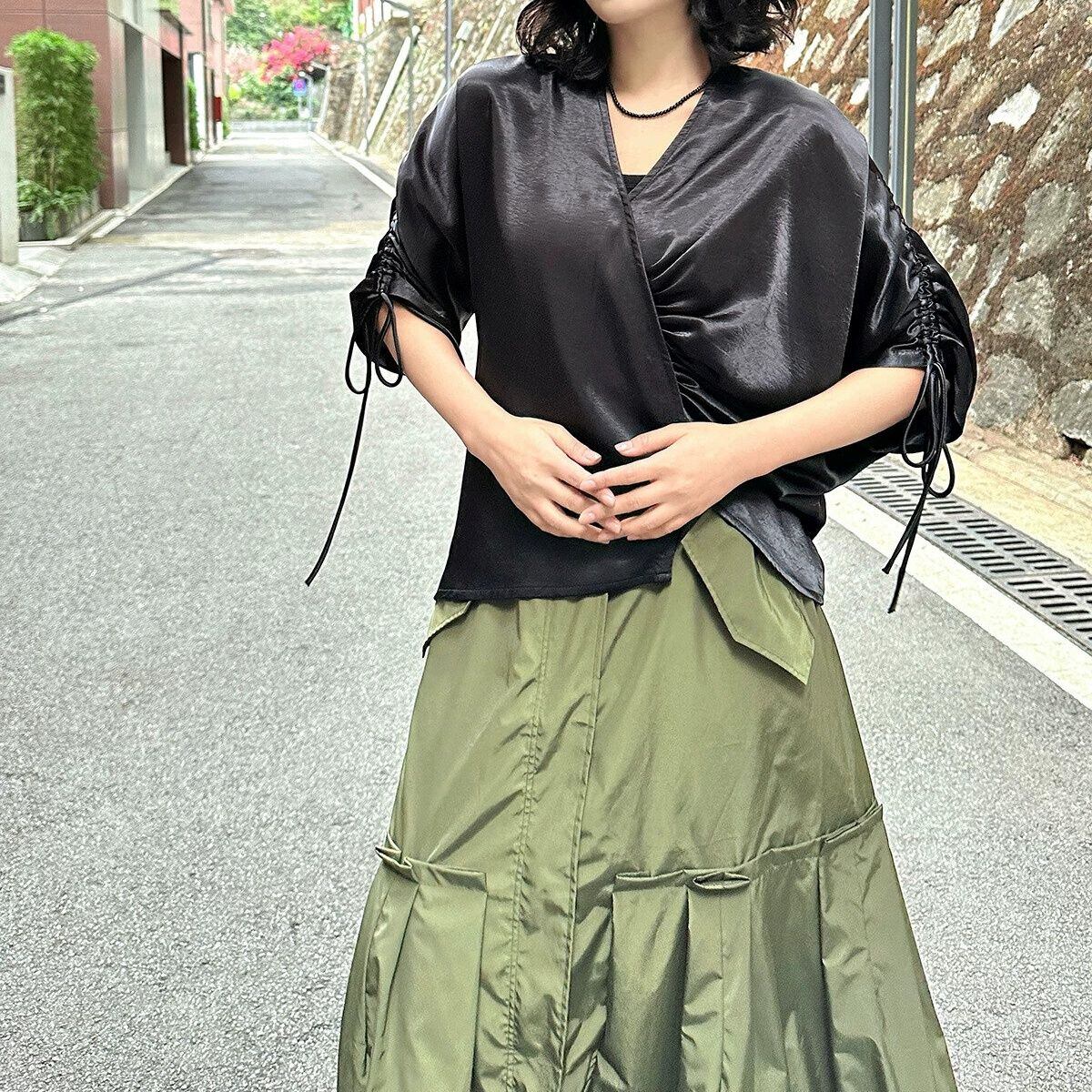 滑らかで艶のあるシルクのような素材が魅力的な、Vネック・7分袖・イレギュラーヘムのプルオーバーシャツです。ドローストリングの袖やギャザー加工で作られたシルエットがお洒落な、単色で合わせやすいアイテムです。色は2色から選べます。