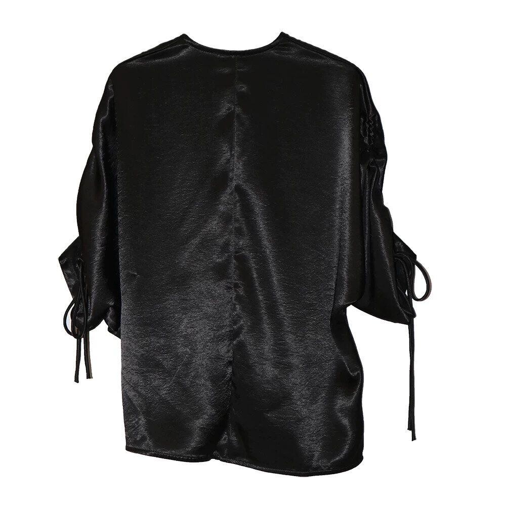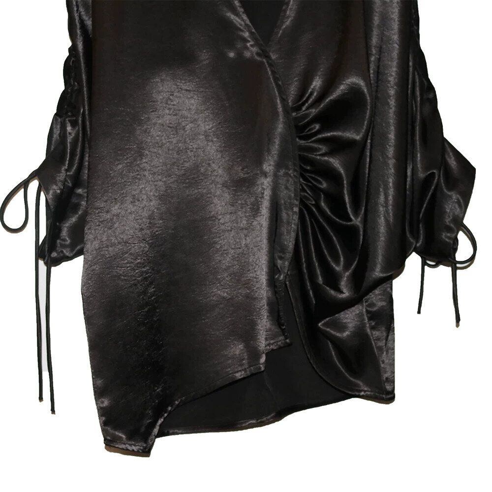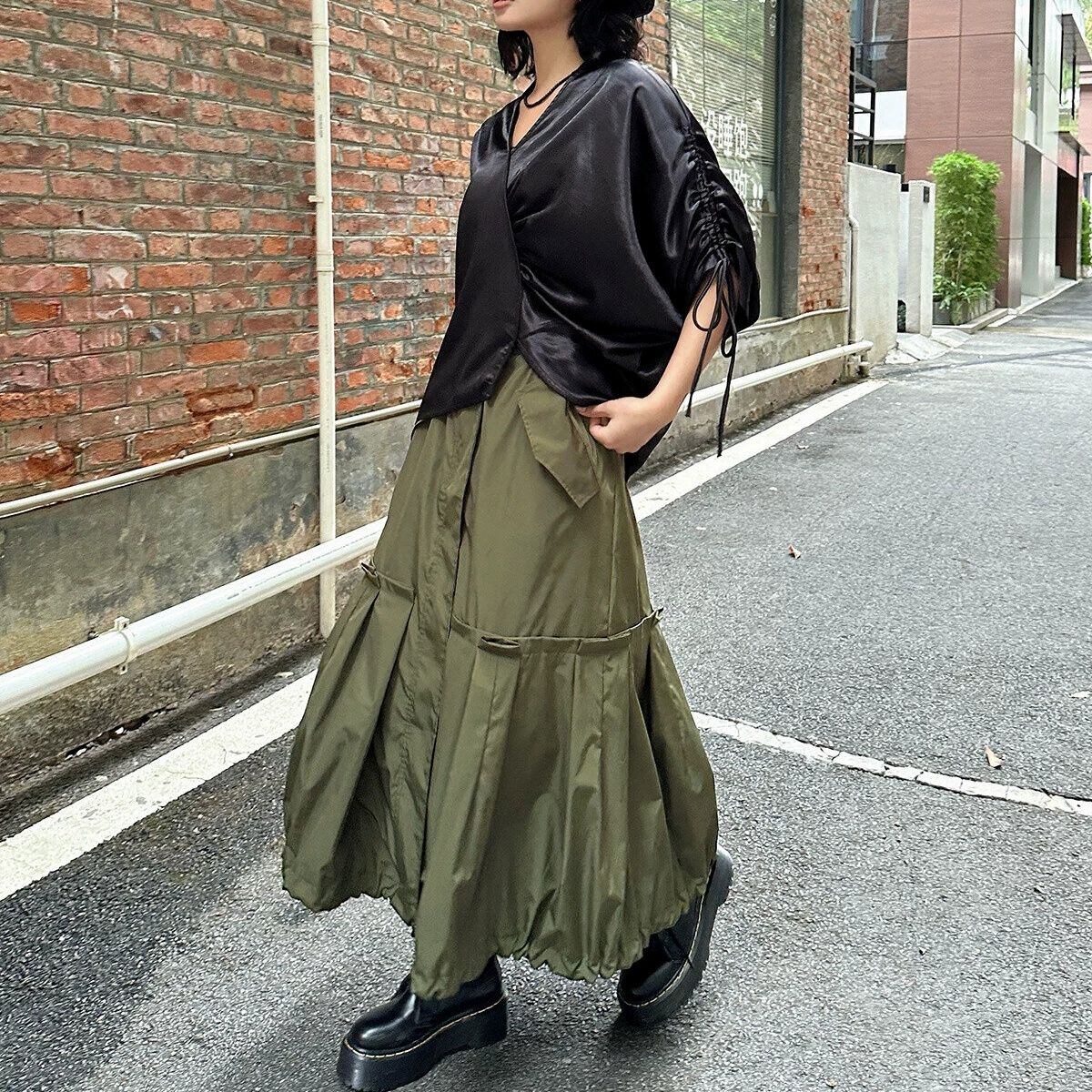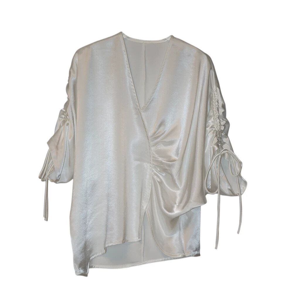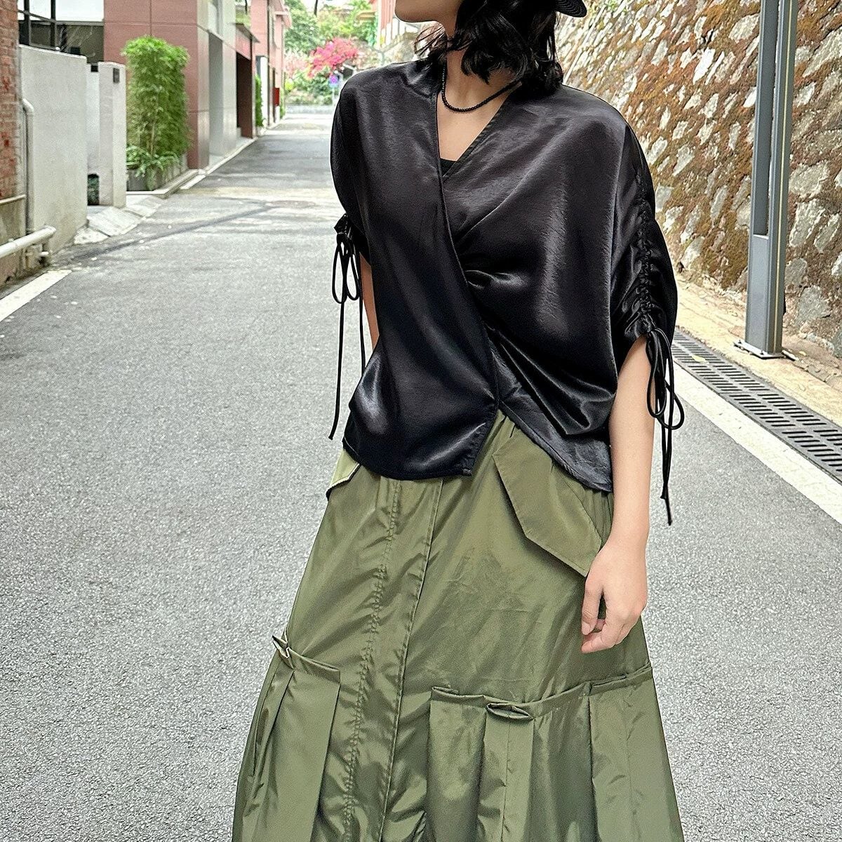 滑らかで艶のあるシルクのような素材が魅力的な、Vネック・7分袖・イレギュラーヘムのプルオーバーシャツです。ドローストリングの袖やギャザー加工で作られたシルエットがお洒落な、単色で合わせやすいアイテムです。色は2色から選べます。
