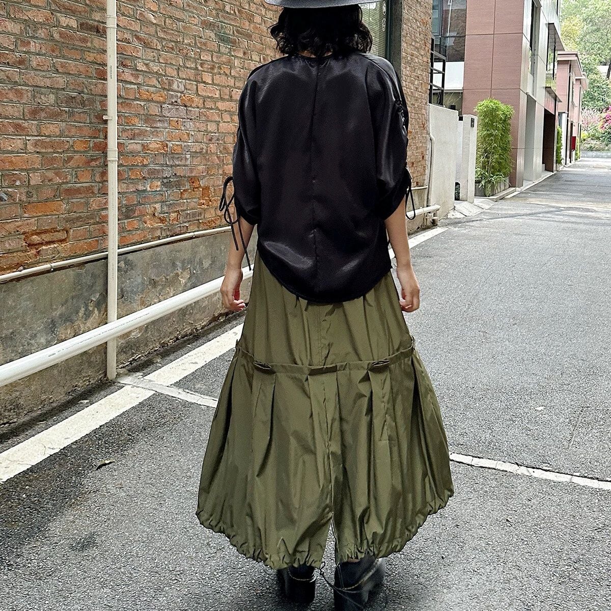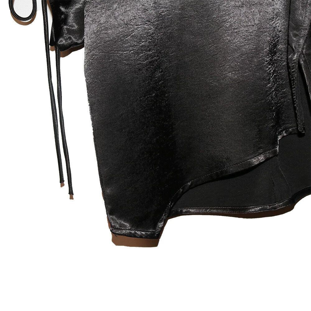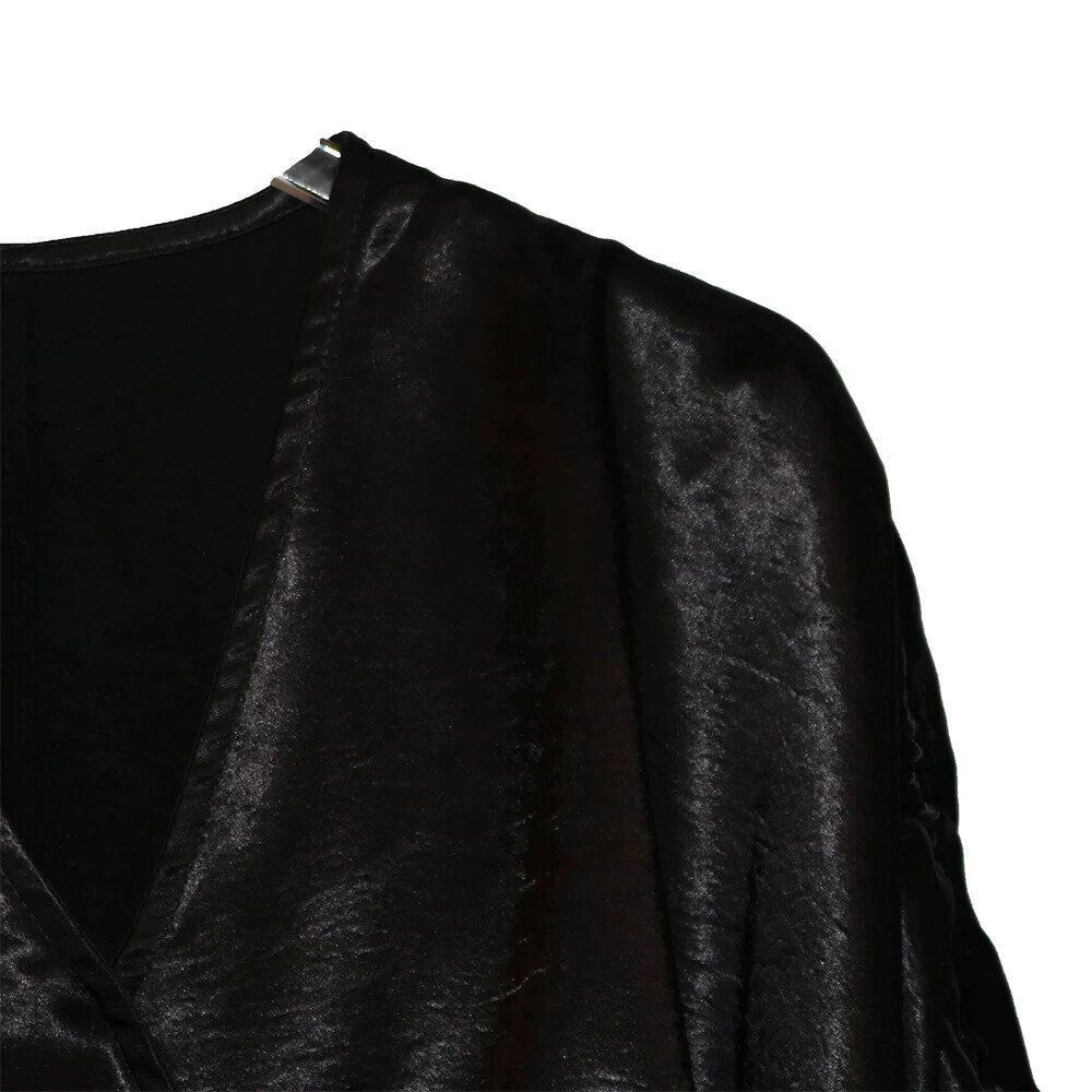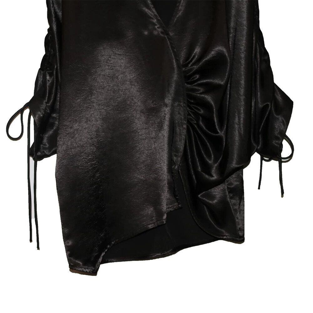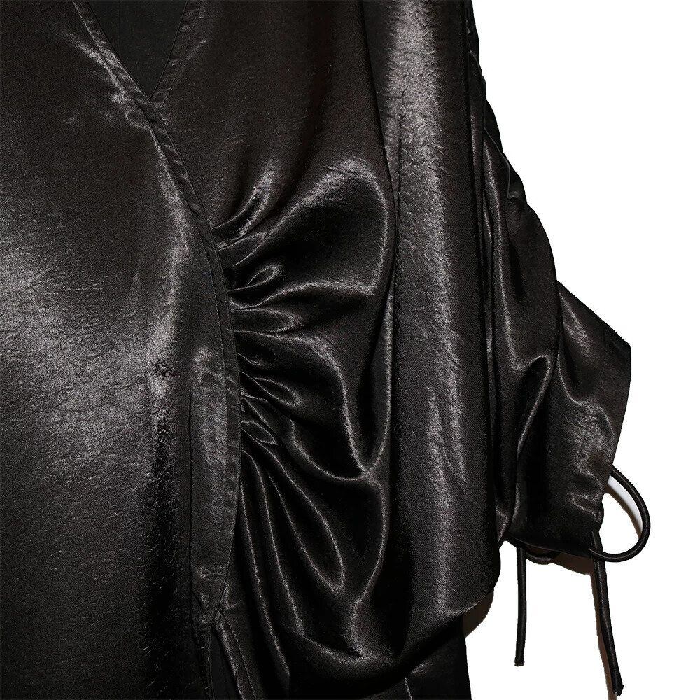 滑らかで艶のあるシルクのような素材が魅力的な、Vネック・7分袖・イレギュラーヘムのプルオーバーシャツです。ドローストリングの袖やギャザー加工で作られたシルエットがお洒落な、単色で合わせやすいアイテムです。色は2色から選べます。