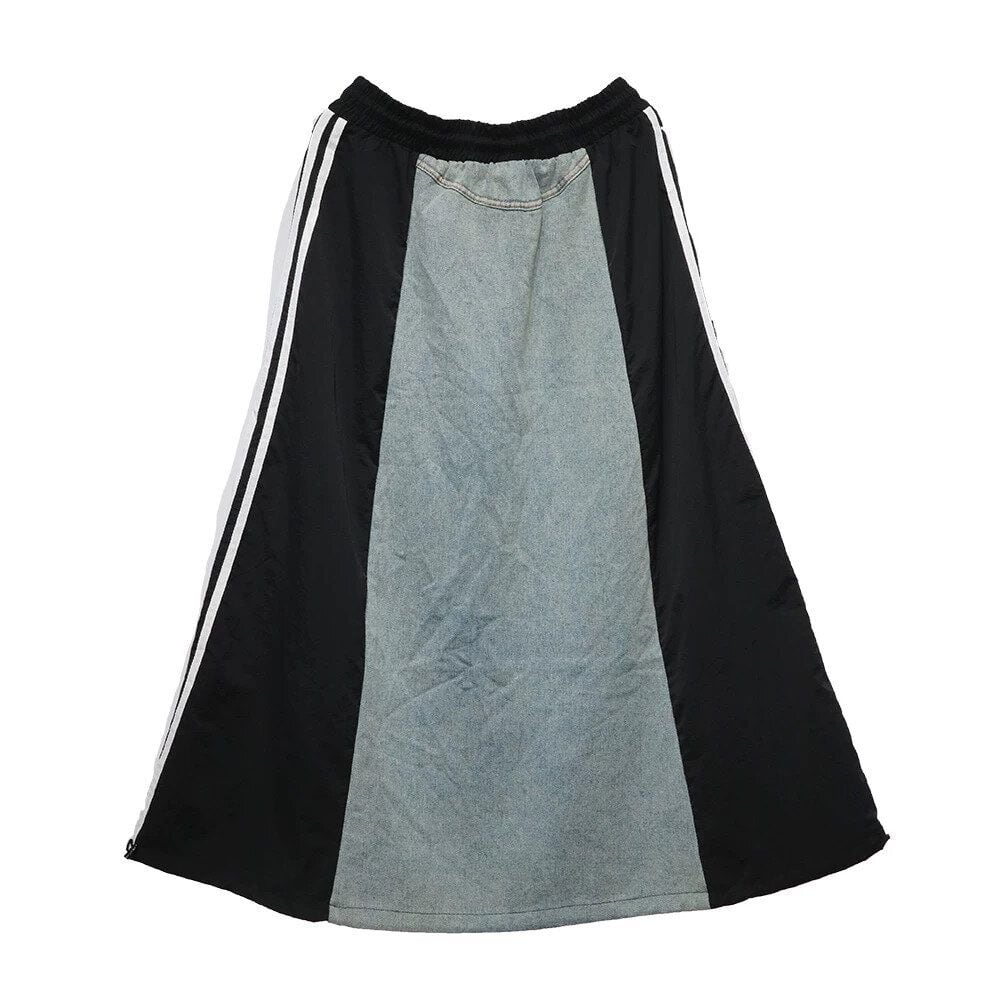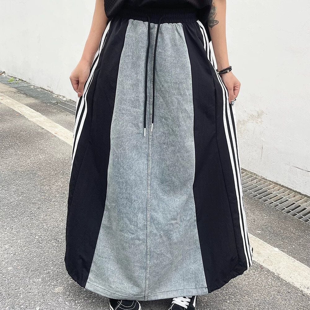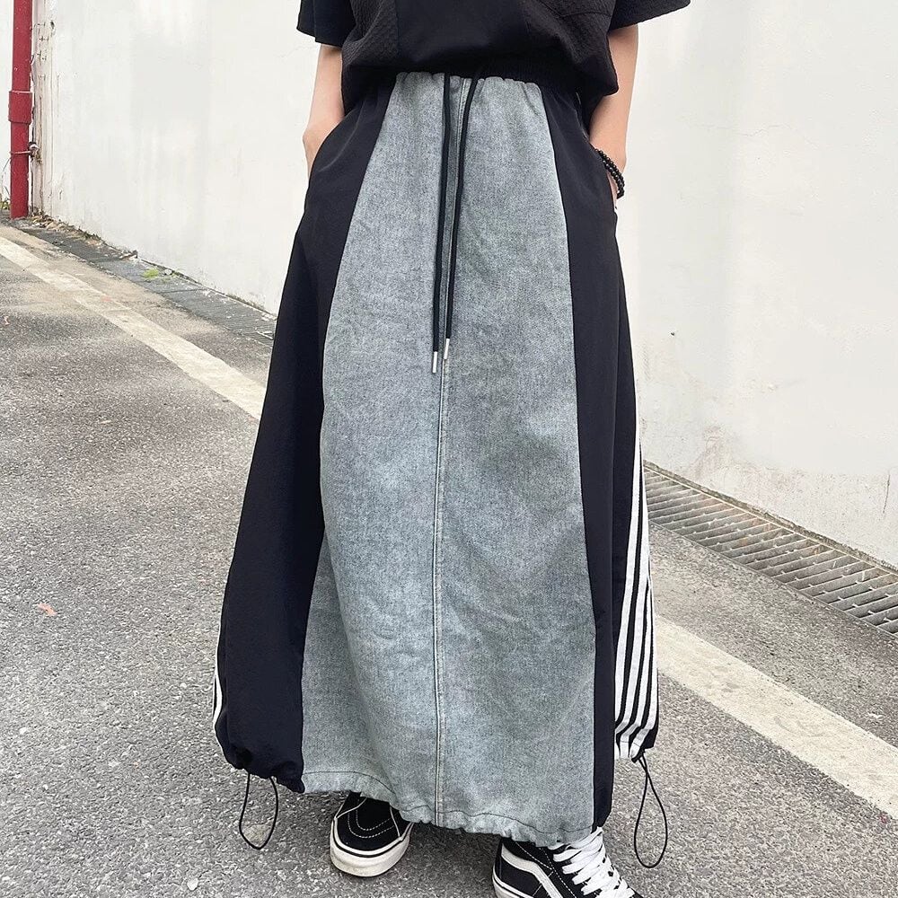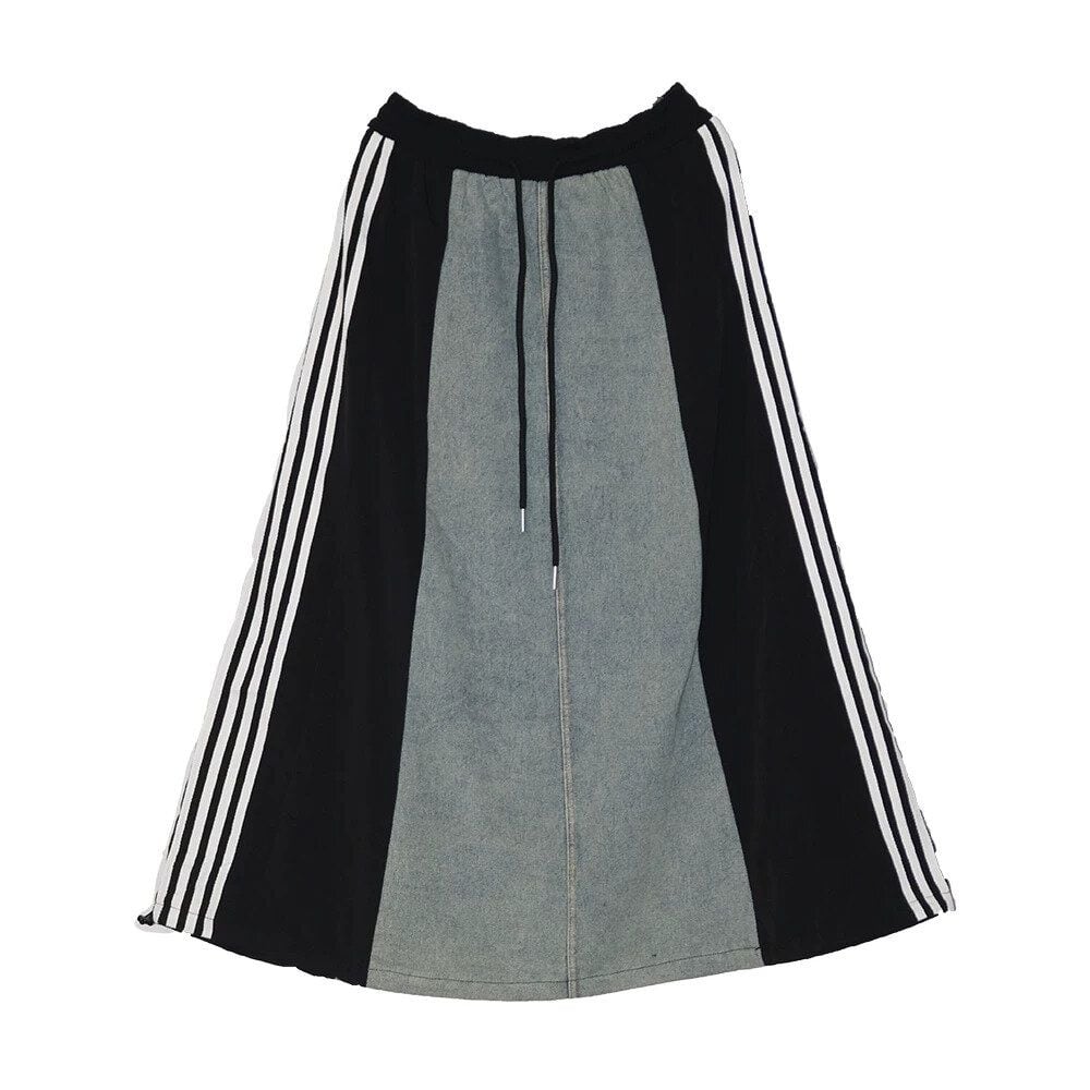 デニムとサイドラインのジャージのコントラストがお洒落な、Aライン・ロング丈のカジュアルスカートです。ウエストはゴムなので、着脱が簡単で履き心地が良いです。裾はサイドにドローコードが付いて、シルエットをアレンジできます。コーディネートの主役になる目を惹くアイテムです。色は3色から選べます。