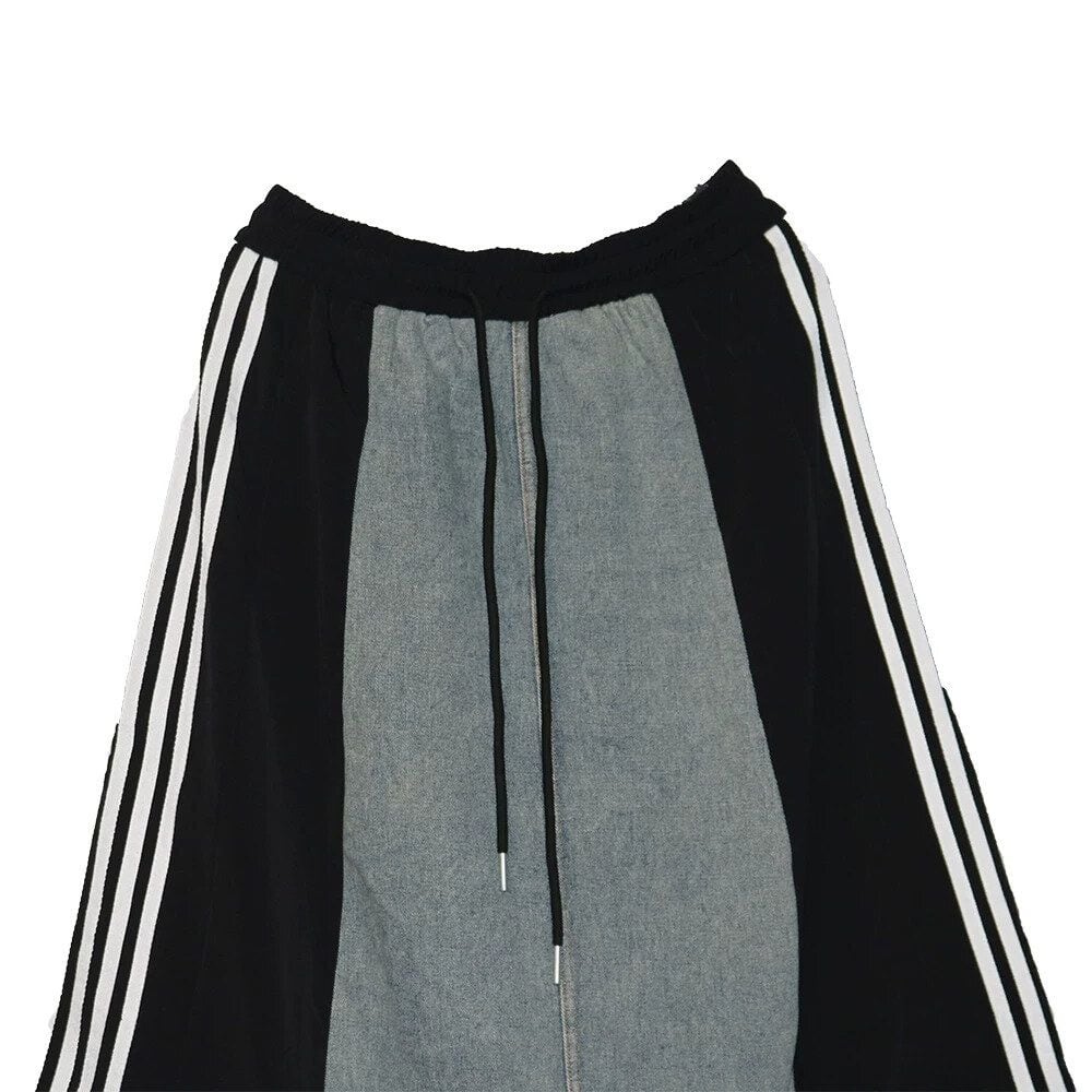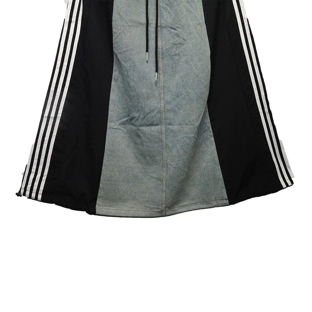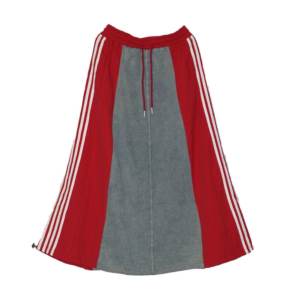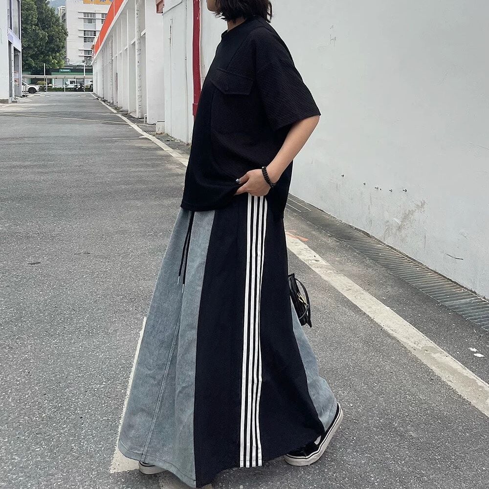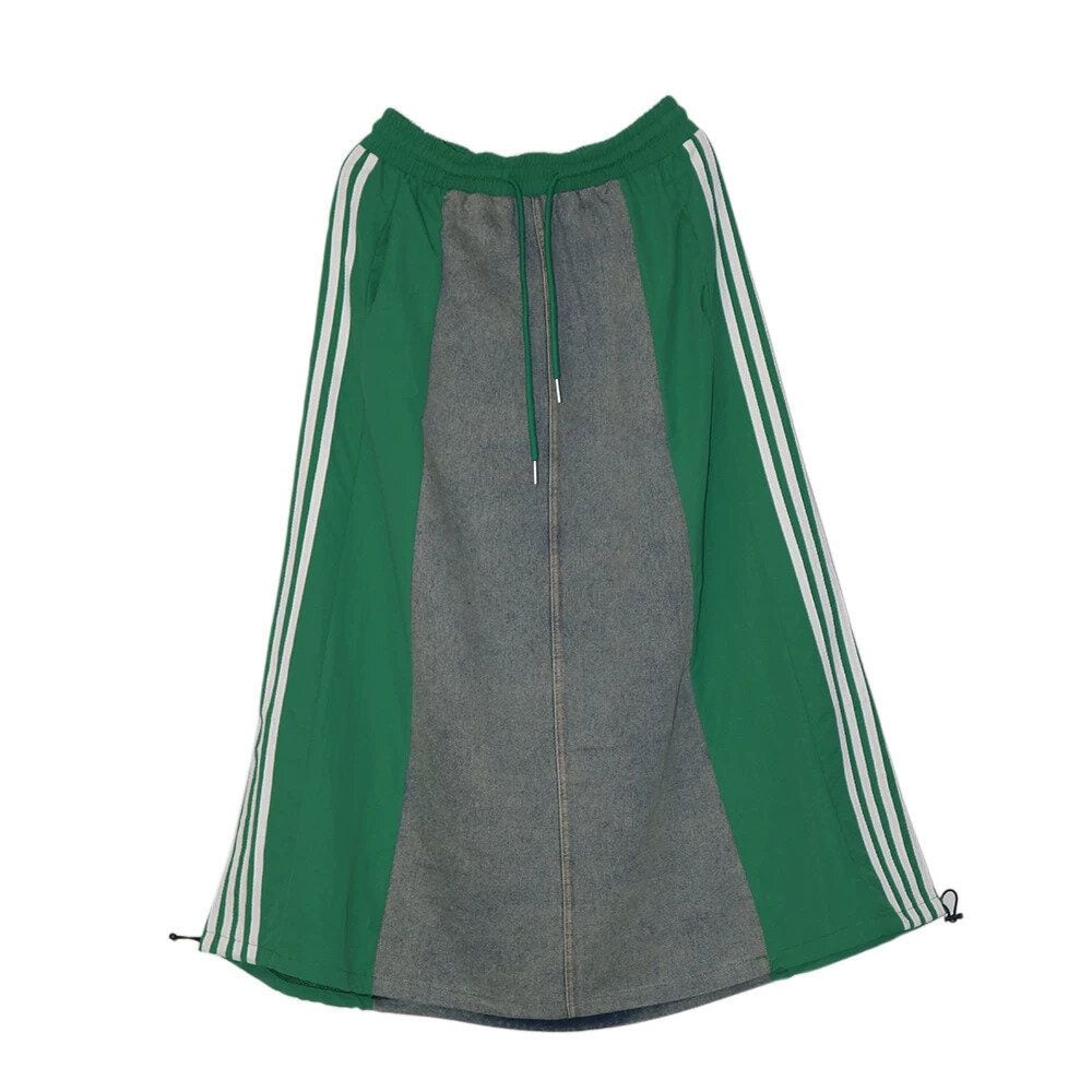 デニムとサイドラインのジャージのコントラストがお洒落な、Aライン・ロング丈のカジュアルスカートです。ウエストはゴムなので、着脱が簡単で履き心地が良いです。裾はサイドにドローコードが付いて、シルエットをアレンジできます。コーディネートの主役になる目を惹くアイテムです。色は3色から選べます。