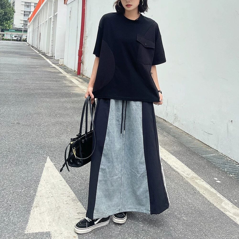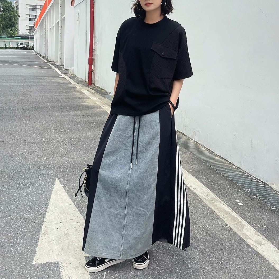 DENIM STITCHED A-LINE LONG JERSEY SKIRT 3colors M-16254