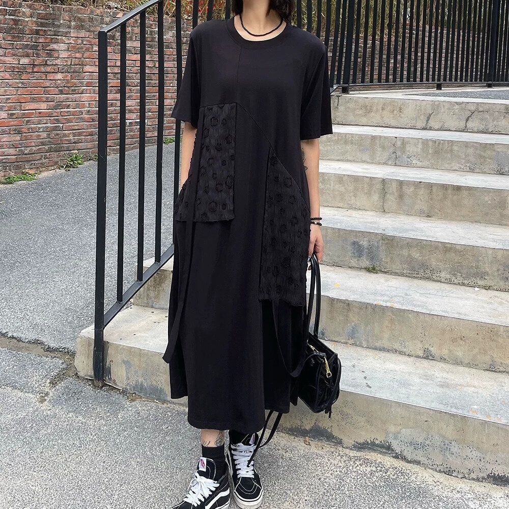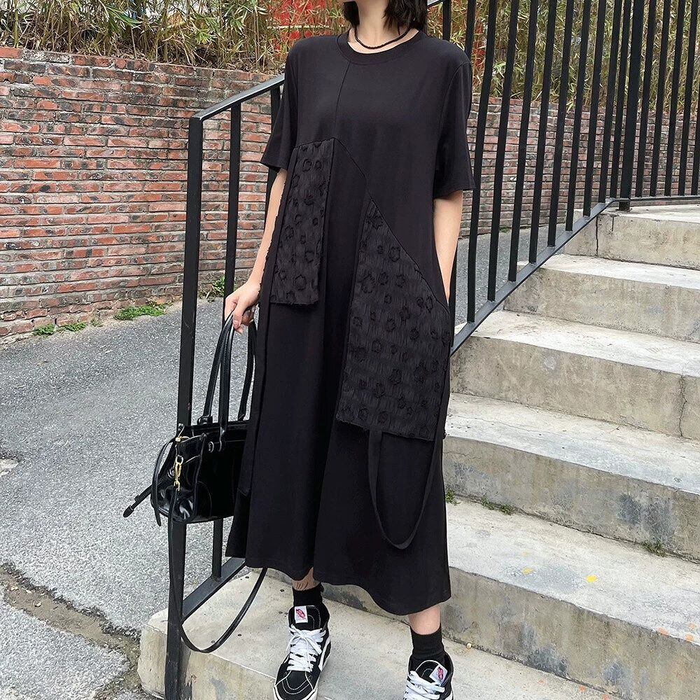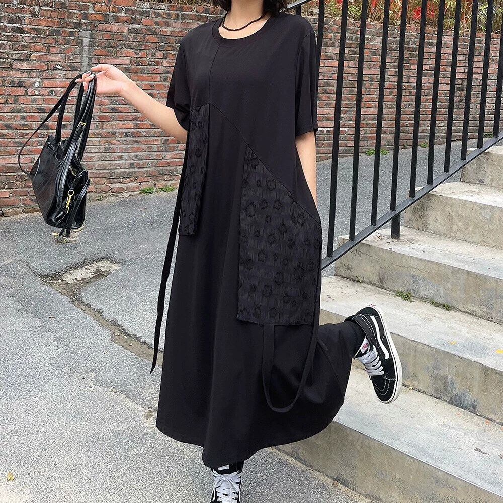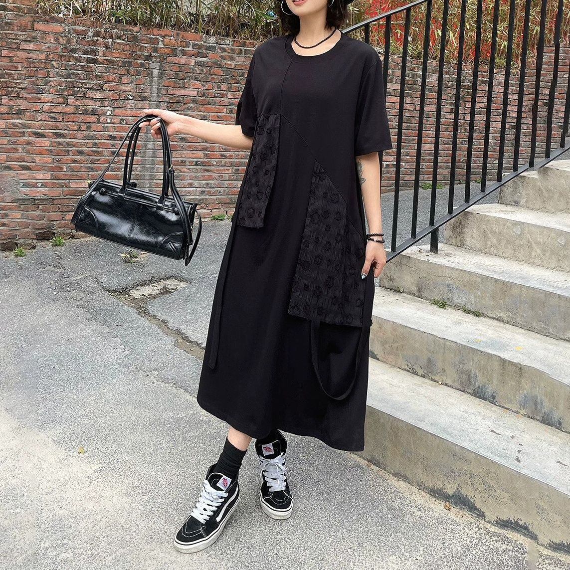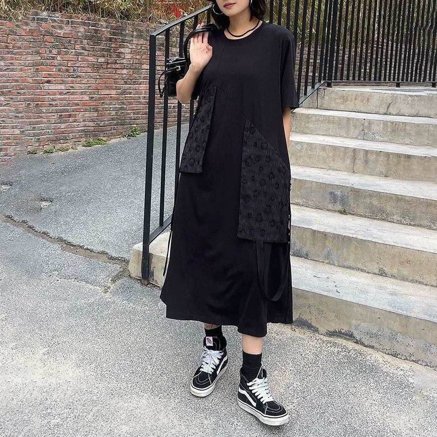 BLACK FLAP DESIGN ROUND NECK LONG T-SHIRT DRESS 1color M-16255