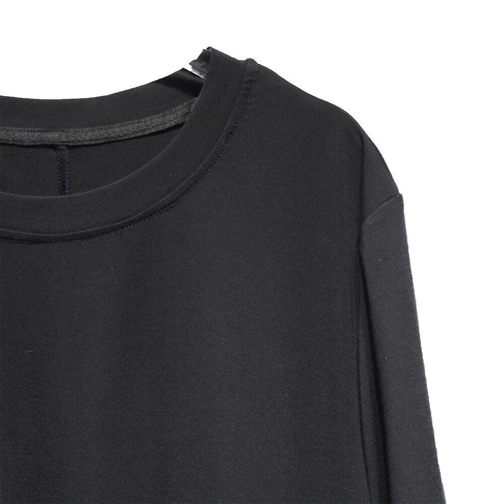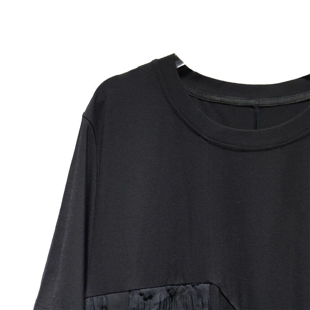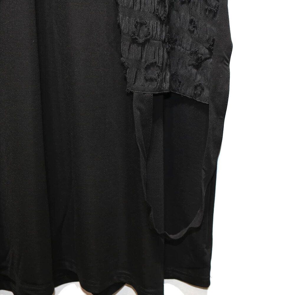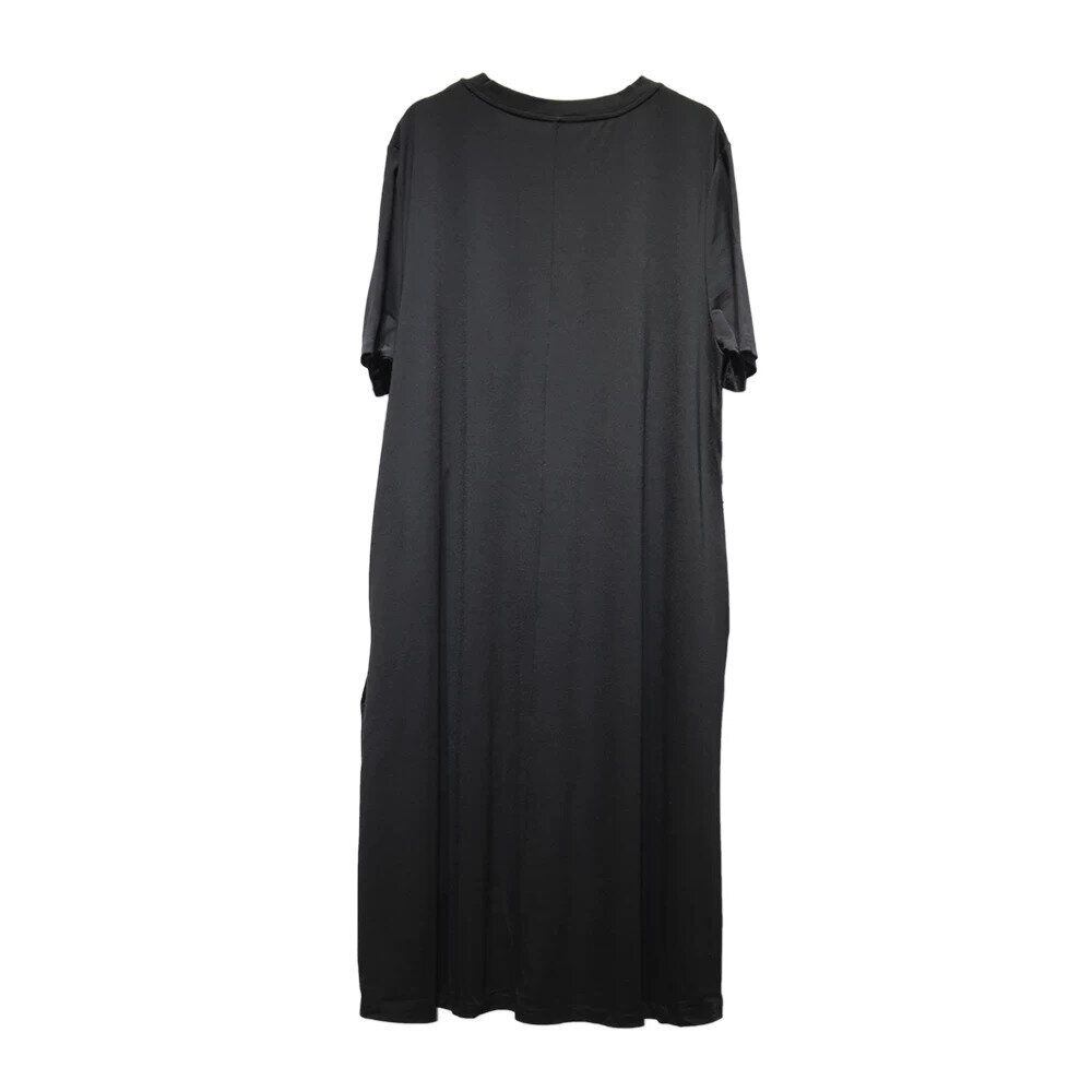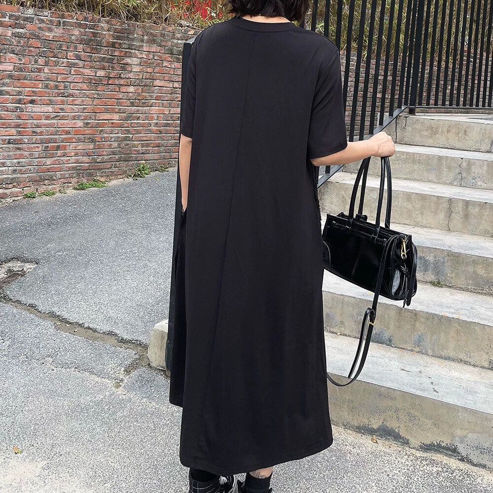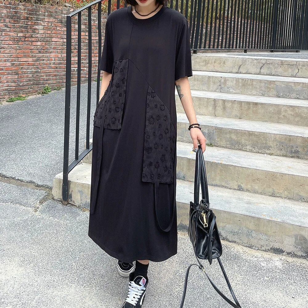 BLACK FLAP DESIGN ROUND NECK LONG T-SHIRT DRESS 1color M-16255