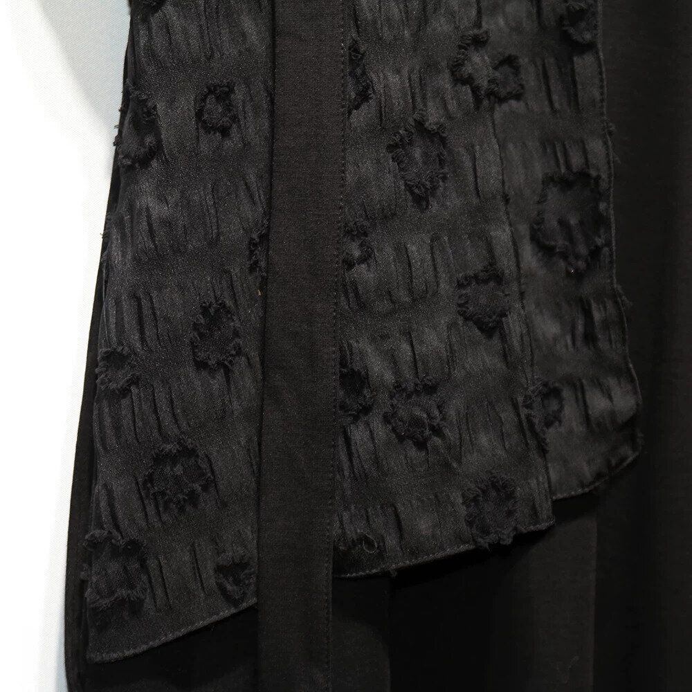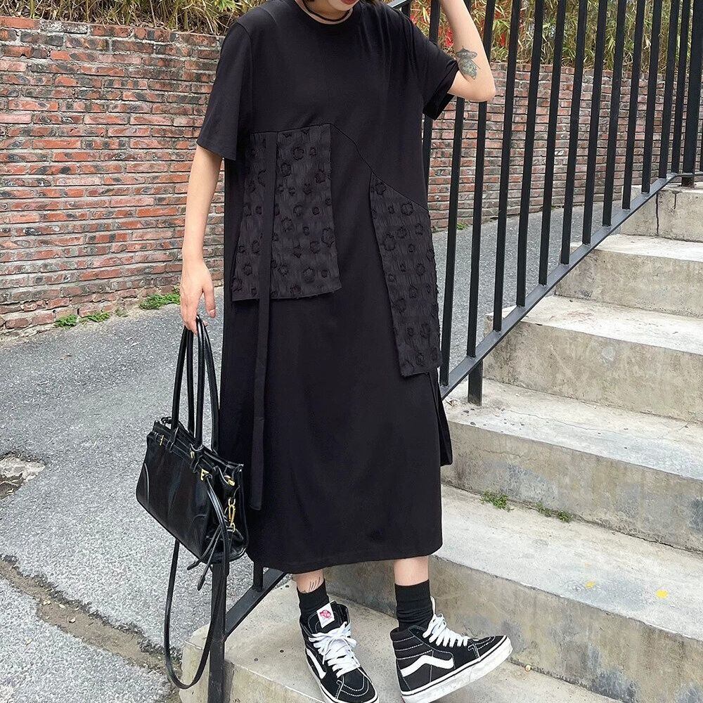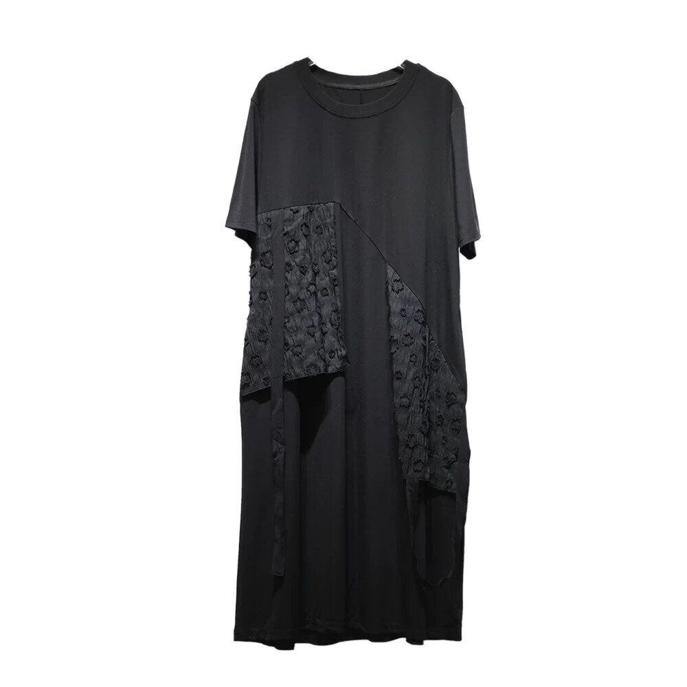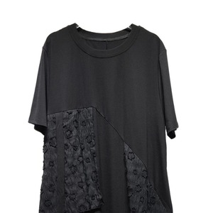 アシンメトリックにあしらわれた立体柄のフラップ飾りがお洒落な、ラウンドネック・膝下丈のTシャツワンピースです。ゆったりとしたAラインのシルエットで着心地の良い、ブラックの単色がクールなカジュアルアイテムです。