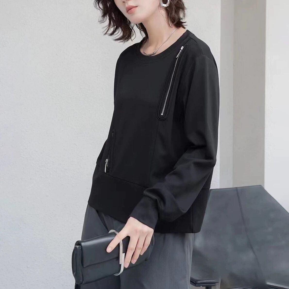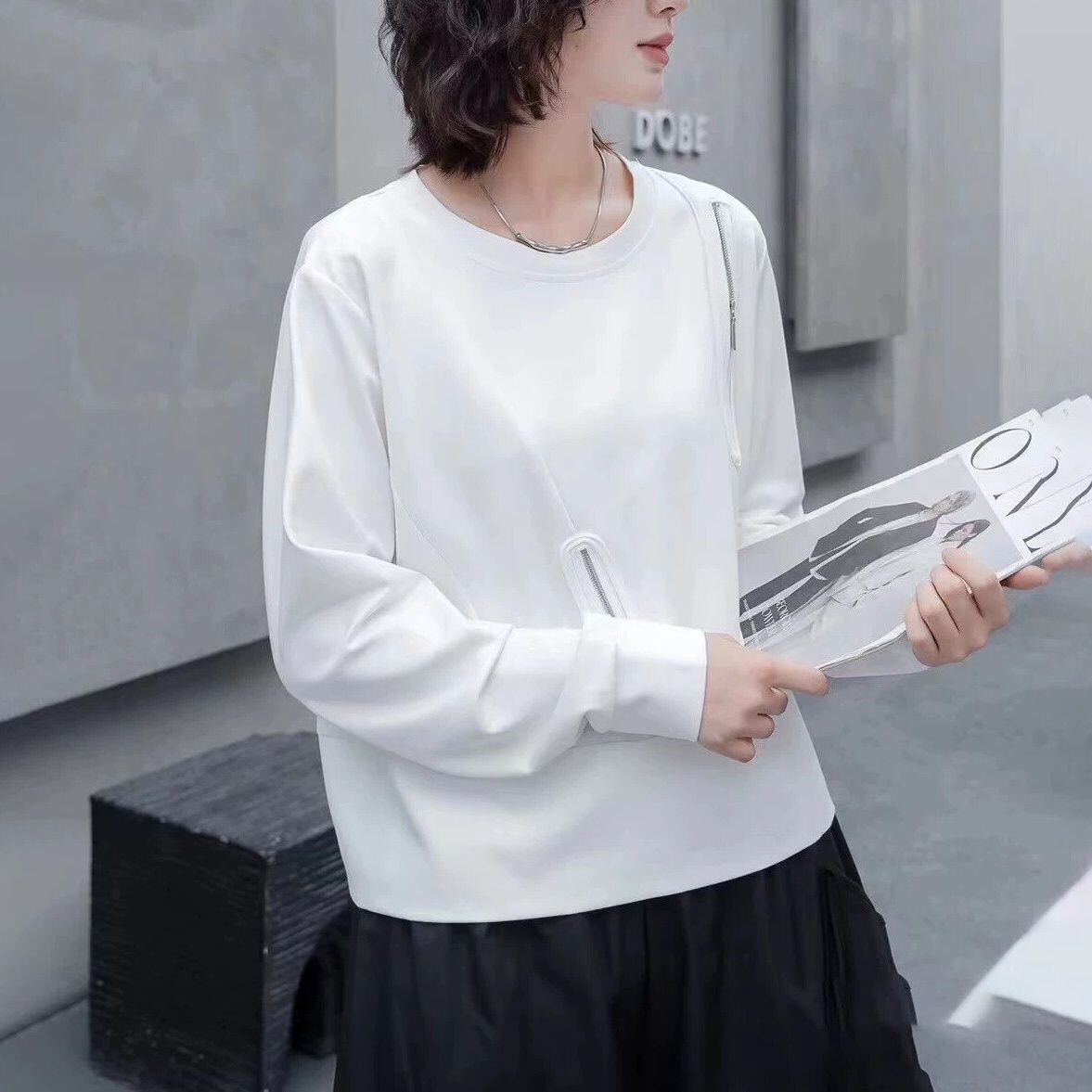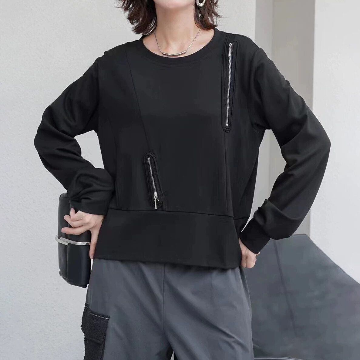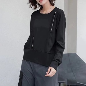 ランダムにあしらわれたジップ飾りがクールな、ラウンドネックのスウェットシャツです。単色のシンプルなデザインで何にでも合わせやすい、着心地の良いカジュアルアイテムです。色は2色から選べます。