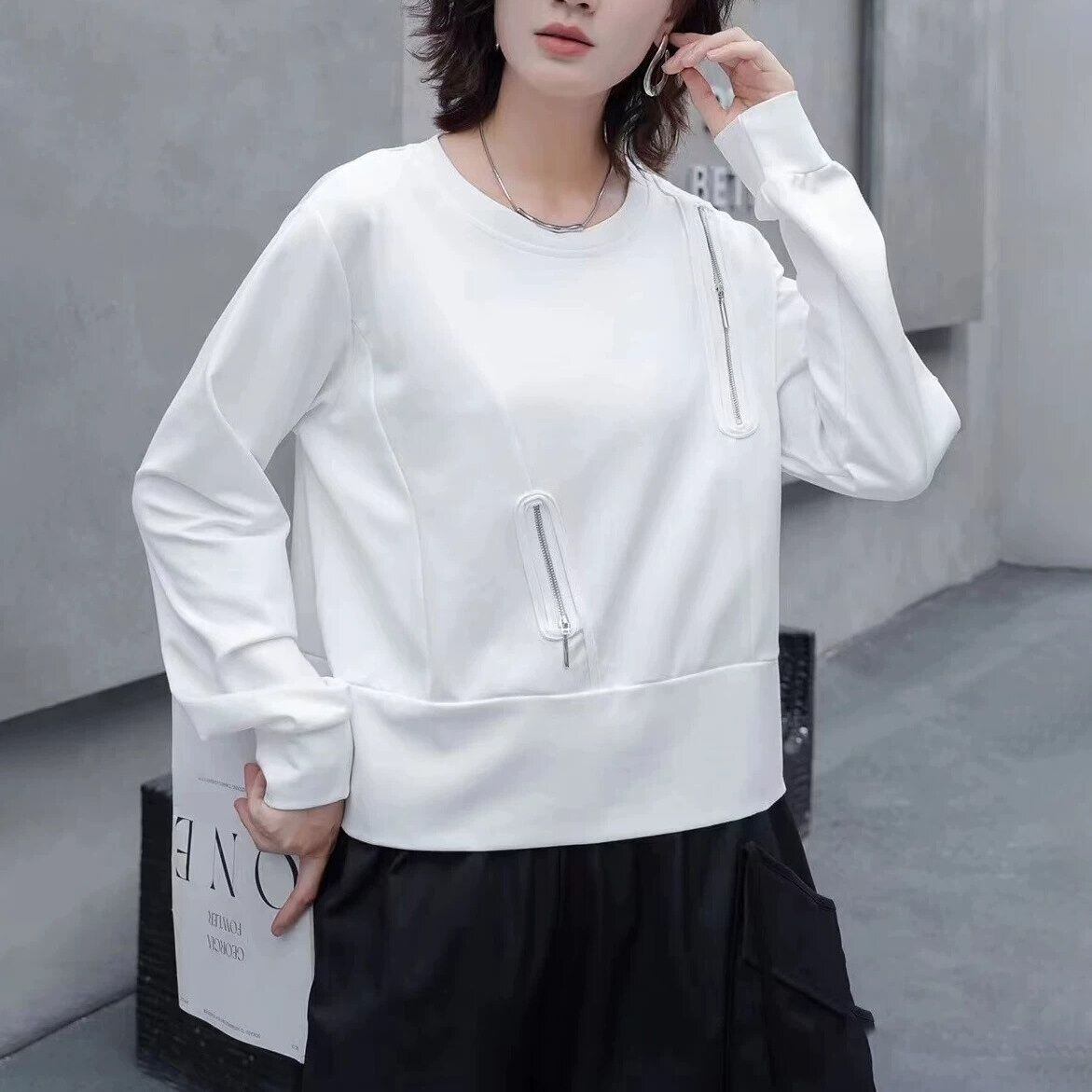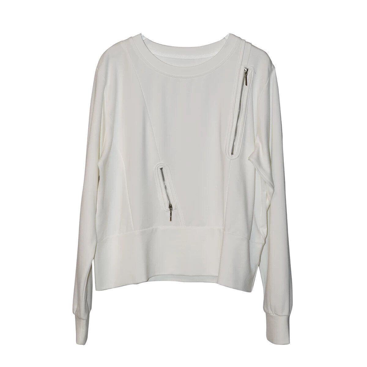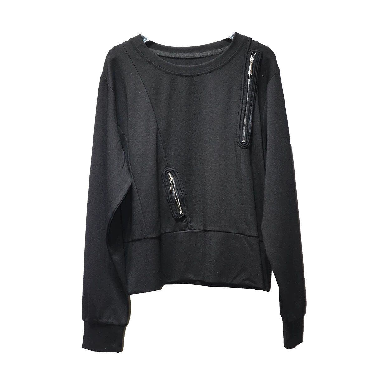 ランダムにあしらわれたジップ飾りがクールな、ラウンドネックのスウェットシャツです。単色のシンプルなデザインで何にでも合わせやすい、着心地の良いカジュアルアイテムです。色は2色から選べます。