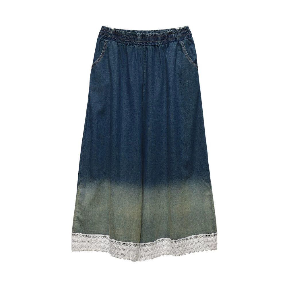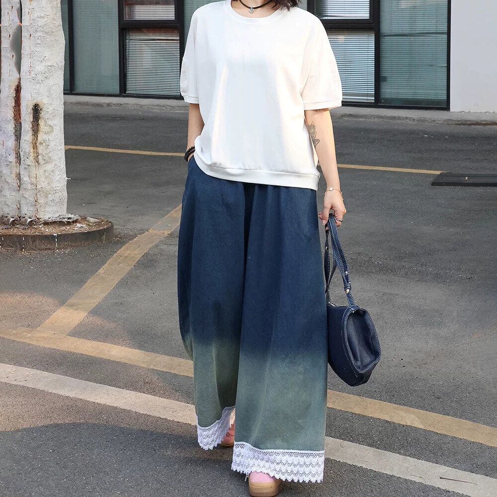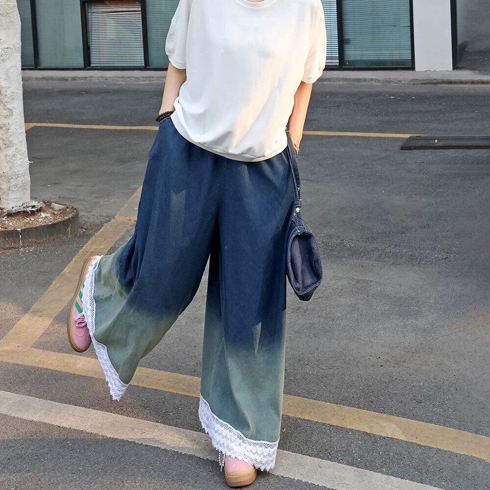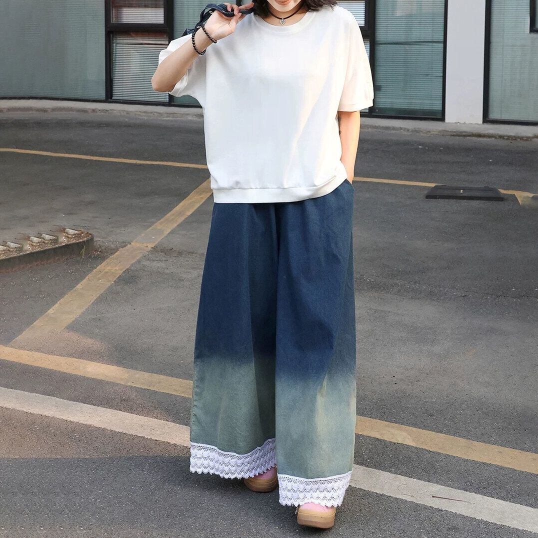 グラデーションや裾のレースがお洒落な、ワイドレッグ・デニムパンツです。ウエストはゴムなので、着脱が簡単で履き心地が良いです。ロングスカートのようなAラインのシルエットが魅力的なアイテムです。色は2色から選べます。